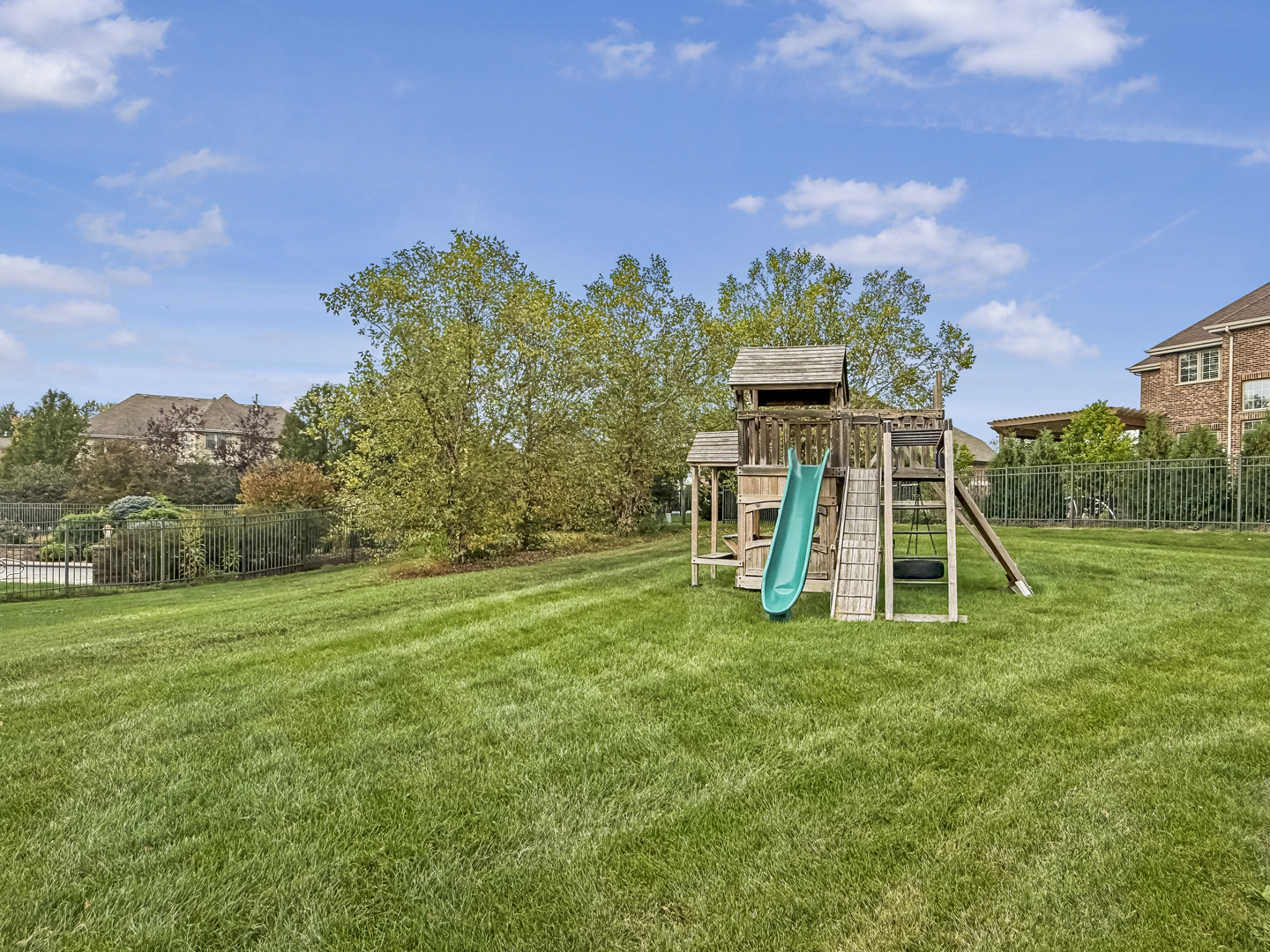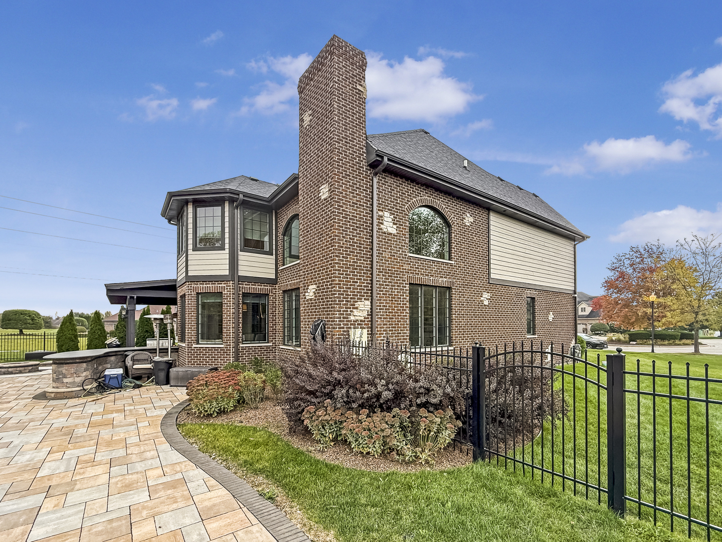 Meet your next luxury home in Frankfort, IL! This stunning property offers 5 full bedrooms and 5 full bathrooms across 3 levels of beautifully finished living space. The grand foyer welcomes you with full hardwood floors throughout. The living room features soaring 25-foot ceilings and a cozy fireplace. The open-concept kitchen includes 42″ shaker cabinets, quartz countertops with matching backsplash, and Bosch stainless steel appliances. The first floor offers a formal living room, dining room, den, breakfast area, and an additional bonus room-perfect for guests or a lounge. The second floor showcases new hardwood flooring with 4 spacious bedrooms, including two en-suite rooms. The primary suite features a built-in bar area, a luxurious spa-style bathroom with marble-top vanities, a standalone tub, enclosed toilet, and a generous walk-in closet. The finished basement is designed for entertainment, complete with a wet bar, glass wine room, fitness room, and a stone electric fireplace in the theater area. Step outside to your private oasis featuring a full in-ground pool with a cascading waterfall, custom stone paver patio, outdoor bar, and a fully enclosed iron fence with brick pillars. A children’s playset and a full water sprinkler system installed in the front and back of the home complete this impressive backyard retreat. Better than new construction-this home offers high-end upgrades and thoughtful details throughout. Conveniently located near retail and dining along LaGrange Road and part of the highly rated Frankfort School District 157C and Lincoln-Way East High School District 210.
