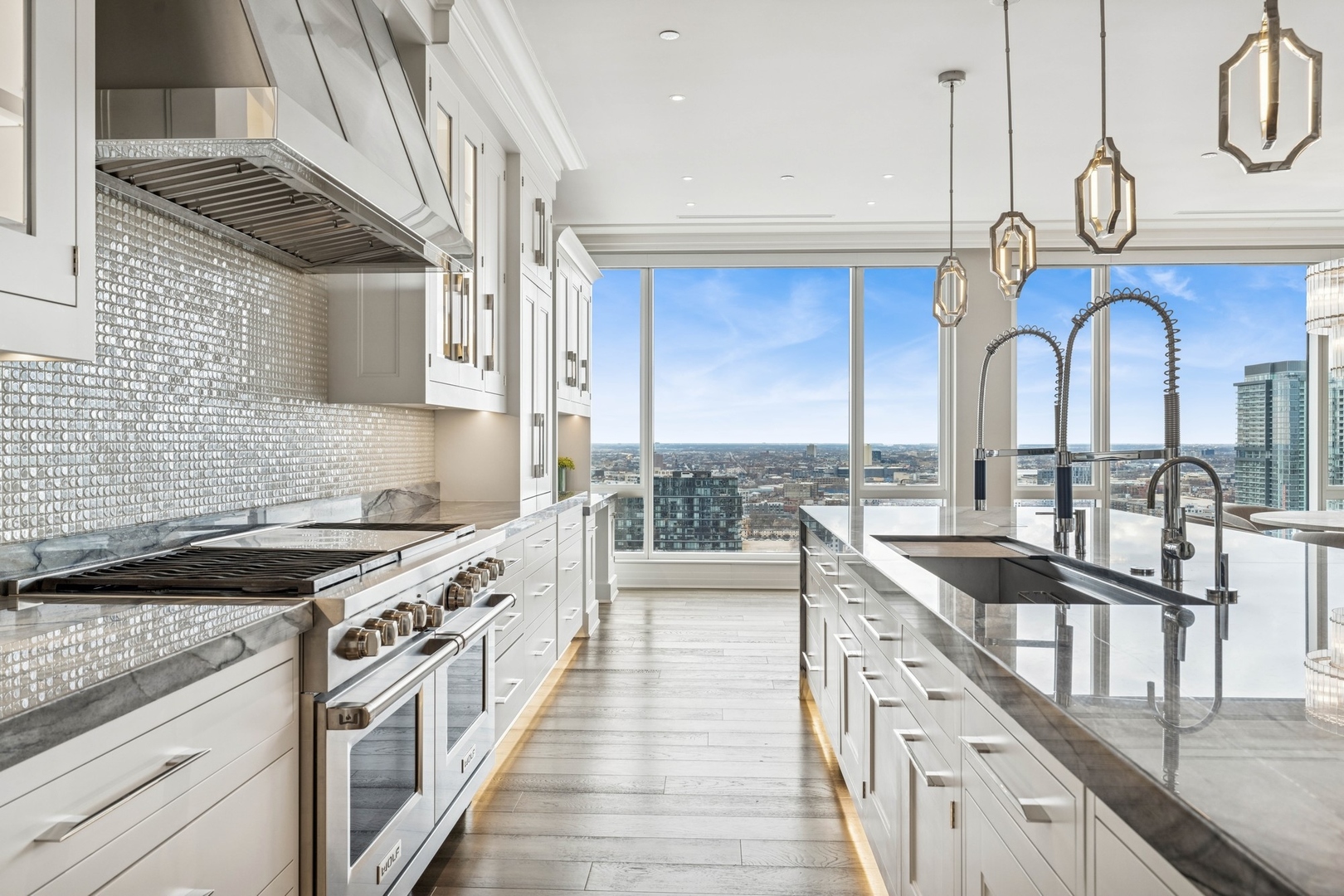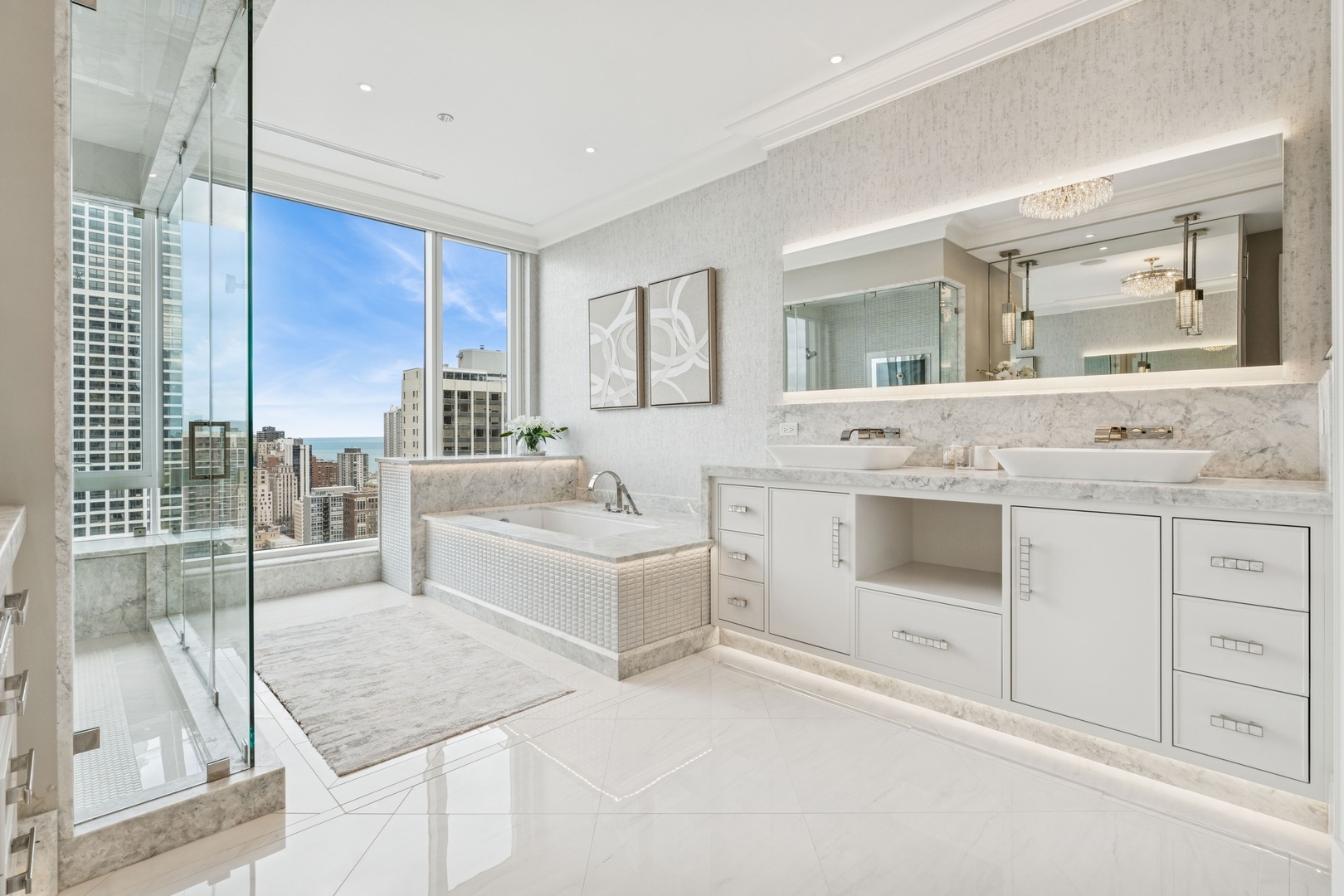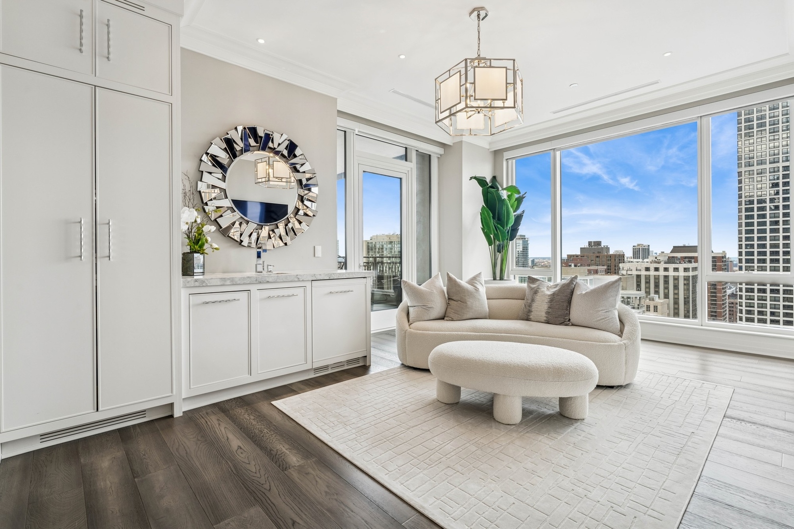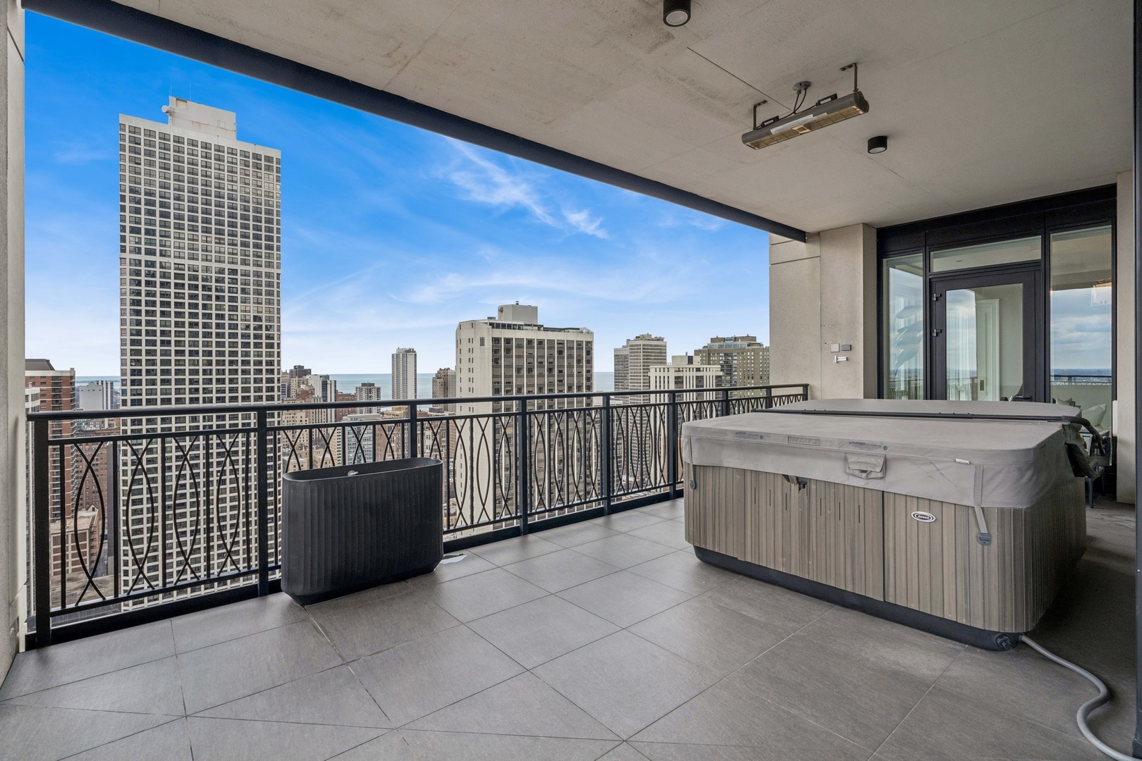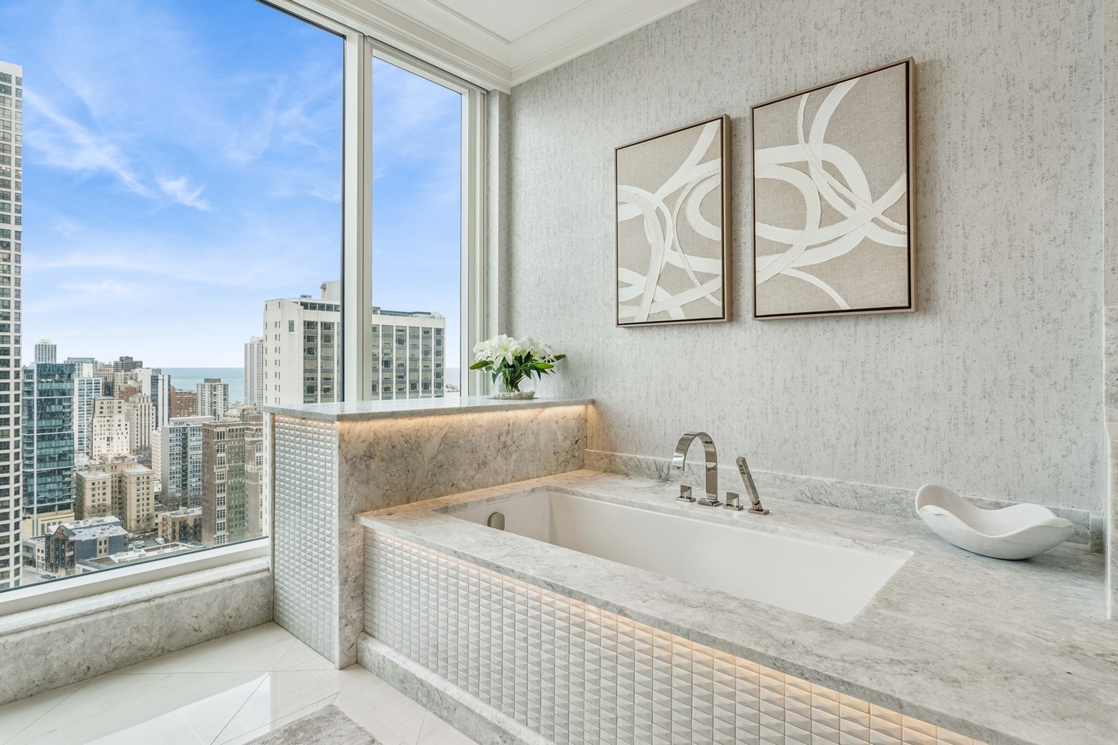 Experience the pinnacle of luxury living at the highly coveted 9 W. Walton in Chicago’s prestigious Gold Coast. Residence 2802 is an exquisite half-floor home spanning 4,500 sq. ft., complemented by an expansive 750 sq. ft. wrap-around terrace featuring a hot tub and overhead heaters for year-round enjoyment. This meticulously upgraded 3-bedroom + office/den, 3 1/2 bathroom home offers unparalleled craftsmanship, cutting-edge automation, and premium finishes throughout.The state-of-the-art kitchen is equipped with a Wolf 60″ range, dual full-size ovens, a steam oven, warming drawer and a built-in Wolf coffee maker. Two full-size Gaggenau refrigerators/freezers, two Miele dishwashers, and The Galley sink with dual faucets ensure effortless entertaining. The 14′ waterfall island, adorned with Azul Imperial Quartzite, is both a statement piece and a functional hub, complete with pop-up outlets and custom O’Brien Harris cabinetry. The living room is anchored by a 60 inch linear ventless fireplace framed in Iceland bookmatched porcelain. Custom millwork and shelving by O’Brien Harris seamlessly integrate a tall wine refrigerator, Sub-zero beverage refrigerator, and a silver hammered bar sink with an ice maker, all set against underlit Iceberg quartzite countertops. Escape to the opulent primary suite, which includes a large sitting room/office/den outfitted with closets, a built-in bar, Miele coffee maker, and a Sub-Zero beverage refrigerator. The massive walk-in closet provides generous storage, while the spa-like primary bathroom indulges with an oversized dual shower with a TV, steam, body sprays, and a rain shower, a custom bathtub with a pop-up TV lift and built-in champagne bucket, and a separate water closet with a Toto Washlet toilet. Luxurious Princess White Quartzite counters, a towel-warming drawer, custom cabinetry and large windows complete this serene retreat.Additional features include heated stone hallways with inlaid runners, heated bathroom floors throughout, a large laundry room with custom cabinetry and sink, and fully updated Control4 automation for lighting, shades, and sound. This exceptional residence includes two valet parking spaces and a storage unit. Residents of No. 9 Walton enjoy unparalleled five-star amenities, including a multi-level fitness center, an indoor pool, a steam room, and a sauna. For recreation and entertainment, the building features a golf simulator and an elegant hospitality room with a bar, catering kitchen and an expansive terrace. Additional luxuries include two well-appointed guest suites, a house car service, 24-hour white-glove door staff, and onsite professional management.