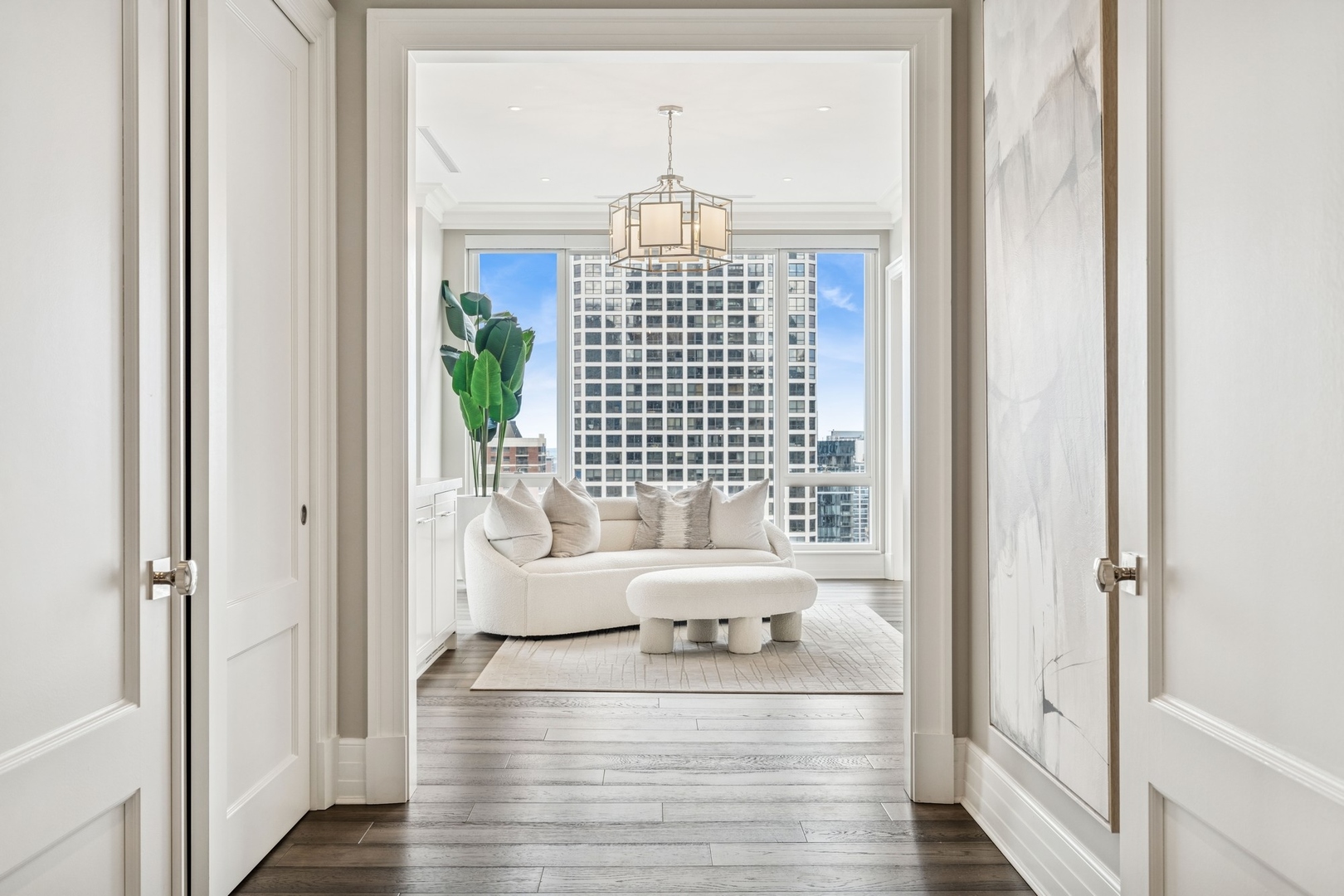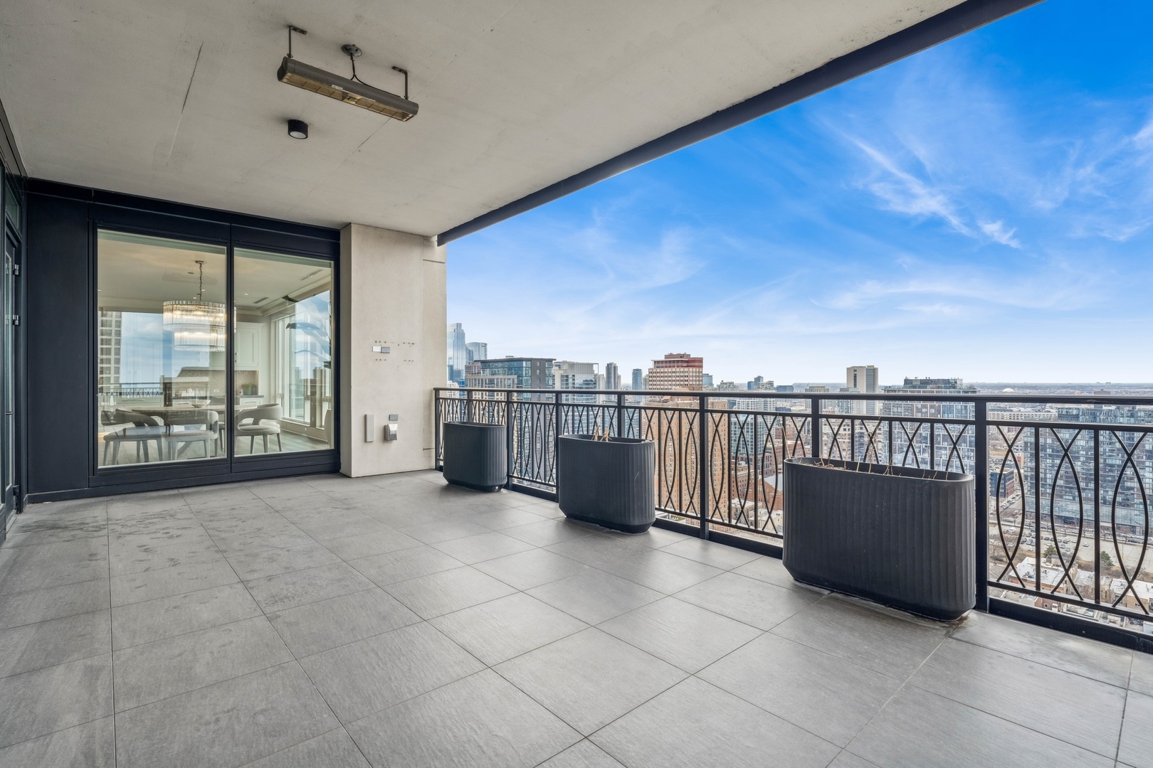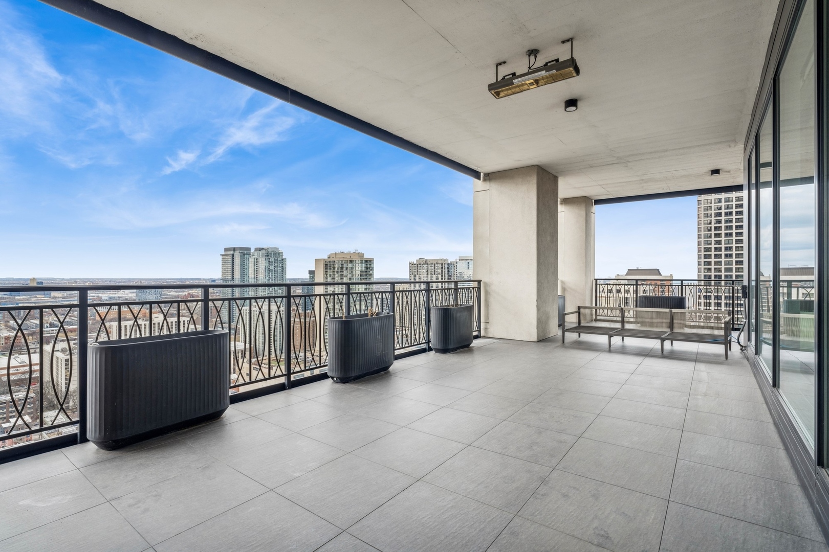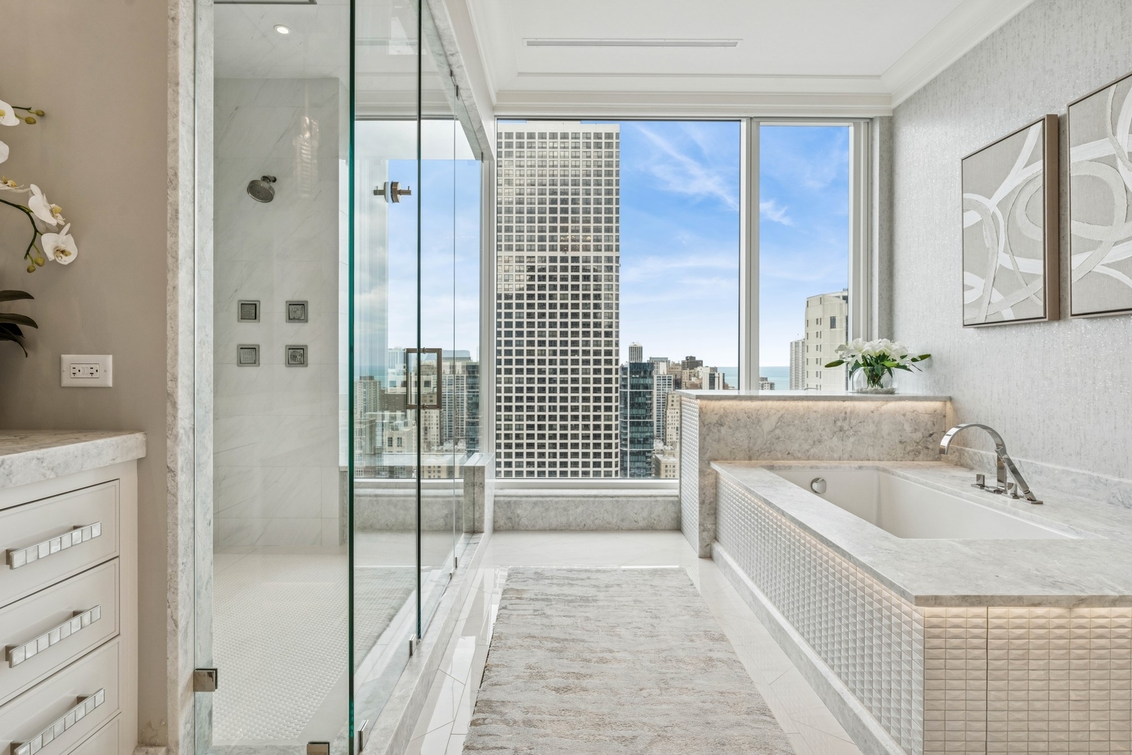 Experience the pinnacle of luxury living at the highly coveted 9 W. Walton in Chicago’s prestigious Gold Coast. Residence 2802 is an exquisite half-floor home spanning 4,500 sq. ft., complemented by an expansive 750 sq. ft. wrap-around terrace featuring a hot tub and overhead heaters for year-round enjoyment. This meticulously upgraded 3-bedroom + office/den, 3 1/2 bathroom home offers unparalleled craftsmanship, cutting-edge automation, and premium finishes throughout.The state-of-the-art kitchen is equipped with a Wolf 60″ range, dual full-size ovens, a steam oven, warming drawer and a built-in Wolf coffee maker. Two full-size Gaggenau refrigerators/freezers, two Miele dishwashers, and The Galley sink with dual faucets ensure effortless entertaining. The 14′ waterfall island, adorned with Azul Imperial Quartzite, is both a statement piece and a functional hub, complete with pop-up outlets and custom O’Brien Harris cabinetry. The living room is anchored by a 60 inch linear ventless fireplace framed in Iceland bookmatched porcelain. Custom millwork and shelving by O’Brien Harris seamlessly integrate a tall wine refrigerator, Sub-zero beverage refrigerator, and a silver hammered bar sink with an ice maker, all set against underlit Iceberg quartzite countertops. Escape to the opulent primary suite, which includes a large sitting room/office/den outfitted with closets, a built-in bar, Miele coffee maker, and a Sub-Zero beverage refrigerator. The massive walk-in closet provides generous storage, while the spa-like primary bathroom indulges with an oversized dual shower with a TV, steam, body sprays, and a rain shower, a custom bathtub with a pop-up TV lift and built-in champagne bucket, and a separate water closet with a Toto Washlet toilet. Luxurious Princess White Quartzite counters, a towel-warming drawer, custom cabinetry and large windows complete this serene retreat.Additional features include heated stone hallways with inlaid runners, heated bathroom floors throughout, a large laundry room with custom cabinetry and sink, and fully updated Control4 automation for lighting, shades, and sound. This exceptional residence includes two valet parking spaces and a storage unit. Residents of No. 9 Walton enjoy unparalleled five-star amenities, including a multi-level fitness center, an indoor pool, a steam room, and a sauna. For recreation and entertainment, the building features a golf simulator and an elegant hospitality room with a bar, catering kitchen and an expansive terrace. Additional luxuries include two well-appointed guest suites, a house car service, 24-hour white-glove door staff, and onsite professional management.
