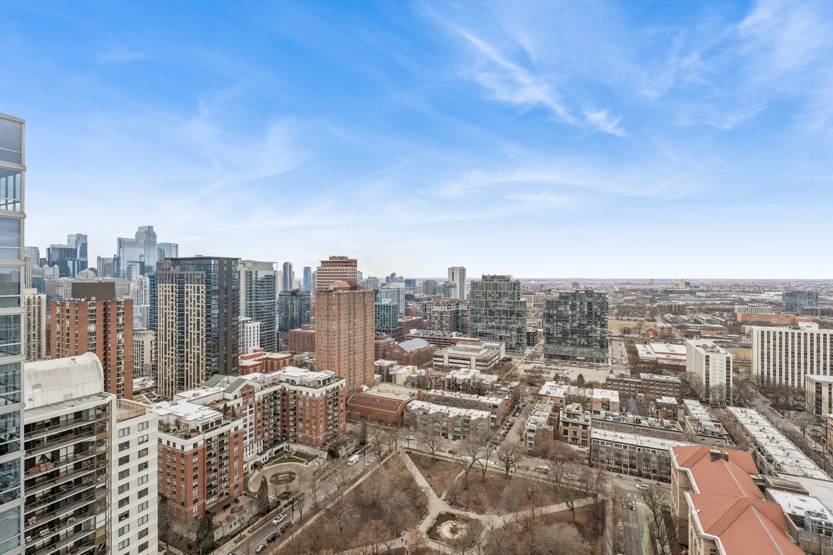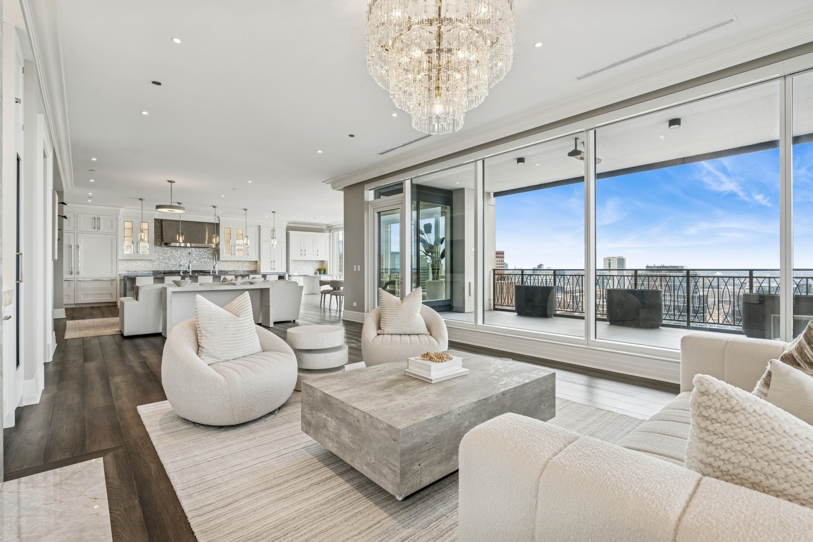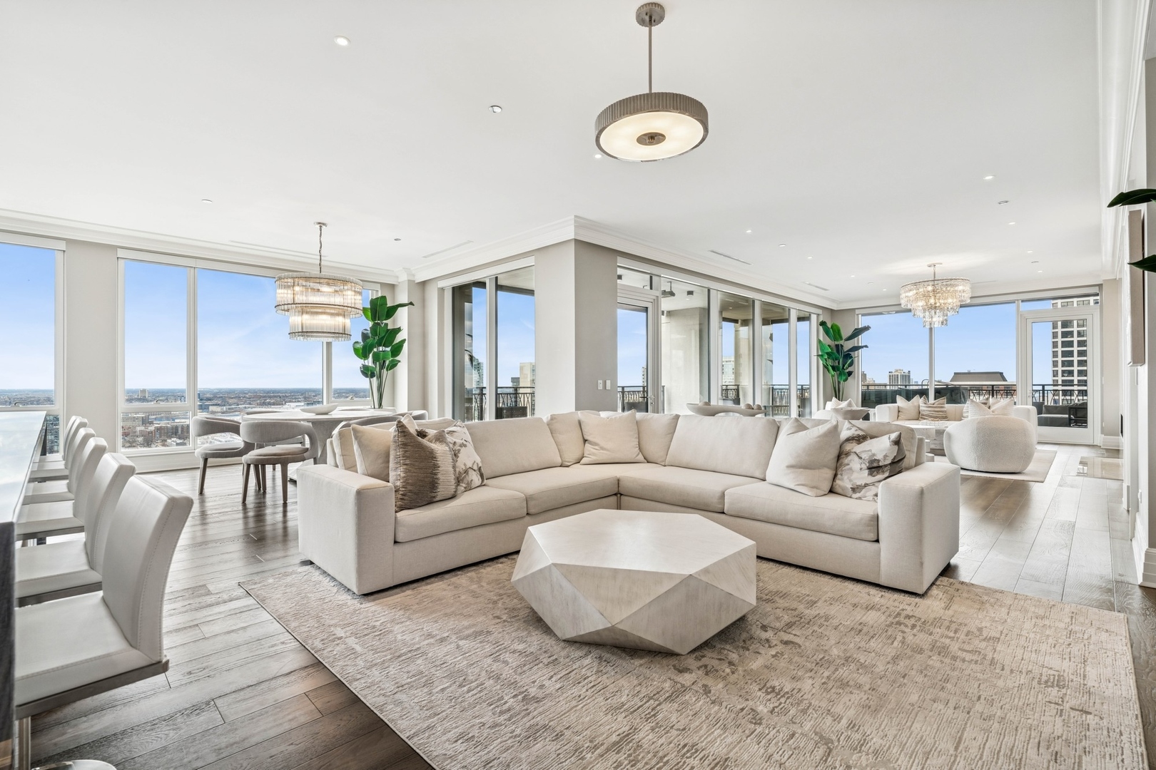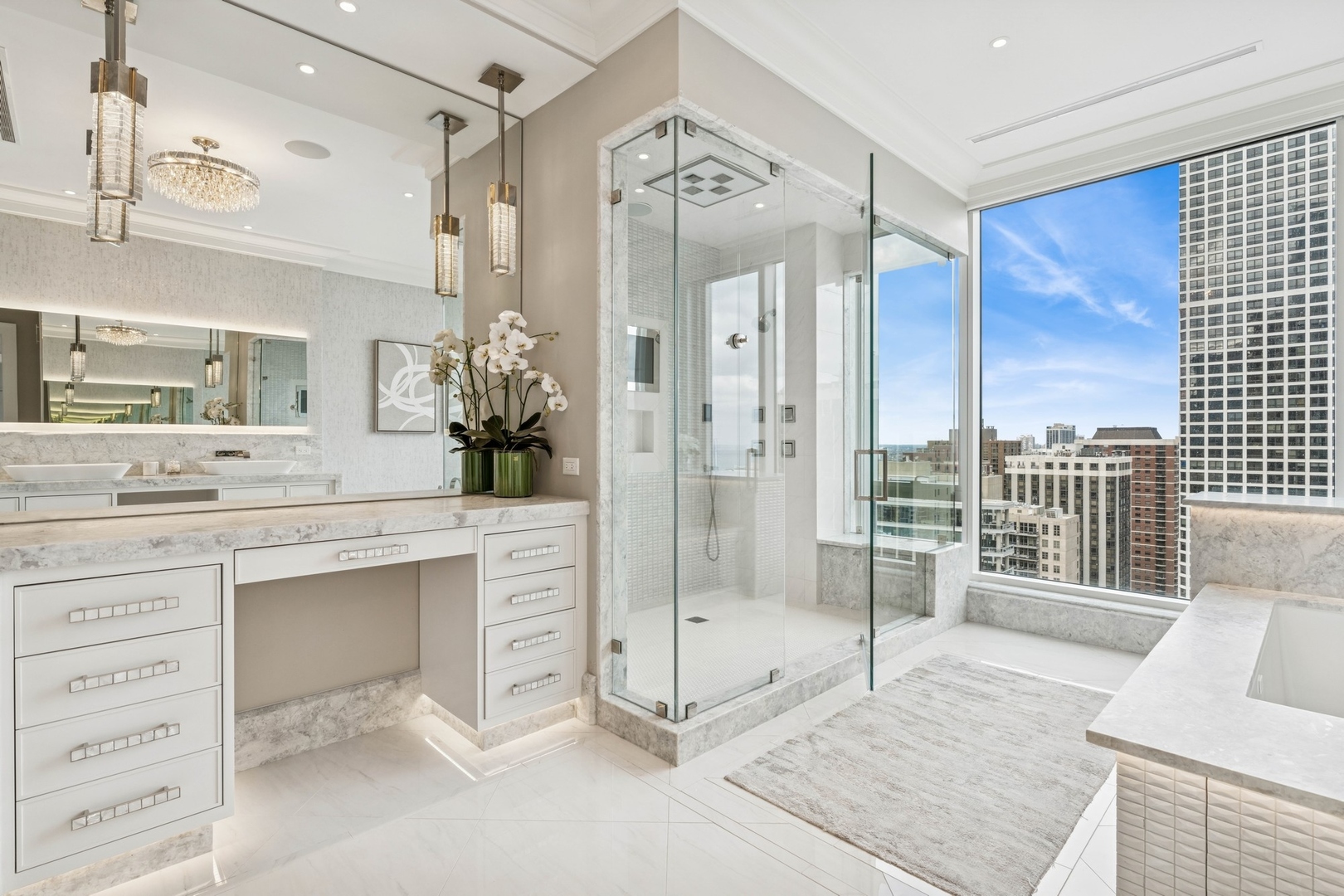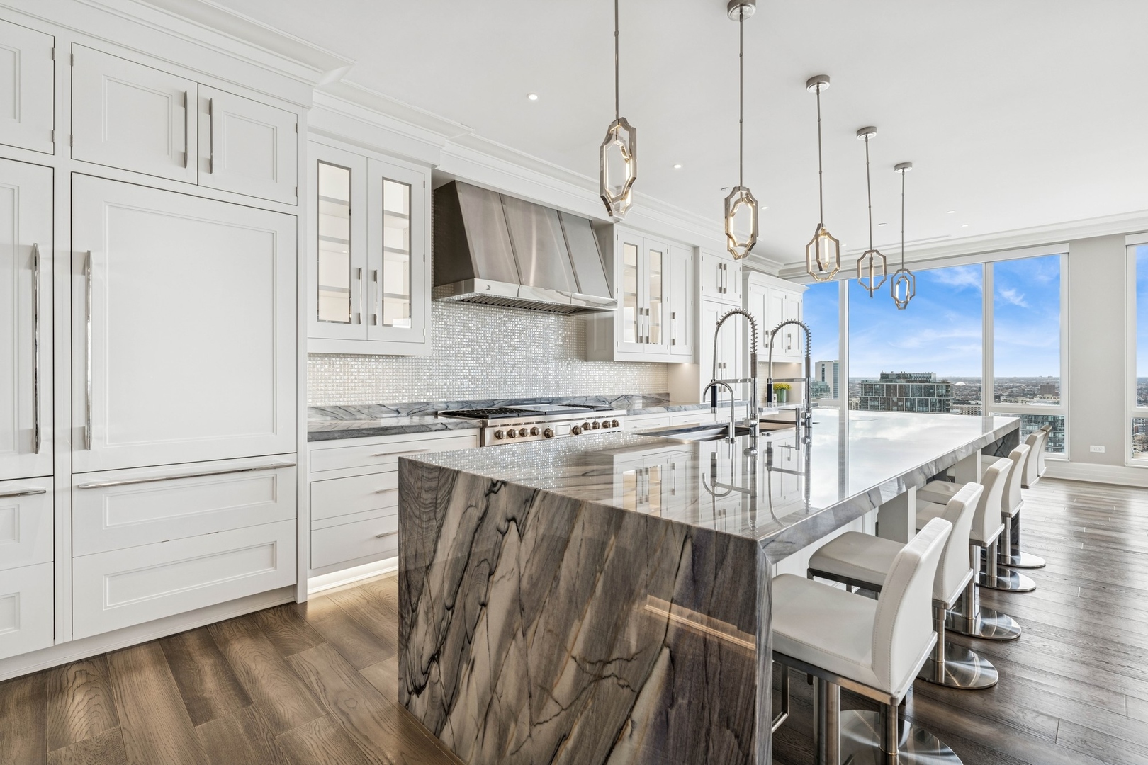 Experience the pinnacle of luxury living at the highly coveted 9 W. Walton in Chicago’s prestigious Gold Coast. Residence 2802 is an exquisite half-floor home spanning 4,500 sq. ft., complemented by an expansive 750 sq. ft. wrap-around terrace featuring a hot tub and overhead heaters for year-round enjoyment. This meticulously upgraded 3-bedroom + office/den, 3 1/2 bathroom home offers unparalleled craftsmanship, cutting-edge automation, and premium finishes throughout.The state-of-the-art kitchen is equipped with a Wolf 60″ range, dual full-size ovens, a steam oven, warming drawer and a built-in Wolf coffee maker. Two full-size Gaggenau refrigerators/freezers, two Miele dishwashers, and The Galley sink with dual faucets ensure effortless entertaining. The 14′ waterfall island, adorned with Azul Imperial Quartzite, is both a statement piece and a functional hub, complete with pop-up outlets and custom O’Brien Harris cabinetry. The living room is anchored by a 60 inch linear ventless fireplace framed in Iceland bookmatched porcelain. Custom millwork and shelving by O’Brien Harris seamlessly integrate a tall wine refrigerator, Sub-zero beverage refrigerator, and a silver hammered bar sink with an ice maker, all set against underlit Iceberg quartzite countertops. Escape to the opulent primary suite, which includes a large sitting room/office/den outfitted with closets, a built-in bar, Miele coffee maker, and a Sub-Zero beverage refrigerator. The massive walk-in closet provides generous storage, while the spa-like primary bathroom indulges with an oversized dual shower with a TV, steam, body sprays, and a rain shower, a custom bathtub with a pop-up TV lift and built-in champagne bucket, and a separate water closet with a Toto Washlet toilet. Luxurious Princess White Quartzite counters, a towel-warming drawer, custom cabinetry and large windows complete this serene retreat.Additional features include heated stone hallways with inlaid runners, heated bathroom floors throughout, a large laundry room with custom cabinetry and sink, and fully updated Control4 automation for lighting, shades, and sound. This exceptional residence includes two valet parking spaces and a storage unit. Residents of No. 9 Walton enjoy unparalleled five-star amenities, including a multi-level fitness center, an indoor pool, a steam room, and a sauna. For recreation and entertainment, the building features a golf simulator and an elegant hospitality room with a bar, catering kitchen and an expansive terrace. Additional luxuries include two well-appointed guest suites, a house car service, 24-hour white-glove door staff, and onsite professional management.