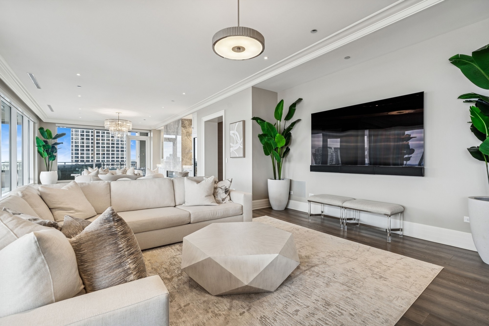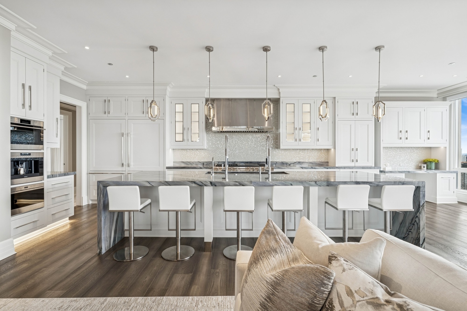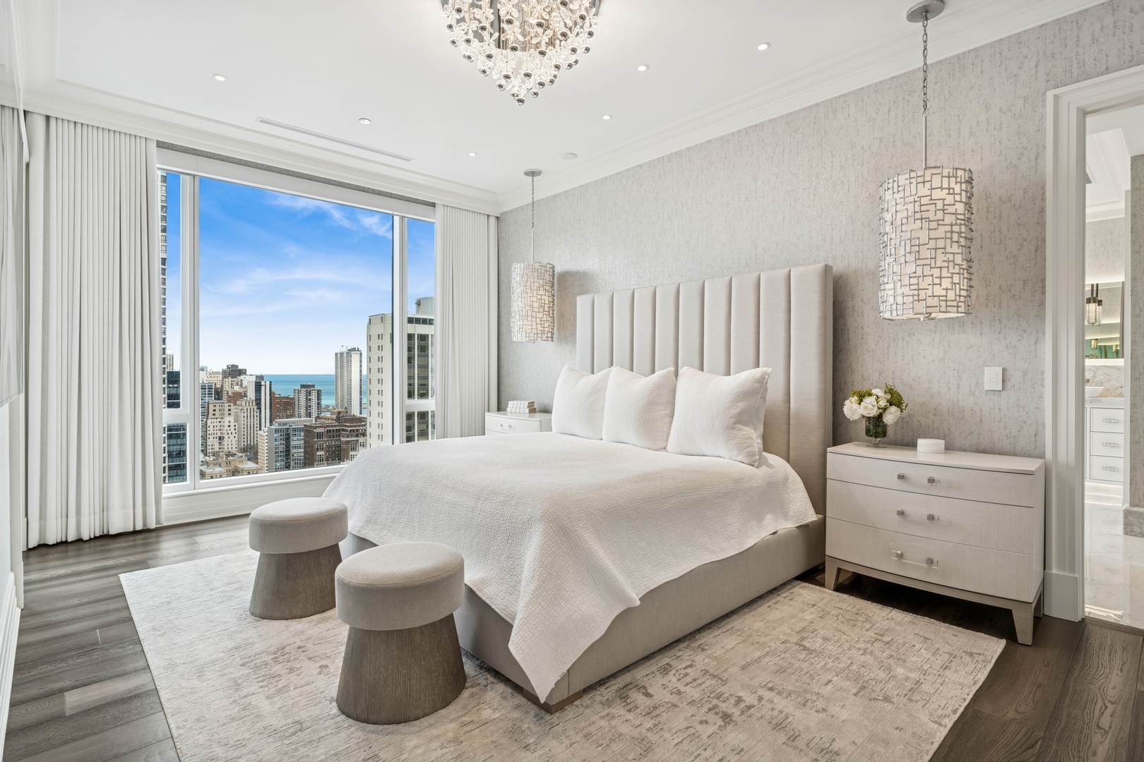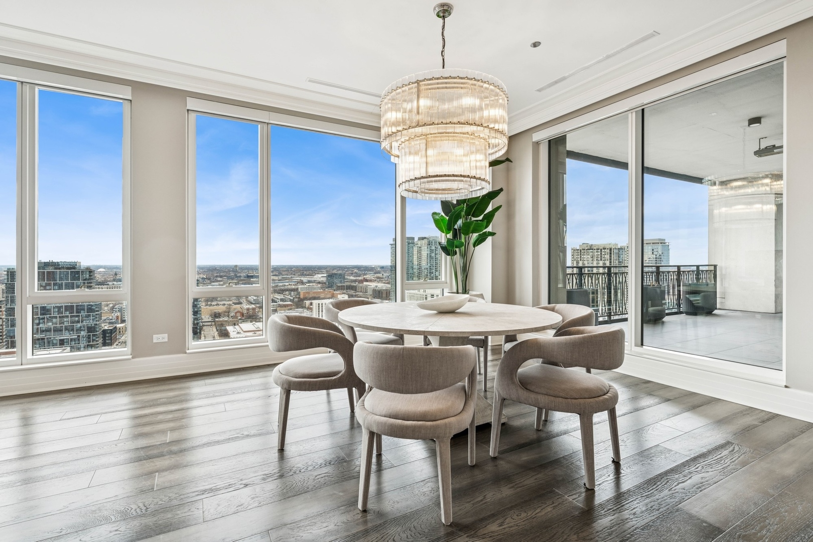 Experience the pinnacle of luxury living at the highly coveted 9 W. Walton in Chicago’s prestigious Gold Coast. Residence 2802 is an exquisite half-floor home spanning 4,500 sq. ft., complemented by an expansive 750 sq. ft. wrap-around terrace featuring a hot tub and overhead heaters for year-round enjoyment. This meticulously upgraded 3-bedroom + office/den, 3 1/2 bathroom home offers unparalleled craftsmanship, cutting-edge automation, and premium finishes throughout.The state-of-the-art kitchen is equipped with a Wolf 60″ range, dual full-size ovens, a steam oven, warming drawer and a built-in Wolf coffee maker. Two full-size Gaggenau refrigerators/freezers, two Miele dishwashers, and The Galley sink with dual faucets ensure effortless entertaining. The 14′ waterfall island, adorned with Azul Imperial Quartzite, is both a statement piece and a functional hub, complete with pop-up outlets and custom O’Brien Harris cabinetry. The living room is anchored by a 60 inch linear ventless fireplace framed in Iceland bookmatched porcelain. Custom millwork and shelving by O’Brien Harris seamlessly integrate a tall wine refrigerator, Sub-zero beverage refrigerator, and a silver hammered bar sink with an ice maker, all set against underlit Iceberg quartzite countertops. Escape to the opulent primary suite, which includes a large sitting room/office/den outfitted with closets, a built-in bar, Miele coffee maker, and a Sub-Zero beverage refrigerator. The massive walk-in closet provides generous storage, while the spa-like primary bathroom indulges with an oversized dual shower with a TV, steam, body sprays, and a rain shower, a custom bathtub with a pop-up TV lift and built-in champagne bucket, and a separate water closet with a Toto Washlet toilet. Luxurious Princess White Quartzite counters, a towel-warming drawer, custom cabinetry and large windows complete this serene retreat.Additional features include heated stone hallways with inlaid runners, heated bathroom floors throughout, a large laundry room with custom cabinetry and sink, and fully updated Control4 automation for lighting, shades, and sound. This exceptional residence includes two valet parking spaces and a storage unit. Residents of No. 9 Walton enjoy unparalleled five-star amenities, including a multi-level fitness center, an indoor pool, a steam room, and a sauna. For recreation and entertainment, the building features a golf simulator and an elegant hospitality room with a bar, catering kitchen and an expansive terrace. Additional luxuries include two well-appointed guest suites, a house car service, 24-hour white-glove door staff, and onsite professional management.