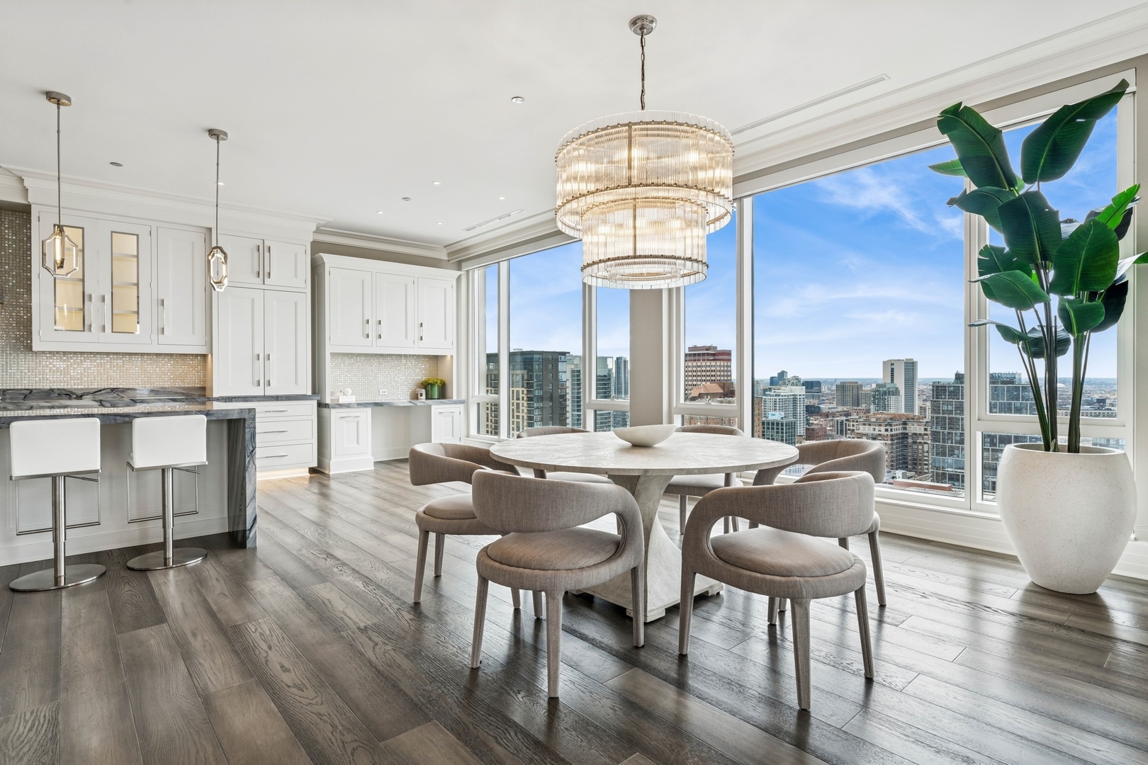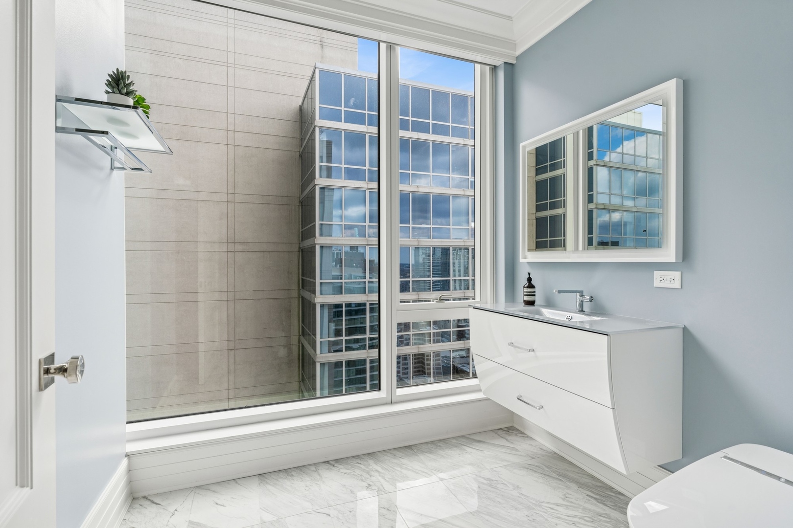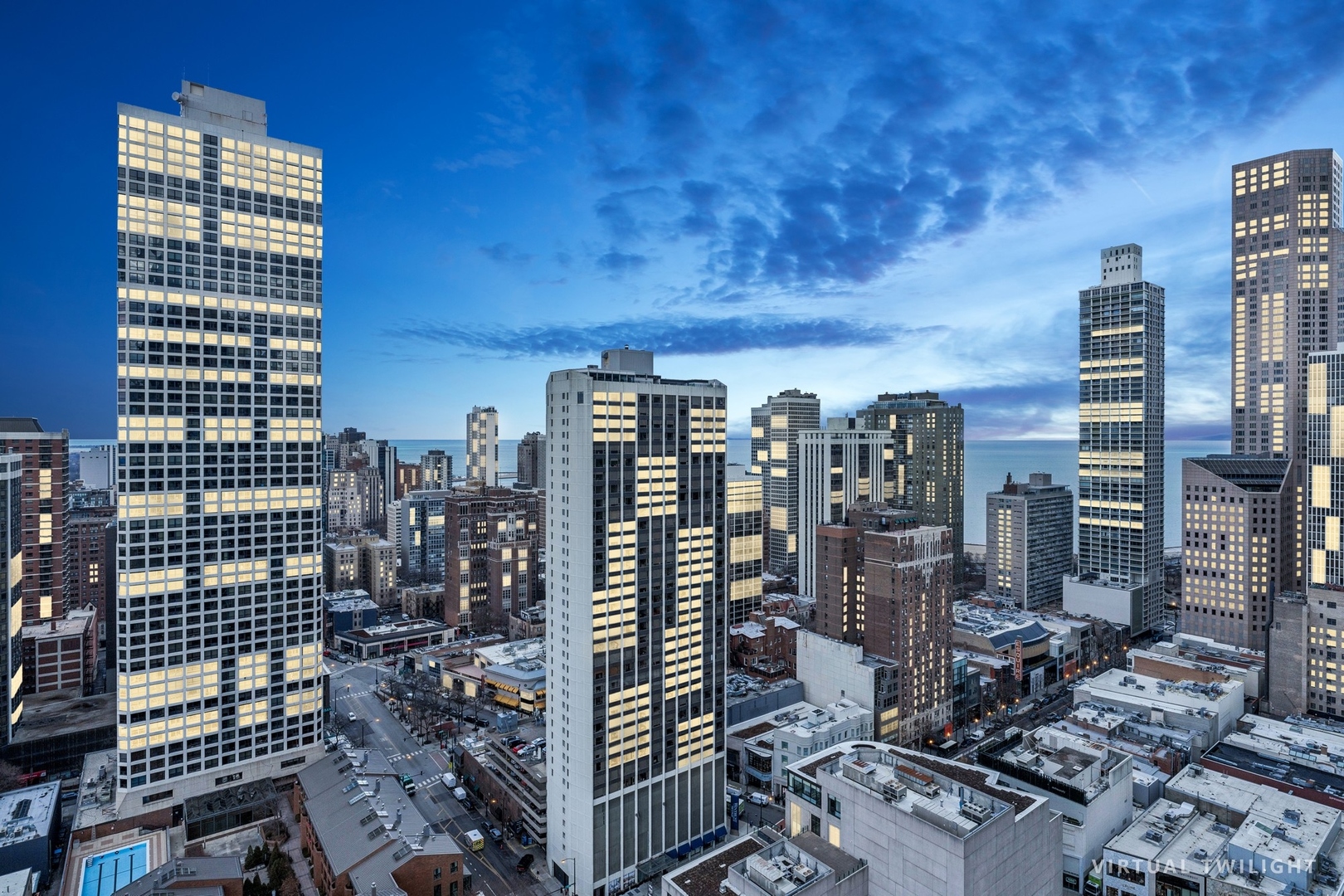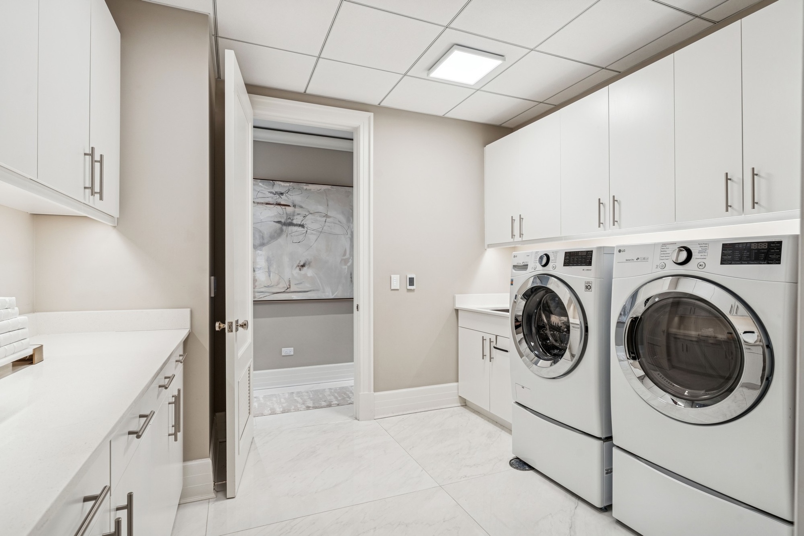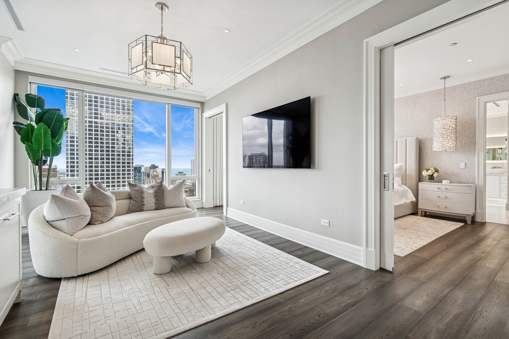 Experience the pinnacle of luxury living at the highly coveted 9 W. Walton in Chicago’s prestigious Gold Coast. Residence 2802 is an exquisite half-floor home spanning 4,500 sq. ft., complemented by an expansive 750 sq. ft. wrap-around terrace featuring a hot tub and overhead heaters for year-round enjoyment. This meticulously upgraded 3-bedroom + office/den, 3 1/2 bathroom home offers unparalleled craftsmanship, cutting-edge automation, and premium finishes throughout.The state-of-the-art kitchen is equipped with a Wolf 60″ range, dual full-size ovens, a steam oven, warming drawer and a built-in Wolf coffee maker. Two full-size Gaggenau refrigerators/freezers, two Miele dishwashers, and The Galley sink with dual faucets ensure effortless entertaining. The 14′ waterfall island, adorned with Azul Imperial Quartzite, is both a statement piece and a functional hub, complete with pop-up outlets and custom O’Brien Harris cabinetry. The living room is anchored by a 60 inch linear ventless fireplace framed in Iceland bookmatched porcelain. Custom millwork and shelving by O’Brien Harris seamlessly integrate a tall wine refrigerator, Sub-zero beverage refrigerator, and a silver hammered bar sink with an ice maker, all set against underlit Iceberg quartzite countertops. Escape to the opulent primary suite, which includes a large sitting room/office/den outfitted with closets, a built-in bar, Miele coffee maker, and a Sub-Zero beverage refrigerator. The massive walk-in closet provides generous storage, while the spa-like primary bathroom indulges with an oversized dual shower with a TV, steam, body sprays, and a rain shower, a custom bathtub with a pop-up TV lift and built-in champagne bucket, and a separate water closet with a Toto Washlet toilet. Luxurious Princess White Quartzite counters, a towel-warming drawer, custom cabinetry and large windows complete this serene retreat.Additional features include heated stone hallways with inlaid runners, heated bathroom floors throughout, a large laundry room with custom cabinetry and sink, and fully updated Control4 automation for lighting, shades, and sound. This exceptional residence includes two valet parking spaces and a storage unit. Residents of No. 9 Walton enjoy unparalleled five-star amenities, including a multi-level fitness center, an indoor pool, a steam room, and a sauna. For recreation and entertainment, the building features a golf simulator and an elegant hospitality room with a bar, catering kitchen and an expansive terrace. Additional luxuries include two well-appointed guest suites, a house car service, 24-hour white-glove door staff, and onsite professional management.