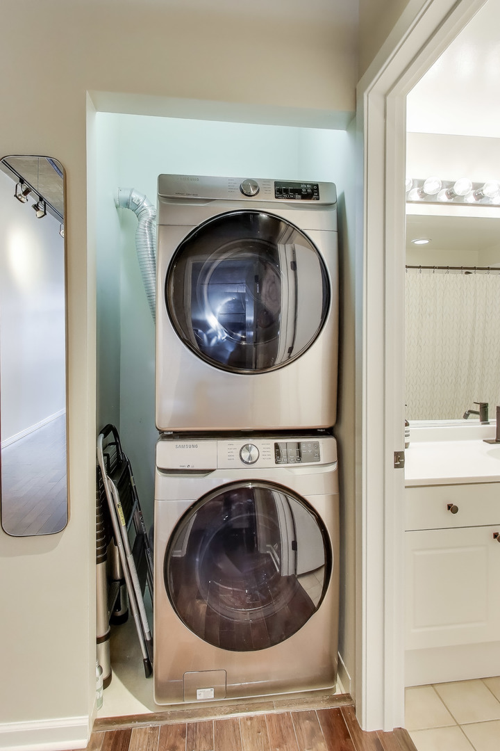 A rare opportunity to own the largest one-bedroom layout in the Domain. This spacious home offers plenty of room to set up a true home office and a dining area while still enjoying a comfortable, oversized living space. It also includes more than $15,000 in motorized privacy shades and blackout drapes; bright and airy one moment, fully dark the next. The condo is move-in ready with oak hardwood floors throughout, 12-foot ceilings, and a private balcony perfect for grilling or relaxing. The modern kitchen features a newer Samsung Bespoke refrigerator, stainless appliances, granite counters, and a peninsula with extra storage. The bedroom is generously sized with truly abundant closet space and the in-unit Samsung washer/dryer is newer as well. Beyond the home itself, the renowned Domain Lofts building is a standout. It’s expertly managed, consistently clean and well cared for, and offers a premium four-pipe HVAC system; meaning no aging furnace or condenser to worry about. Amenities include 24-hour door staff, package concierge, on-site maintenance, a fitness center, bike storage, and an impressive rooftop party room and deck with panoramic skyline views. The building is very pet-friendly, with a welcoming atmosphere and easy access to dog parks and scenic walking paths. Located directly on the covered Riverwalk with the River North Marina just down the back steps, this setting feels like a retreat while still being minutes from top dining, shopping, and transit. Heated, secure garage parking is available for $30,000.
