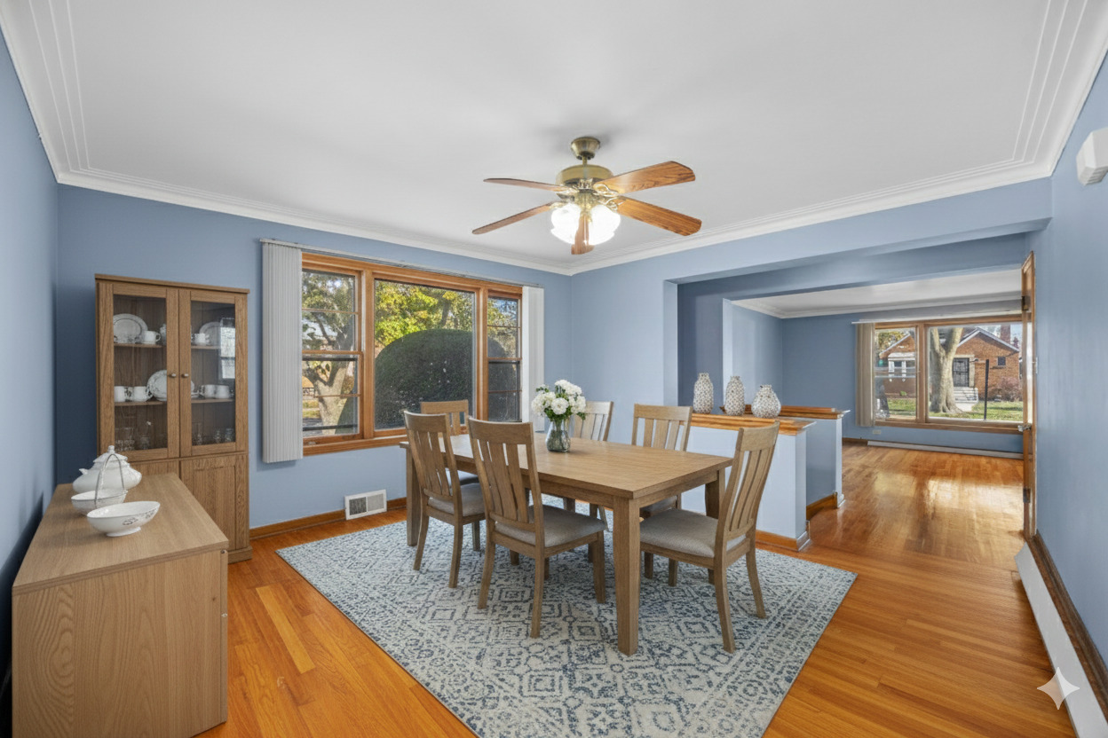 This lovely 3-bedroom, 2.5 bath brick ranch sits on a sunny corner lot and offers the comfort of true one-level living. The hardwood floors, bright living room, and separate dining area create a warm and welcoming flow, and the eat-in kitchen is perfect for everyday meals and good conversation. The spacious finished basement feels like an extension of the home with room for movie nights, a home office, a gym, or gatherings with family and friends. The 2.5 car garage gives you the storage and convenience every homeowner appreciates. The roof was replaced in 2025, giving you lasting peace of mind. Set on a quiet, well-loved block near transit, expressways, parks, and shopping, this home offers a beautiful blend of comfort, convenience, and charm. It is the kind of place where you can settle in, breathe easy, and make lasting memories. Room sizes are estimates.POF are required for all showings.