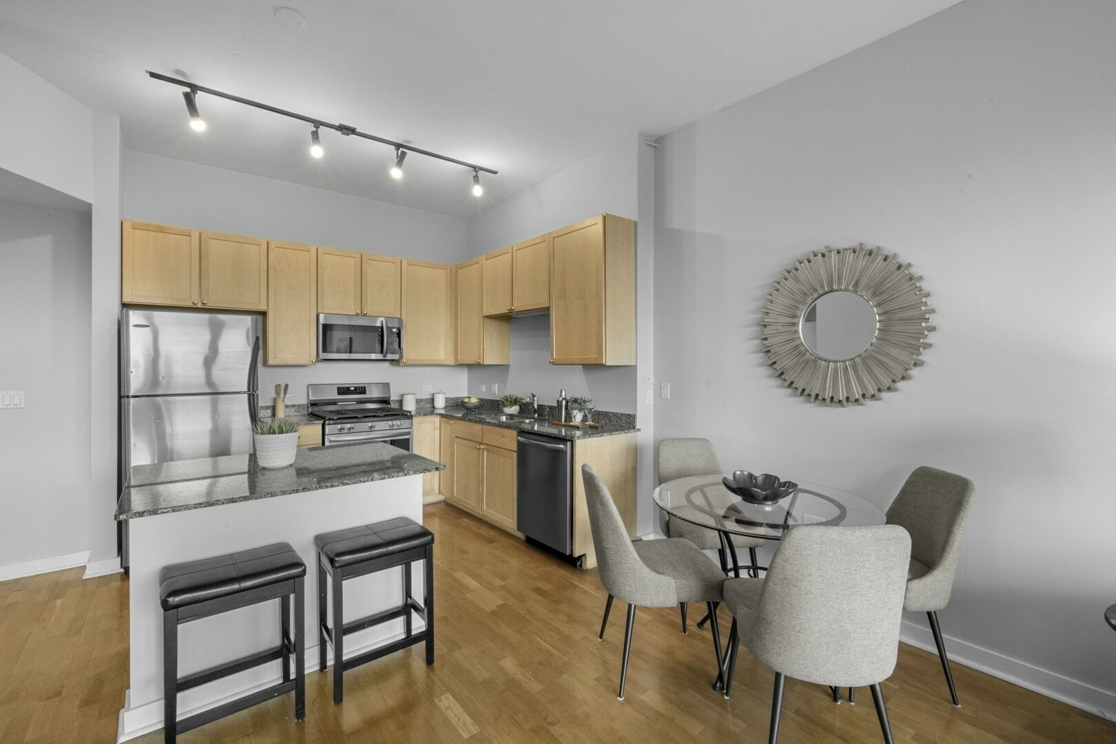 Live in the center of the West Loop in this bright, south-facing 1 bed / 1 bath condo, perfectly positioned for modern city living. The open-concept layout features a spacious kitchen with brand-new stainless steel appliances, granite counters, maple cabinetry and a large island. Floor-to-ceiling windows flood the living and dining area with natural light and lead to a private balcony, your spot for morning coffee or unwinding at sunset. The generous bedroom suite offers excellent closet space and direct access to the dual-entry bathroom. In-unit laundry completes this move-in-ready home. Premier building with secure entry, door staff, fitness center, party room, rooftop sundeck, dog run and 4th floor sundeck. All of West Loop’s best is right outside your door including Madison Street shops, Whole Foods, Mariano’s, Randolph Street’s renowned restaurants, Fulton Market, and Mary Bartelme Park. Deeded garage parking available for purchase.