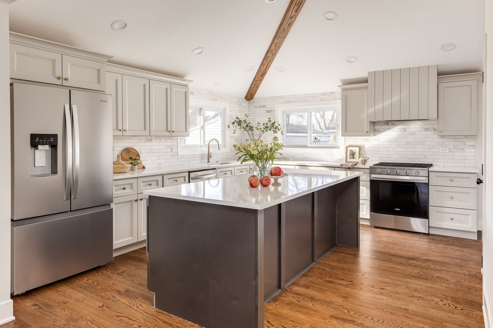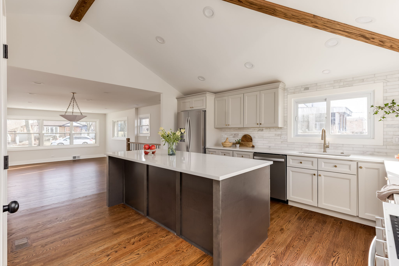 Sophisticated Living in Morton Grove! This professionally designed home was completely reimagined for today’s living. A great open floor plan boasts a large living room, spacious dining room, and beautiful, chef’s kitchen. The kitchen has beautiful, beamed vaulted ceilings, plenty of cabinetry, quartz counters, SS appliances, marble backsplash, and designer plumbing and hardware. The main level has 3 bedrooms and two bathrooms, including a spacious primary suite with a vaulted ceiling, double sinks, stunning shower with upgraded floor to ceiling tile work, and curated plumbing and lighting finishes. The main level also has a mudroom leading to the large back deck, expansive, fully fenced backyard, and an EV ready 2.5 car garage. The lower level is fully finished, featuring a large rec room, additional bedroom, bathroom, and laundry space. The full home was renovated to the highest standard, and does not disappoint. Great location near I-94, within an award winning school district.