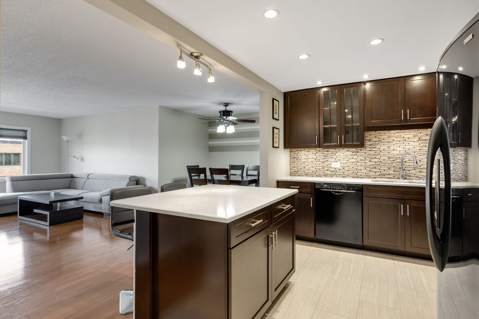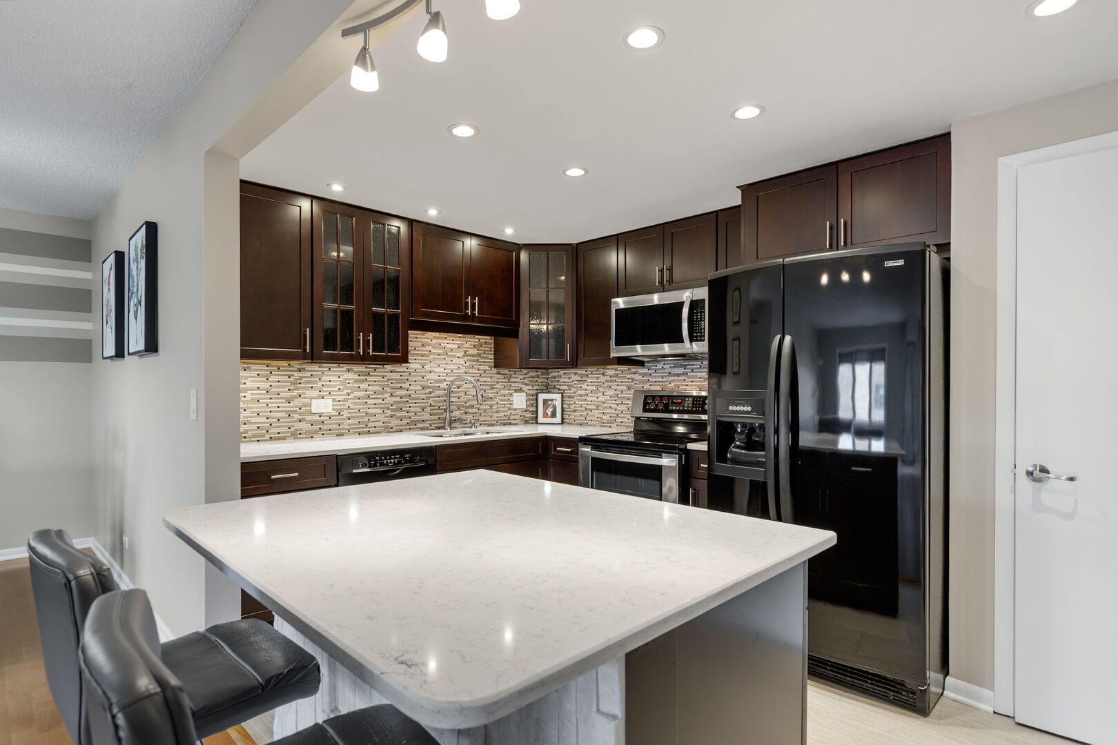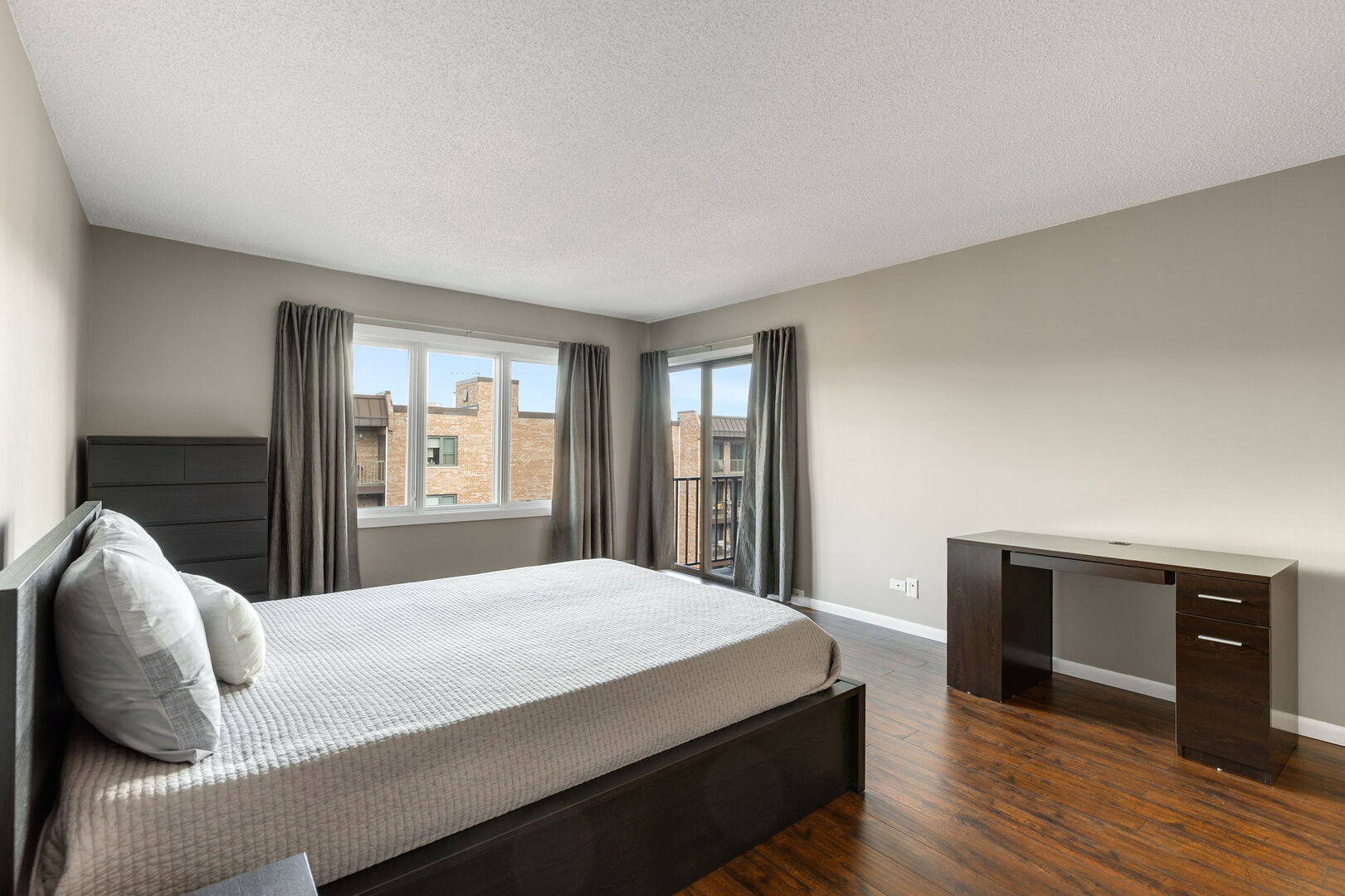 Spacious 2 Bed / 2 Bath Condo – Downtown Des Plaines Bright and updated condo just steps from shops, restaurants, parks, the library, and Metra, with quick access to the expressway. Open-concept kitchen/living room, separate dining, in-unit laundry, and large balcony accessible from bedrooms and living room. Includes 1 heated garage space, 1 outdoor space, and same-floor storage. Updates feature hardwood floors, 42″ kitchen cabinets with quartz island, renovated baths with upgraded primary shower, and laminate bedroom flooring.