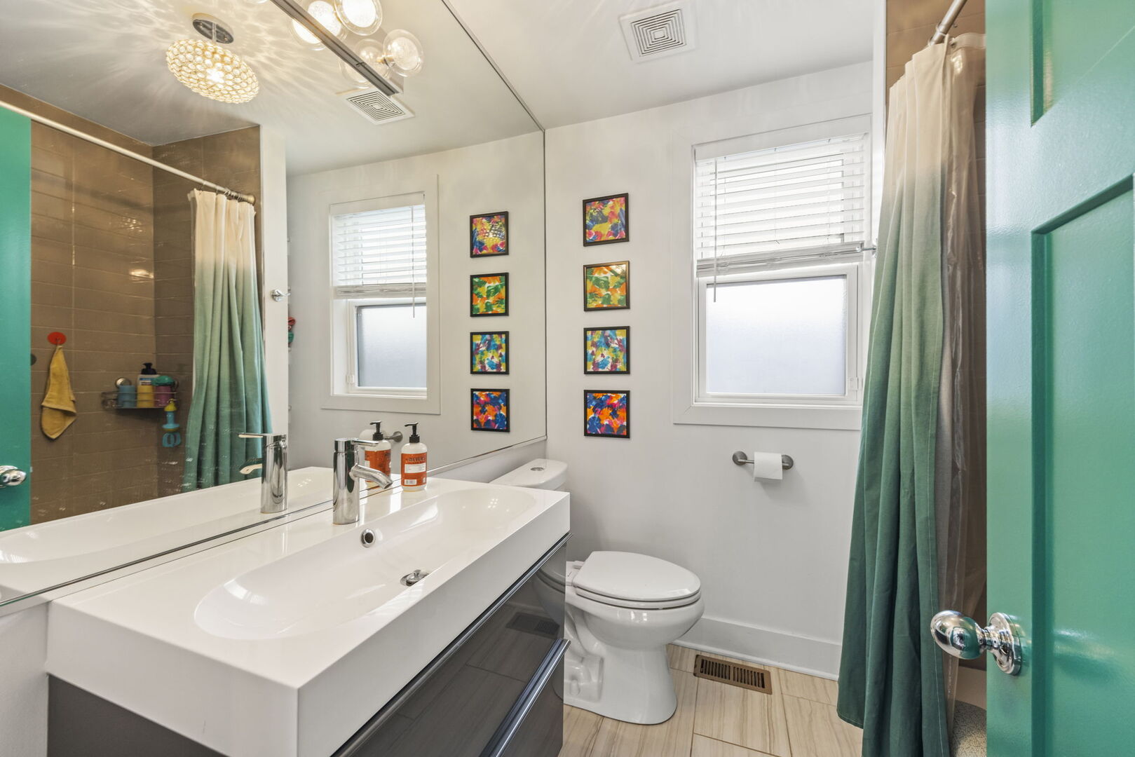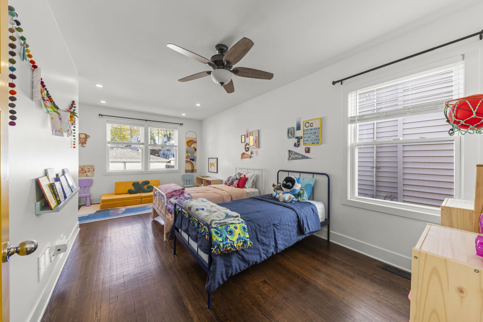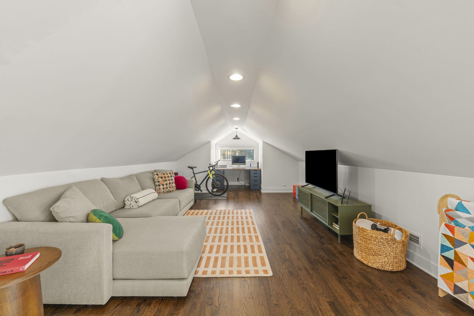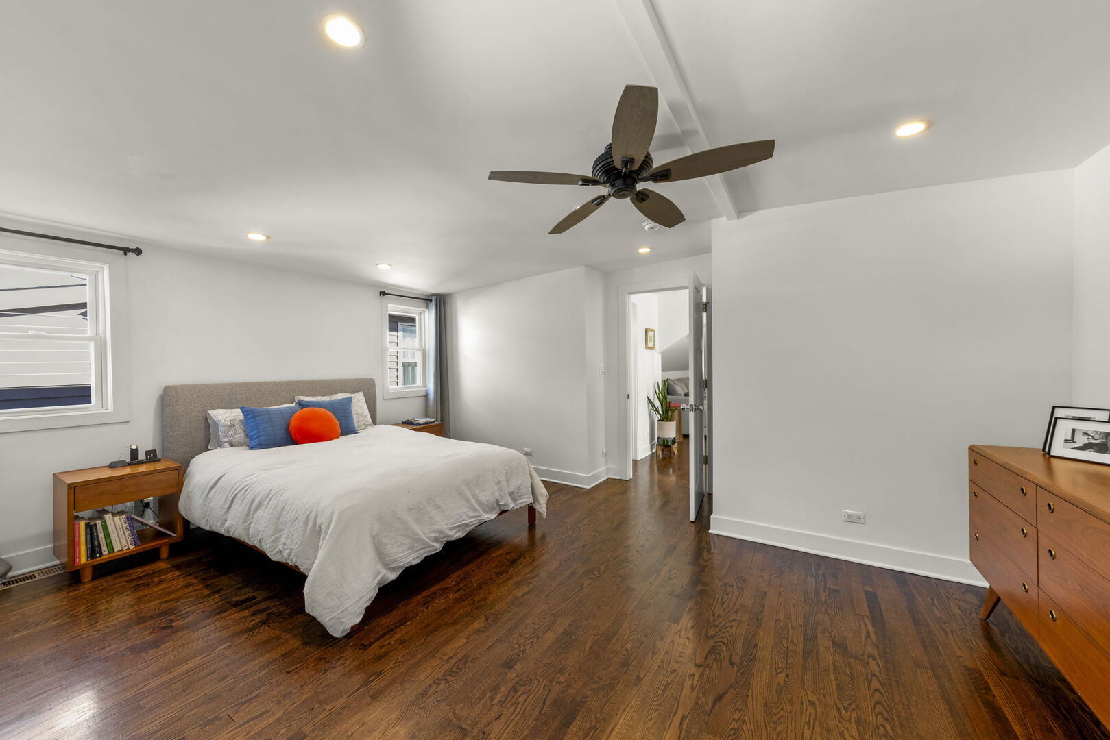 Prepare to fall in love with this artfully updated brick bungalow-the perfect blend of classic charm and modern style. Warmth and livability shine throughout thanks to tall ceilings, hardwood floors, and incredible natural light pouring through the home’s large windows. Thoughtful details like 9′ ceilings, crown molding, and 6″ trim pair seamlessly with the beautifully updated kitchen and baths, carefully selected light fixtures, and uplifting design touches. The charming entryway opens into bright, open-concept living and dining rooms that feel both welcoming and spacious. The stunning kitchen features custom cabinetry, beautiful quartz countertops, stainless steel appliances, and space for a small table or workspace. Two generous main-floor bedrooms with ample closet space share a beautifully updated full bath. The upstairs primary suite is a true retreat-luxuriously spacious with a gorgeous full bathroom, an enormous walk-in closet, and an additional bonus room. The full basement has been professionally waterproofed and is ready for your finishing ideas. Step outside to a spectacular fenced backyard with an expansive deck and adjacent patio, located just off the kitchen-ideal for relaxing or entertaining. This home underwent a complete gut renovation and rebuild in 2016, including plumbing and electrical. Recent improvements include fresh paint, new light fixtures, new oven/range (2025), new dishwasher (2025) and new microwave (2025). A UV filter has also been added to the furnace. A two-car garage is easily accessed from the alley. Convenient location right across from Maple Park. Close to restaurants and shopping, with quick access to the CTA Blue Line and the expressway. Welcome home!