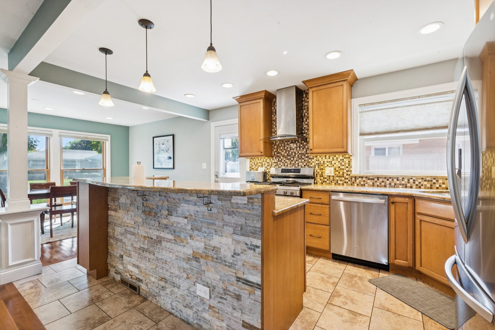 Beautifully updated split-level in desirable Morton Grove! Bright and open living and dining areas lead to an updated kitchen with granite counters, island, stainless steel appliances, pantry, and custom cabinetry. Three comfortable bedrooms on the upper level plus two fully updated bathrooms with modern finishes. The lower level, gut rehabbed in 2022, offers a spacious family room, office nook, and full bath-perfect for entertaining, work, or guests. Enjoy the outdoor space with a patio and large fenced yard with in ground sprinkler (2022), along with a 2.5-car insulated garage. Major updates between 2012-2014 and brand-new appliances provide peace of mind. Conveniently located near Metra, highways, shopping, dining, parks, and highly rated schools. Don’t miss this move-in-ready home-schedule your showing today!