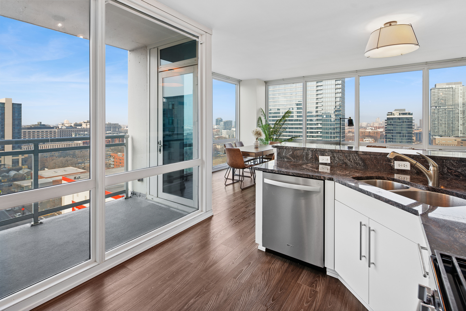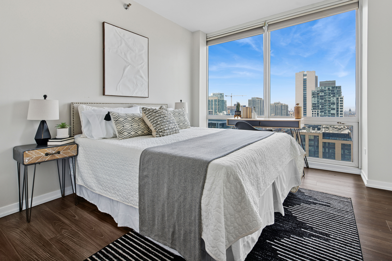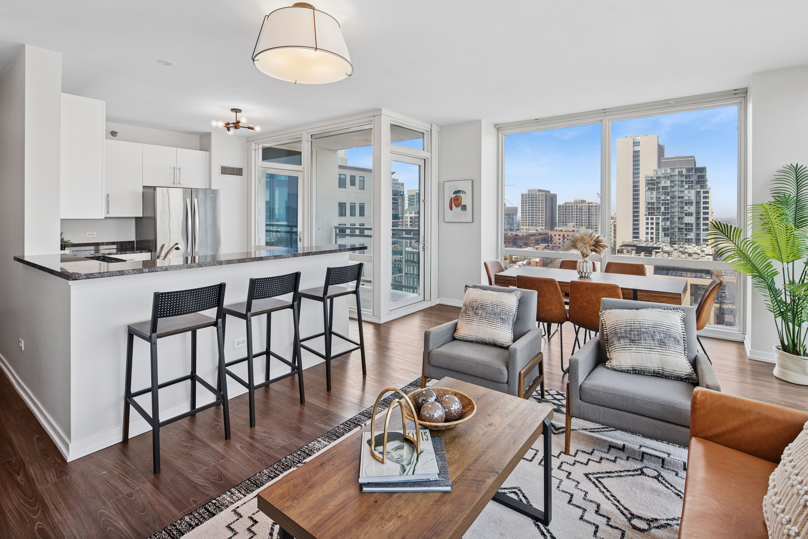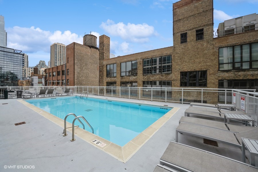 Enjoy the best of River North in this modern and stylish 2 bed / 2 bath cornerunit condo in a fullamenity building. Updated with contemporary lighting and beautiful luxury laminate flooring, this home features a wellappointed kitchen with stainless steel appliances, granite countertops, and a convenient breakfast bar. The openconcept living and dining area is framed by floortoceiling windows that fill the space with natural light. The spacious primary suite includes a large walkin closet and an ensuite bath with double sinks and a combined bath/shower. The second bedroom is ideal for guests or a home office and is located adjacent to a second full bath with a walkin shower. Additional conveniences include an inunit washer and dryer, multiple foyer closets, and a private balcony offering fantastic northwest city views. Building amenities include 24hour door staff, fitness center, outdoor pool and sundeck, and a dog run. HOA includes heat, gas, water, scavenger, high speed internet, and air conditioning. One garage parking space and an additional storage unit are included. Petfriendly building (Additional HOA). Prime location close to the Loop, lakefront, Michigan Avenue, expressways, and the Brown/Purple CTA lines. Investorfriendly. Agentowned.