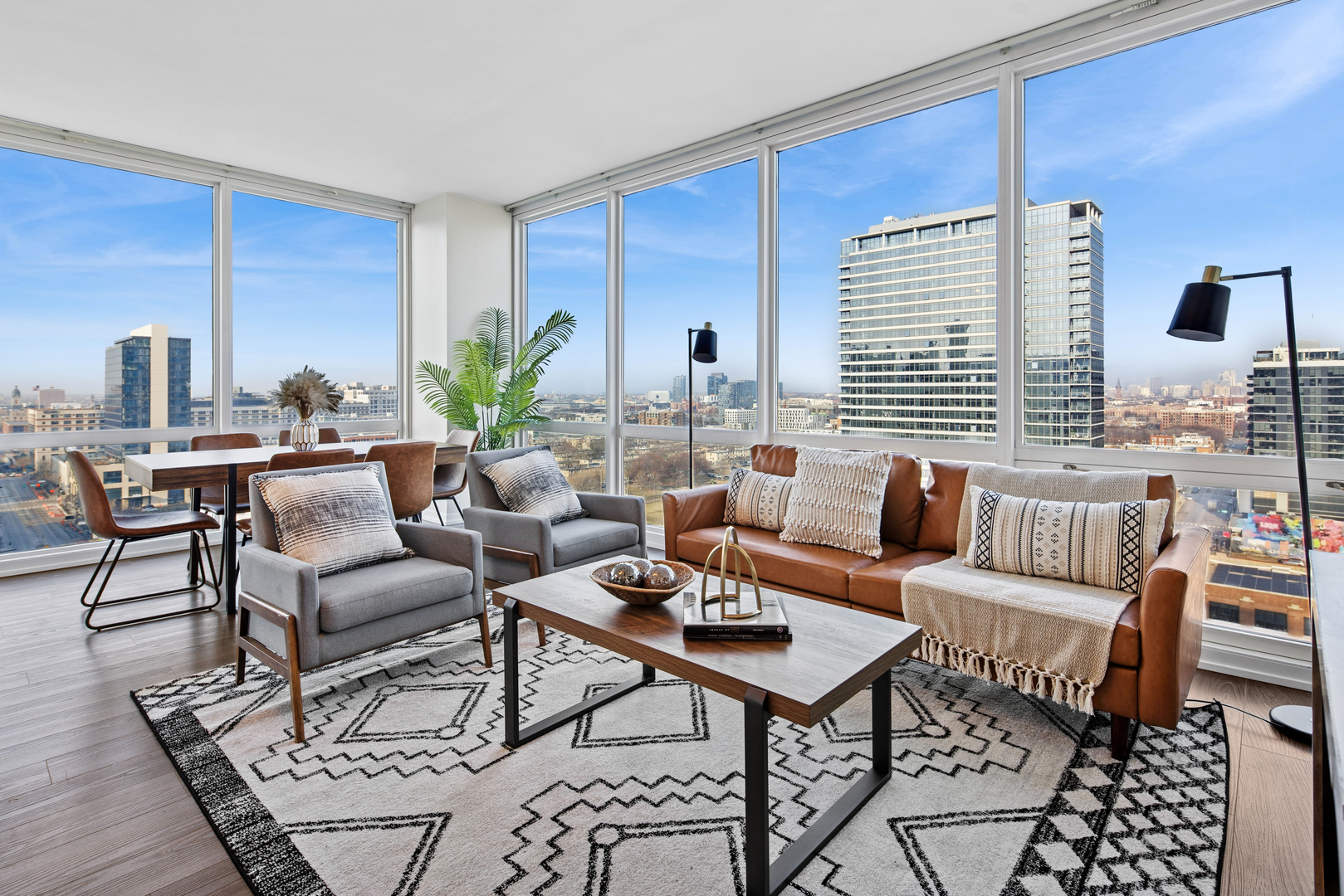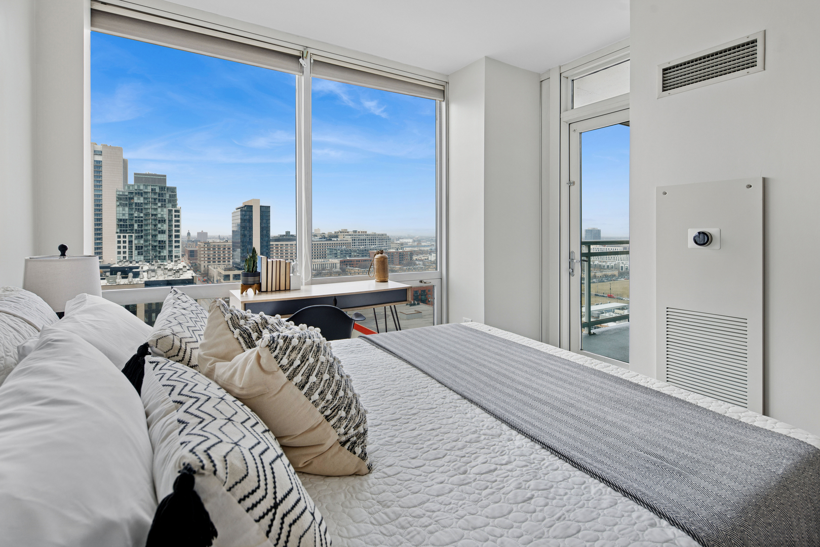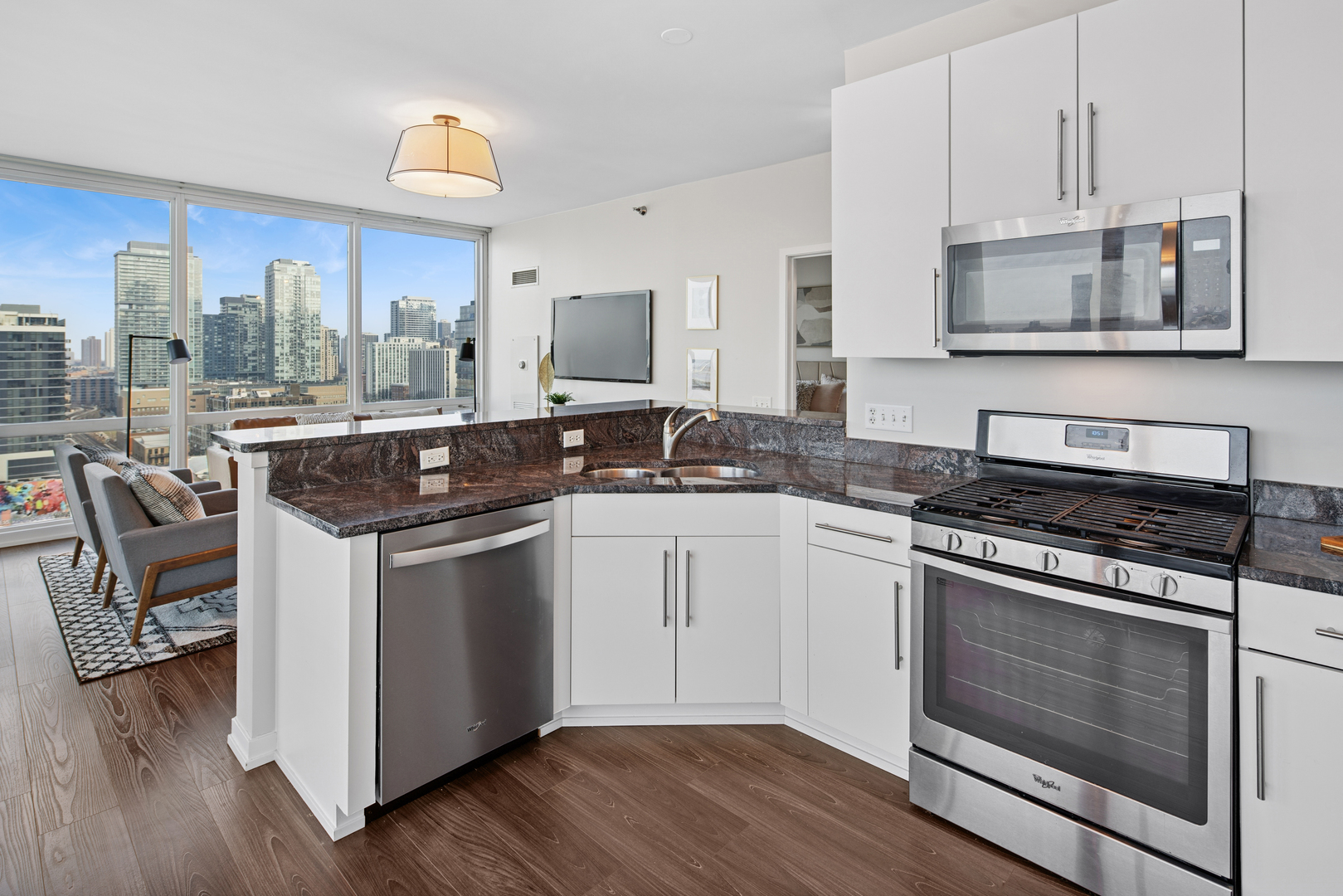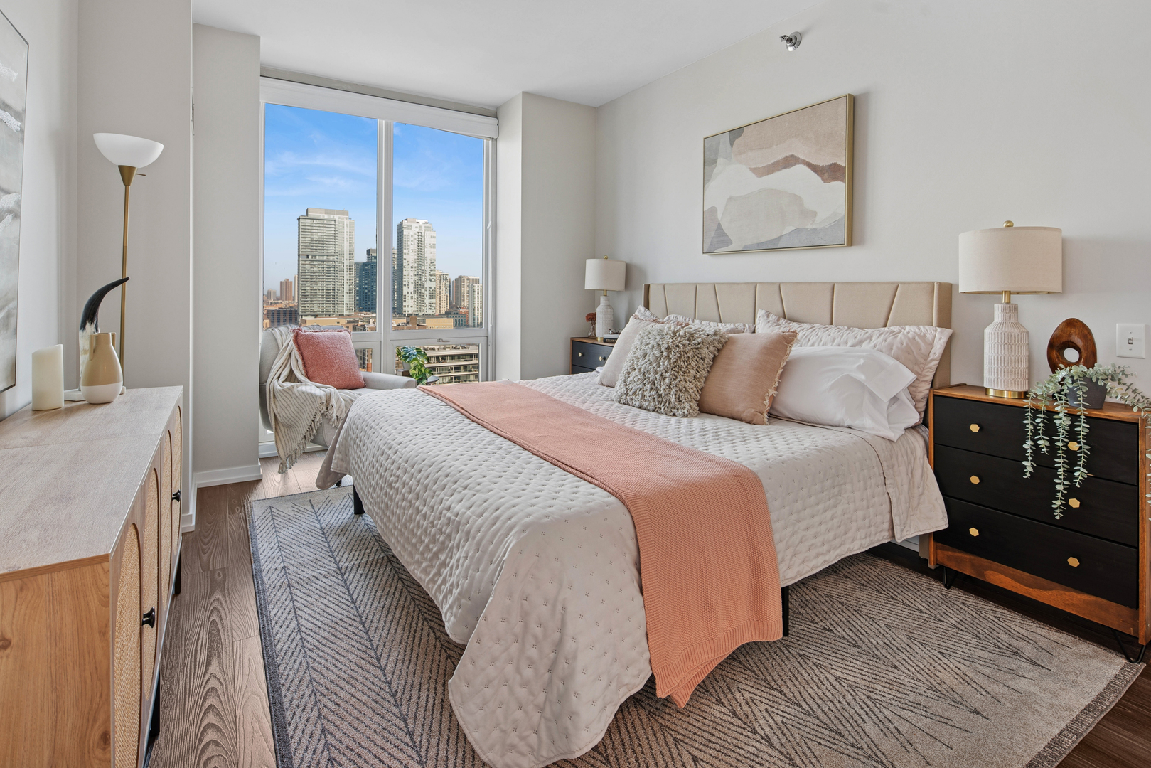 Enjoy the best of River North in this modern and stylish 2 bed / 2 bath cornerunit condo in a fullamenity building. Updated with contemporary lighting and beautiful luxury laminate flooring, this home features a wellappointed kitchen with stainless steel appliances, granite countertops, and a convenient breakfast bar. The openconcept living and dining area is framed by floortoceiling windows that fill the space with natural light. The spacious primary suite includes a large walkin closet and an ensuite bath with double sinks and a combined bath/shower. The second bedroom is ideal for guests or a home office and is located adjacent to a second full bath with a walkin shower. Additional conveniences include an inunit washer and dryer, multiple foyer closets, and a private balcony offering fantastic northwest city views. Building amenities include 24hour door staff, fitness center, outdoor pool and sundeck, and a dog run. HOA includes heat, gas, water, scavenger, high speed internet, and air conditioning. One garage parking space and an additional storage unit are included. Petfriendly building (Additional HOA). Prime location close to the Loop, lakefront, Michigan Avenue, expressways, and the Brown/Purple CTA lines. Investorfriendly. Agentowned.
