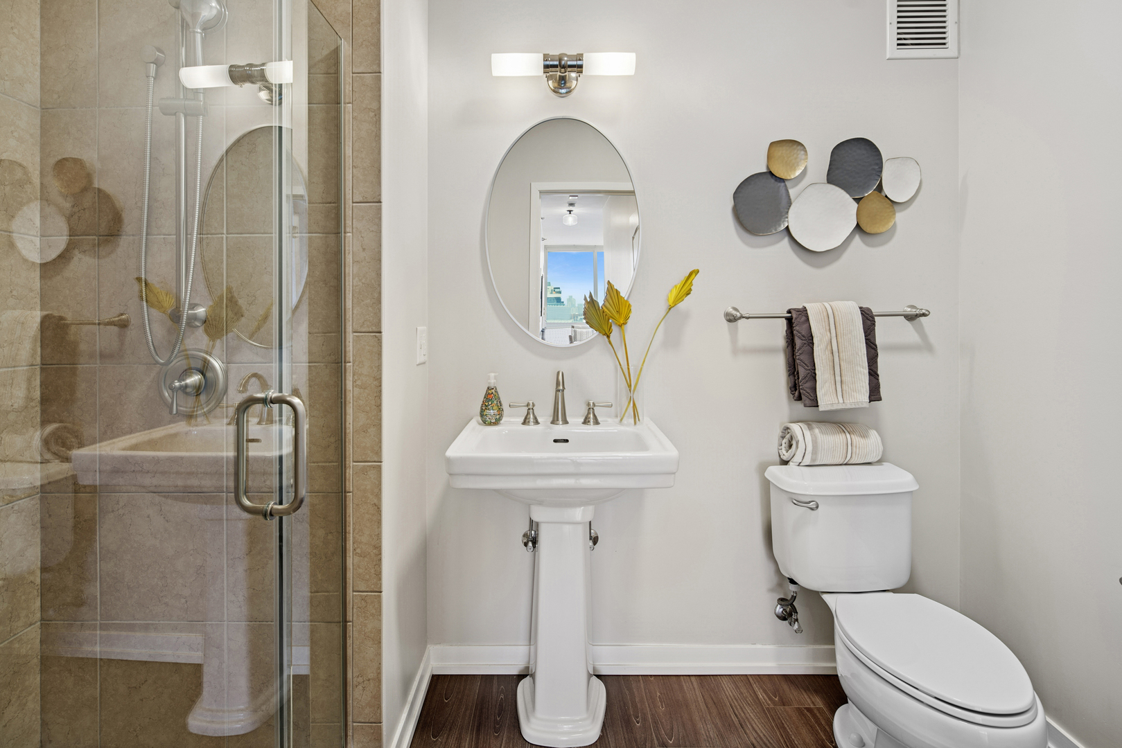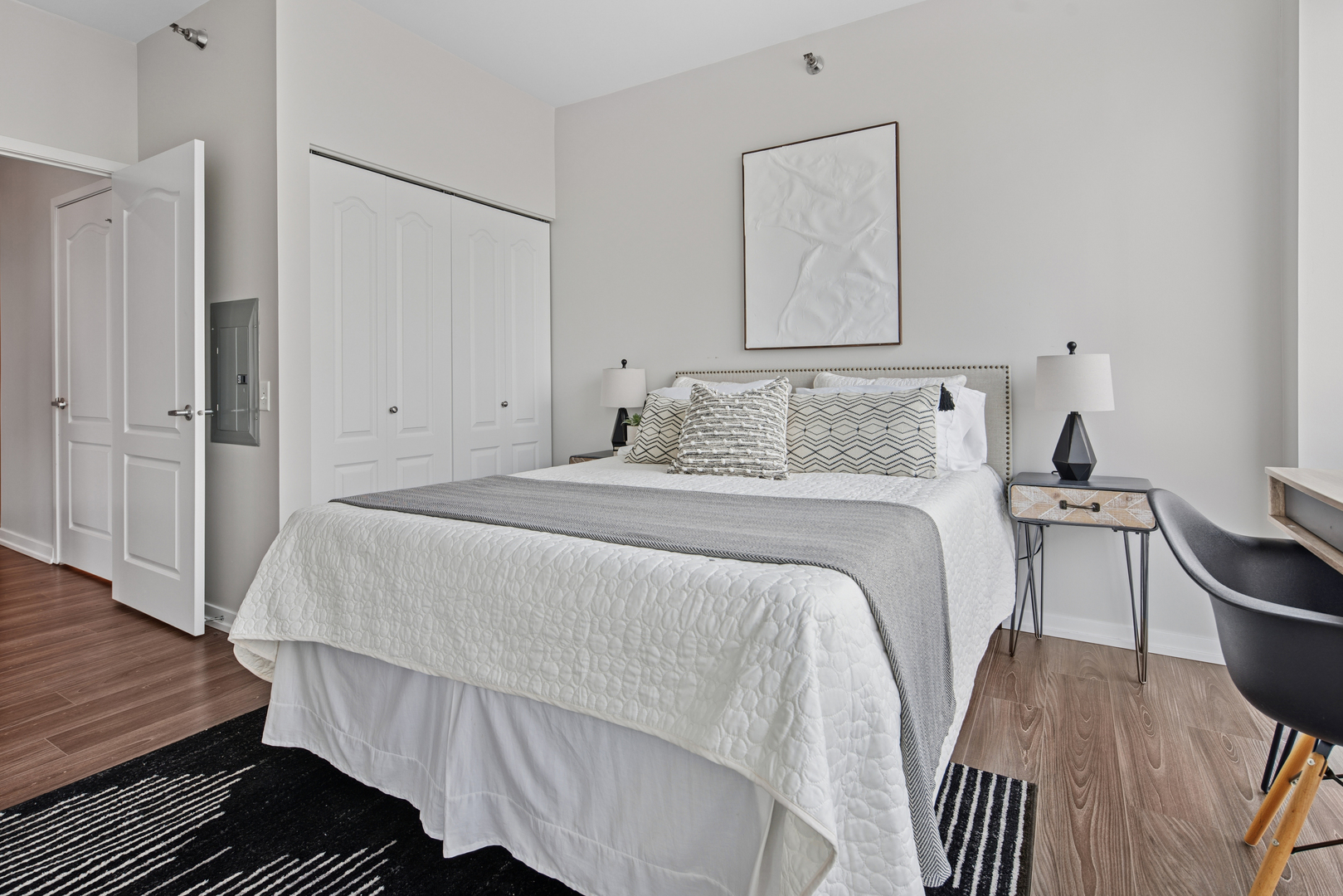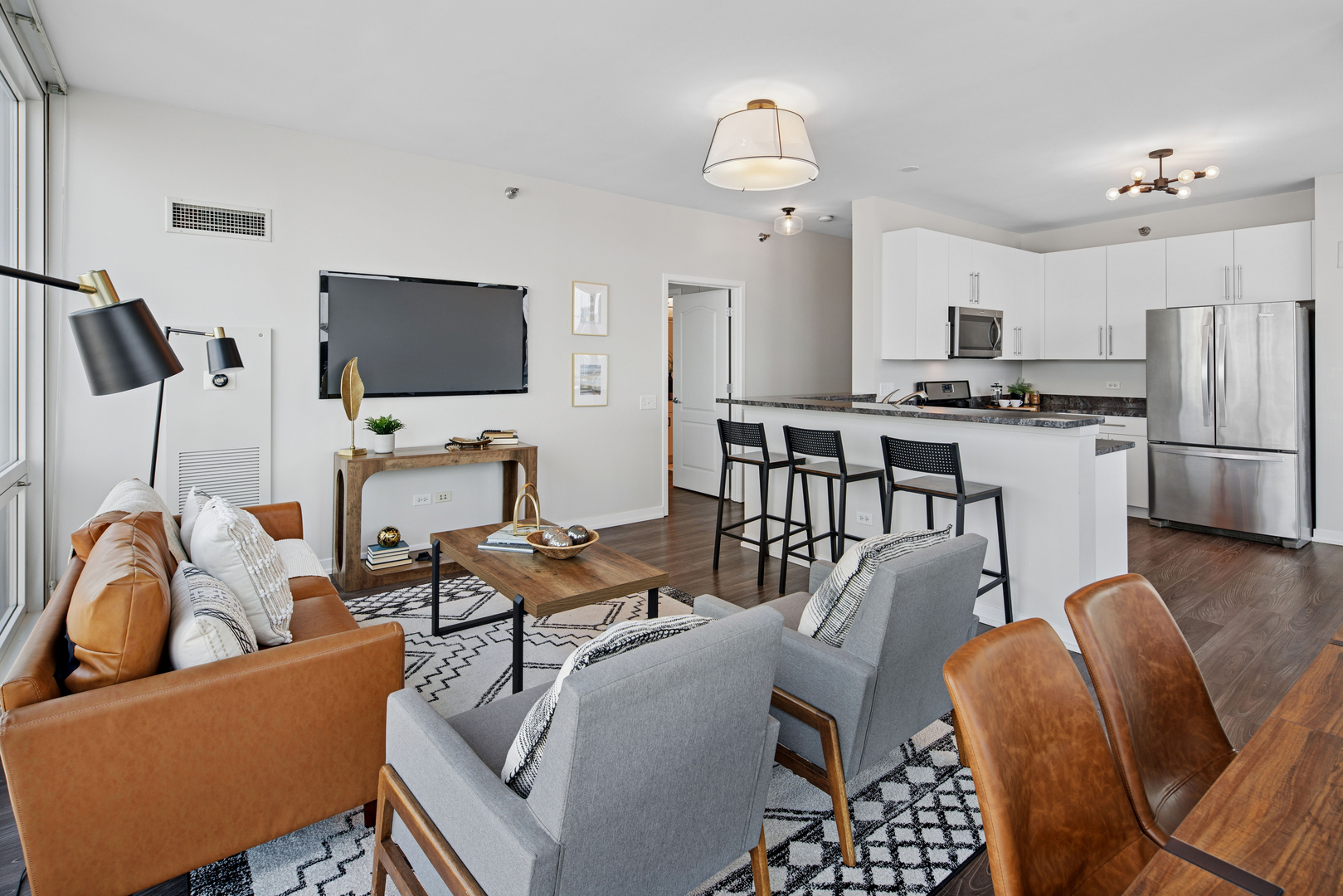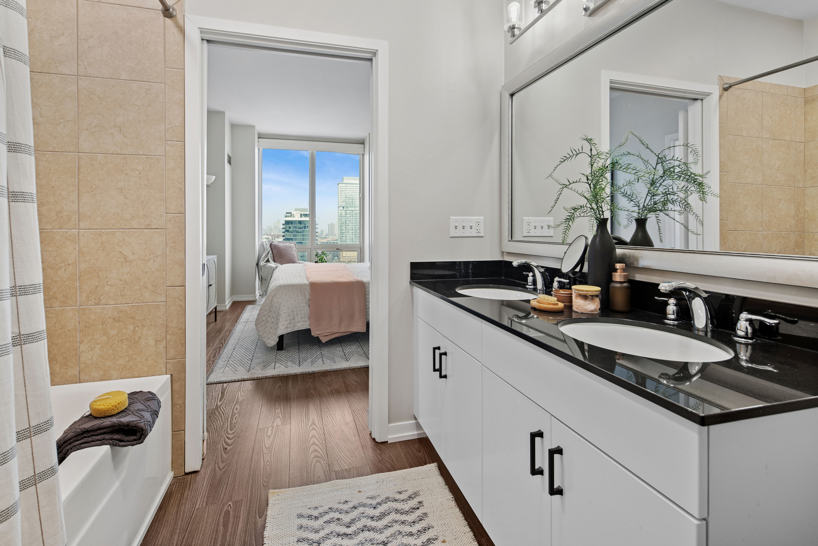 Enjoy the best of River North in this modern and stylish 2 bed / 2 bath cornerunit condo in a fullamenity building. Updated with contemporary lighting and beautiful luxury laminate flooring, this home features a wellappointed kitchen with stainless steel appliances, granite countertops, and a convenient breakfast bar. The openconcept living and dining area is framed by floortoceiling windows that fill the space with natural light. The spacious primary suite includes a large walkin closet and an ensuite bath with double sinks and a combined bath/shower. The second bedroom is ideal for guests or a home office and is located adjacent to a second full bath with a walkin shower. Additional conveniences include an inunit washer and dryer, multiple foyer closets, and a private balcony offering fantastic northwest city views. Building amenities include 24hour door staff, fitness center, outdoor pool and sundeck, and a dog run. HOA includes heat, gas, water, scavenger, high speed internet, and air conditioning. One garage parking space and an additional storage unit are included. Petfriendly building (Additional HOA). Prime location close to the Loop, lakefront, Michigan Avenue, expressways, and the Brown/Purple CTA lines. Investorfriendly. Agentowned.