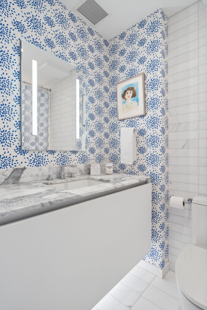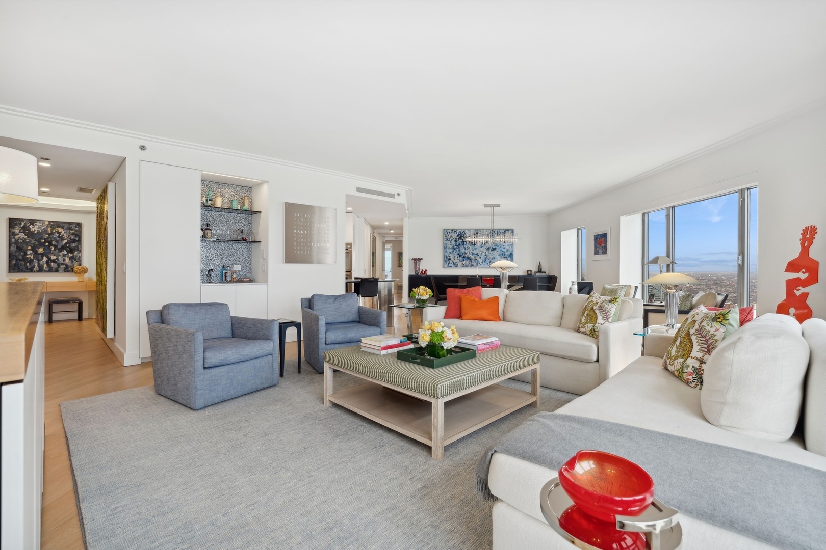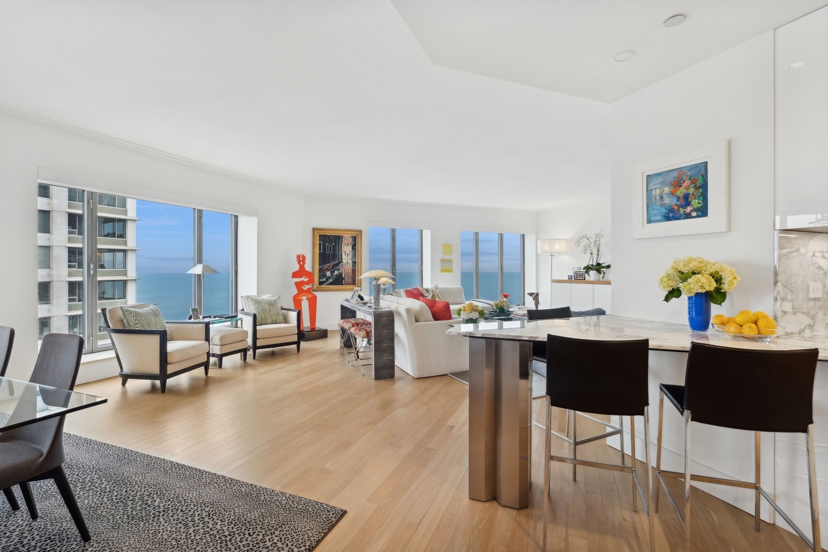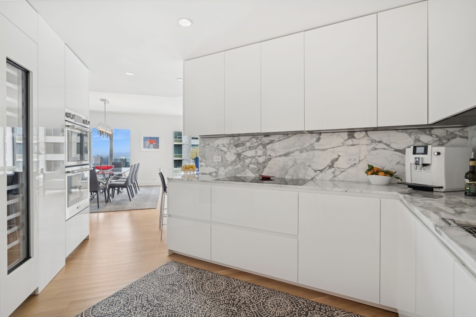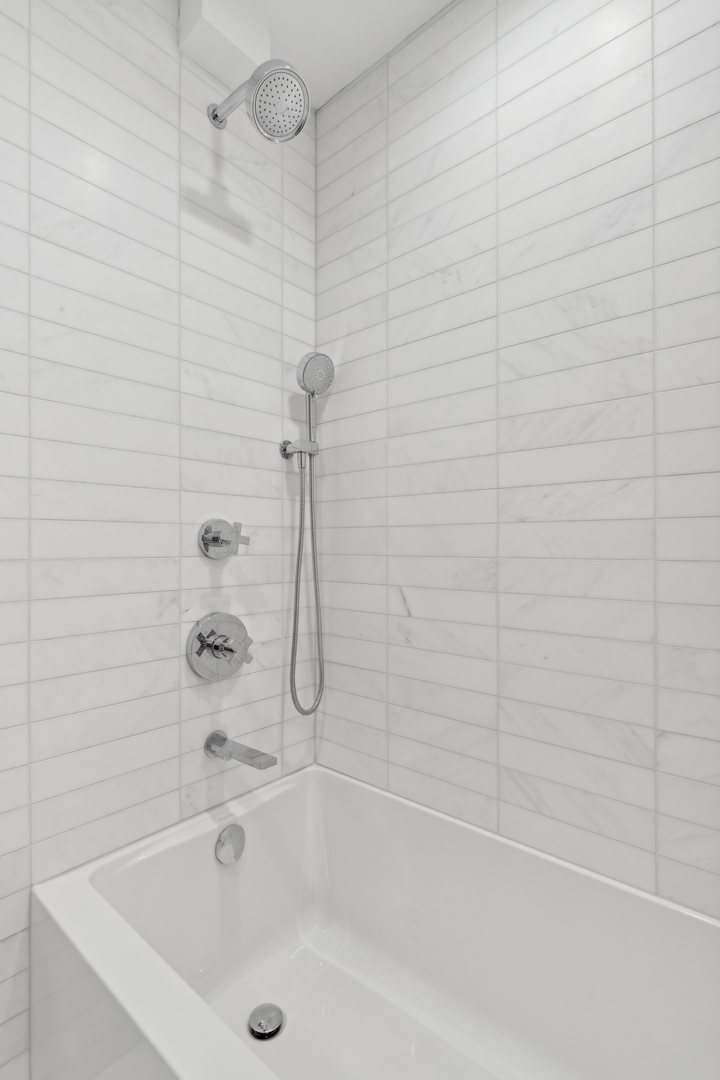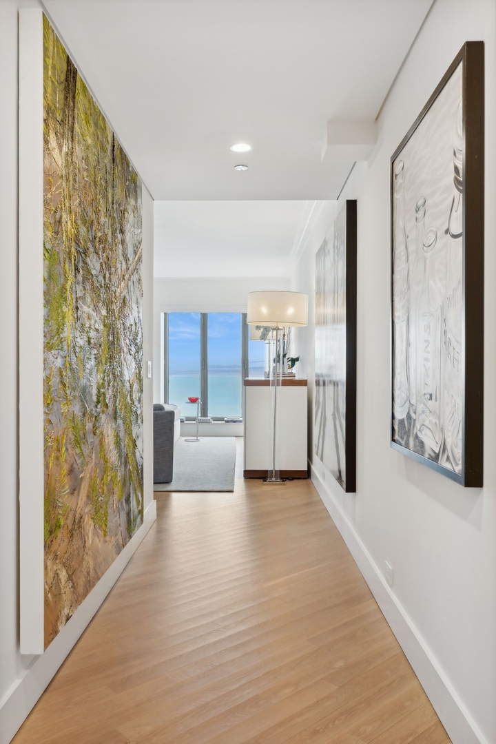 Effortlessly chic and totally turnkey, 950 N. Michigan Ave., unit 4103, is a 2430-square-foot, 3 bed/3.5 bath luxury, lake-facing condo situated inside Chicago’s iconic One Magnificent Mile building. Located at the northernmost tip of the Mag Mile, steps to Oak Street Beach, this striking residential building was designed by acclaimed architect Bruce Graham and offers unparalleled views of the lakefront, Lake Shore Drive, the skyline, and Navy Pier. Unit 4103 has undergone a comprehensive renovation and redesign, including upgraded fixtures and finishes throughout and full rewiring and all new copper pluming. The floor plan begins with a spacious foyer with a built-in console and a decorative, recessed ceiling with ambient LED lighting. A lovely gallery hall links to the open-concept living/dining space, which is flooded with natural light courtesy of oversize windows that frame both lake and city views. The living room features a built-in wet bar with a hammered sink, floating glass shelves, and concealed storage, while the defined dining space stuns with a statement pendant light and a hanging buffet with a brushed glass front, and can easily accommodate seated dinner parties for up to 8-10 guests. The centrally located, all-white chef’s kitchen boasts custom high-gloss lacquer cabinetry, Italian marble countertops, professional-grade Thermador and Miele appliances including both steam and convection ovens and a wine fridge, and a peninsula-style breakfast counter with a custom stainless steel base that was modeled after the building’s famous architecture. On the opposite side of the floor plan, this home presents two distinctly elegant secondary bedrooms – one that’s ensuite, another that does double duty as a handsome home office with a custom two-person desk, a queen-size Murphy bed, and a gray flannel wallcovering – plus a deluxe primary suite. The primary bedroom is large and bright, and features more stunning views, a gorgeous suede wallcovering by Phillip Jeffries, a custom walk-in closet (14′ x 8′), and a spectacular spa bath with a dual vanity with honed Carrara marble countertops, Robern electric mirror/cabinets, a standalone tub that fills from the ceiling, and a steam shower. Additional callout details include new white oak hardwood floors throughout, a polished powder room with a Thibaut wallcovering, heated bathrooms floors by Nuheat in all full baths, zoned heating with Mysa internet-connect thermostats, electric light-passing in all rooms and additional blackout shades in all of the bedrooms, and an in-unit laundry room with bonus storage. First-class building amenities include a 24-hour door staff, a rooftop deck, an indoor pool with lap lanes, a spa, and a fitness center. Steps to world-class shopping, dining and culture, including the 900 North Michigan Shops and Equinox fitness club, 950 N. Michigan Ave., unit 4103, is high-style living in the Gold Coast. (950 N. Michigan Ave. is a pet-friendly building with indoor garage parking available.)