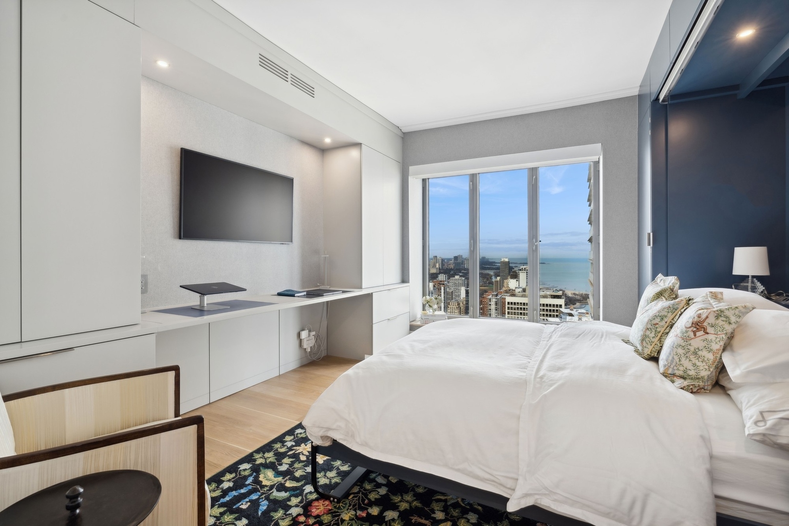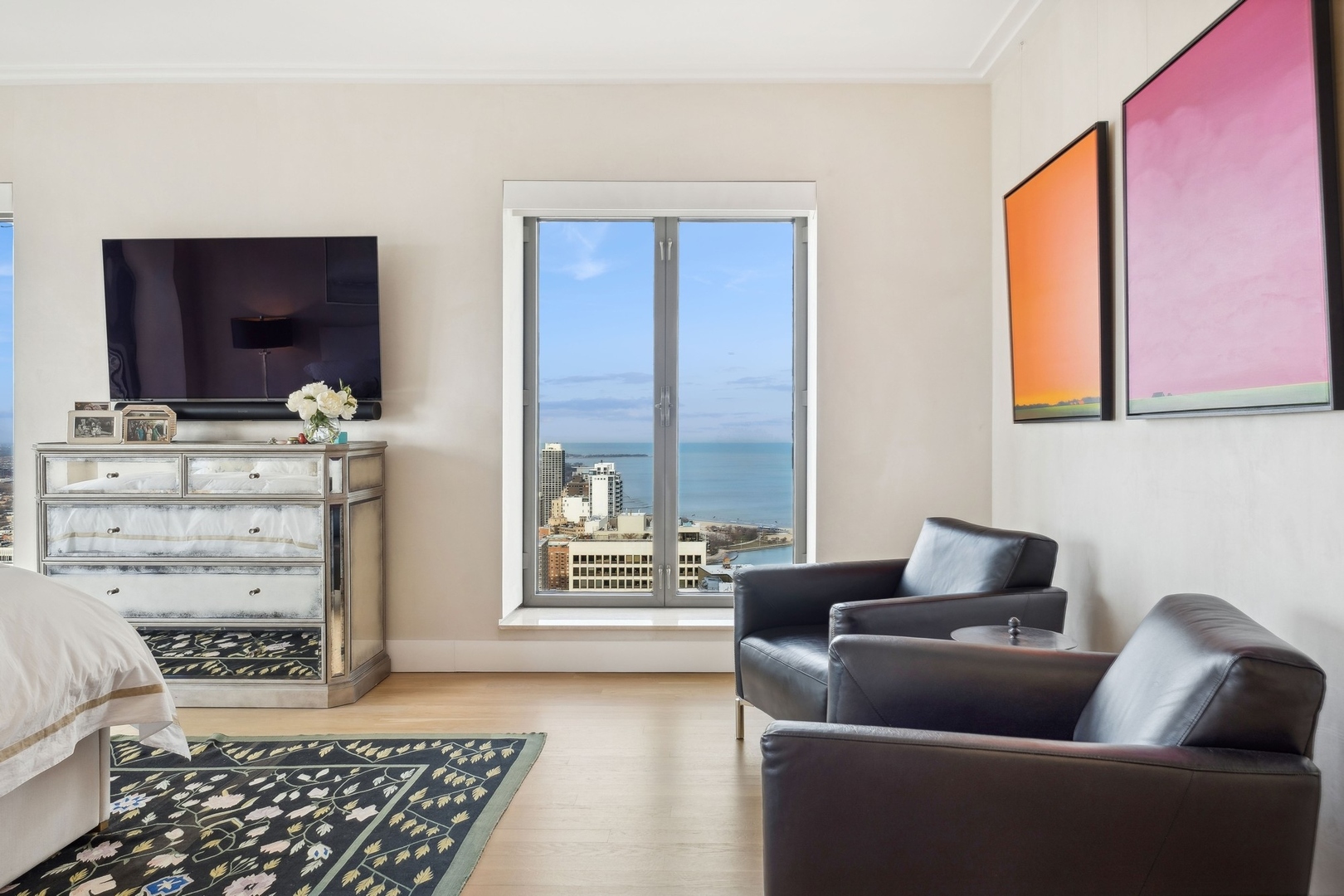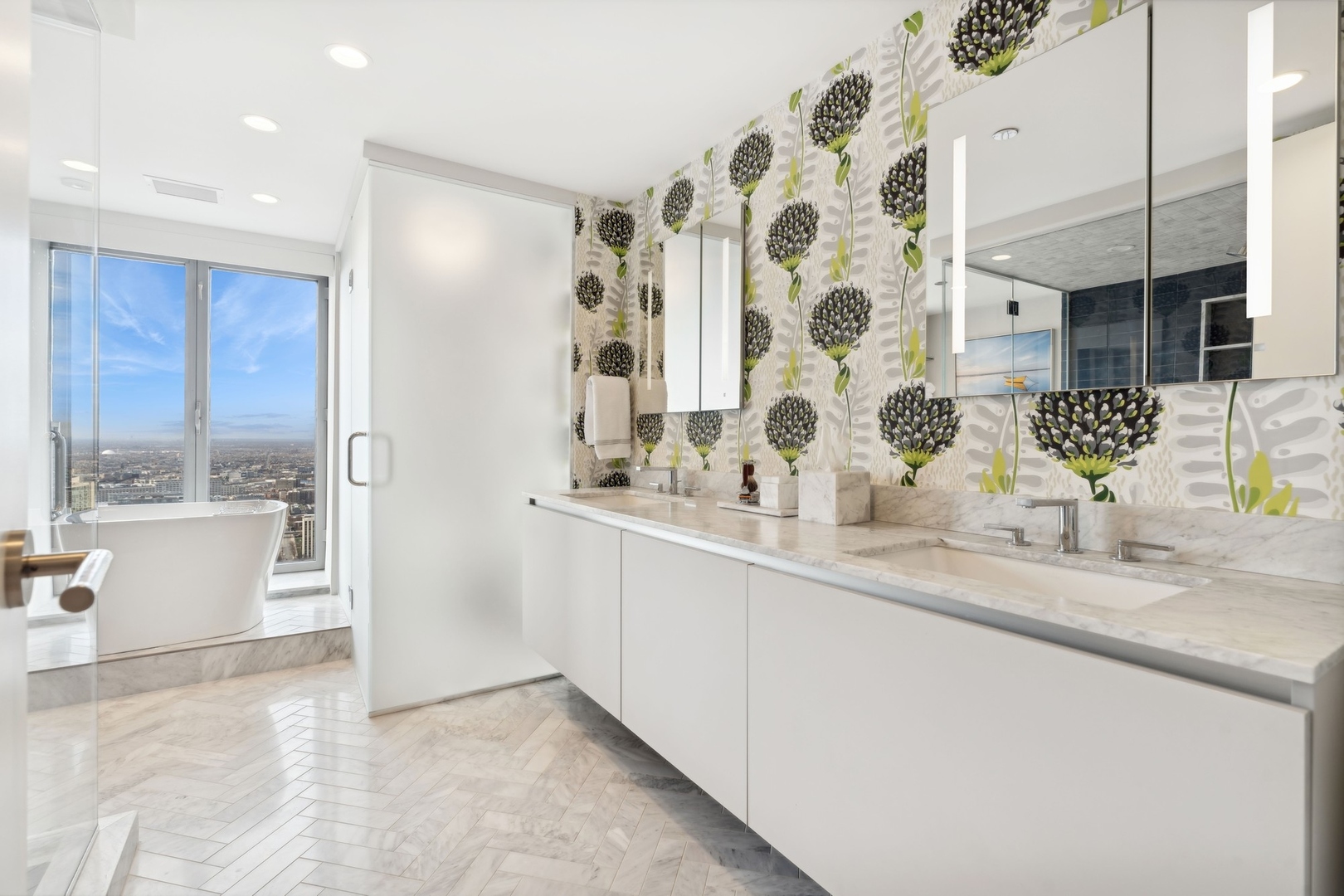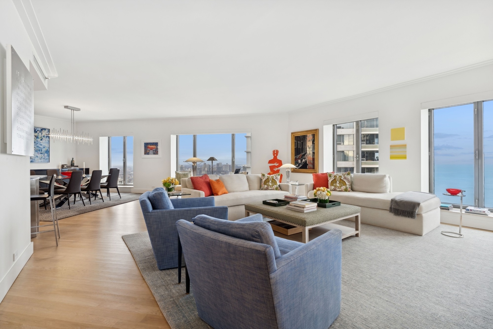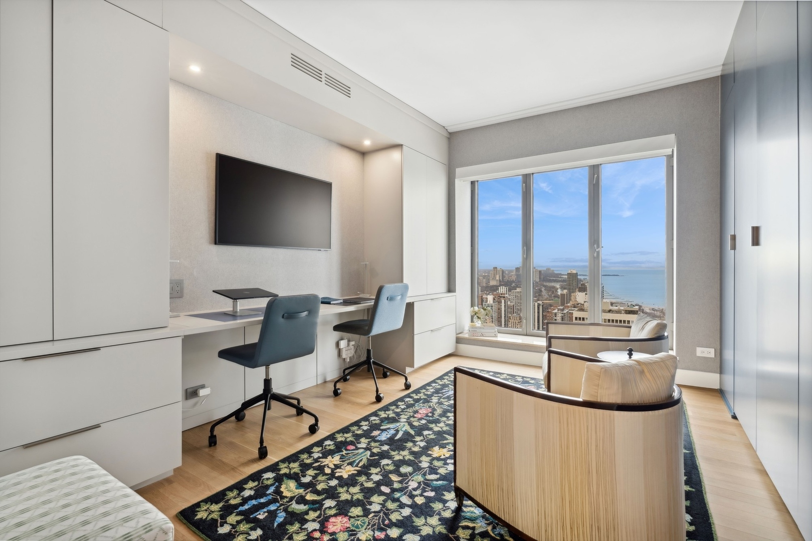 Effortlessly chic and totally turnkey, 950 N. Michigan Ave., unit 4103, is a 2430-square-foot, 3 bed/3.5 bath luxury, lake-facing condo situated inside Chicago’s iconic One Magnificent Mile building. Located at the northernmost tip of the Mag Mile, steps to Oak Street Beach, this striking residential building was designed by acclaimed architect Bruce Graham and offers unparalleled views of the lakefront, Lake Shore Drive, the skyline, and Navy Pier. Unit 4103 has undergone a comprehensive renovation and redesign, including upgraded fixtures and finishes throughout and full rewiring and all new copper pluming. The floor plan begins with a spacious foyer with a built-in console and a decorative, recessed ceiling with ambient LED lighting. A lovely gallery hall links to the open-concept living/dining space, which is flooded with natural light courtesy of oversize windows that frame both lake and city views. The living room features a built-in wet bar with a hammered sink, floating glass shelves, and concealed storage, while the defined dining space stuns with a statement pendant light and a hanging buffet with a brushed glass front, and can easily accommodate seated dinner parties for up to 8-10 guests. The centrally located, all-white chef’s kitchen boasts custom high-gloss lacquer cabinetry, Italian marble countertops, professional-grade Thermador and Miele appliances including both steam and convection ovens and a wine fridge, and a peninsula-style breakfast counter with a custom stainless steel base that was modeled after the building’s famous architecture. On the opposite side of the floor plan, this home presents two distinctly elegant secondary bedrooms – one that’s ensuite, another that does double duty as a handsome home office with a custom two-person desk, a queen-size Murphy bed, and a gray flannel wallcovering – plus a deluxe primary suite. The primary bedroom is large and bright, and features more stunning views, a gorgeous suede wallcovering by Phillip Jeffries, a custom walk-in closet (14′ x 8′), and a spectacular spa bath with a dual vanity with honed Carrara marble countertops, Robern electric mirror/cabinets, a standalone tub that fills from the ceiling, and a steam shower. Additional callout details include new white oak hardwood floors throughout, a polished powder room with a Thibaut wallcovering, heated bathrooms floors by Nuheat in all full baths, zoned heating with Mysa internet-connect thermostats, electric light-passing in all rooms and additional blackout shades in all of the bedrooms, and an in-unit laundry room with bonus storage. First-class building amenities include a 24-hour door staff, a rooftop deck, an indoor pool with lap lanes, a spa, and a fitness center. Steps to world-class shopping, dining and culture, including the 900 North Michigan Shops and Equinox fitness club, 950 N. Michigan Ave., unit 4103, is high-style living in the Gold Coast. (950 N. Michigan Ave. is a pet-friendly building with indoor garage parking available.)