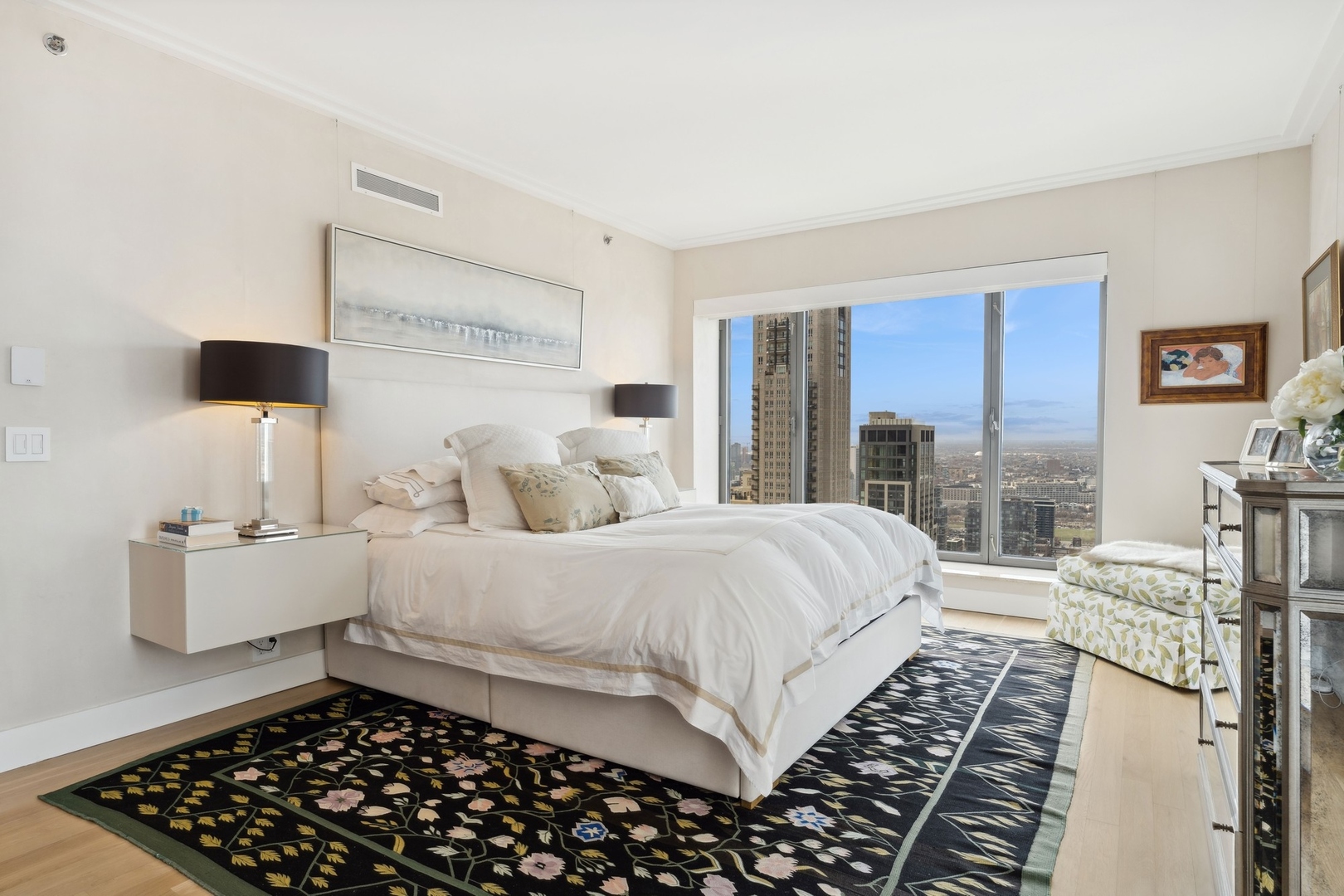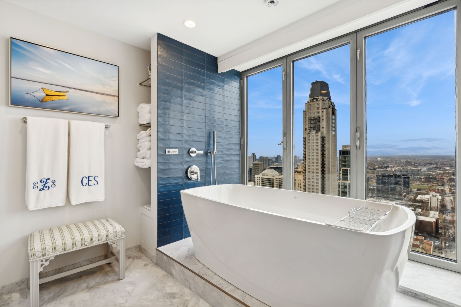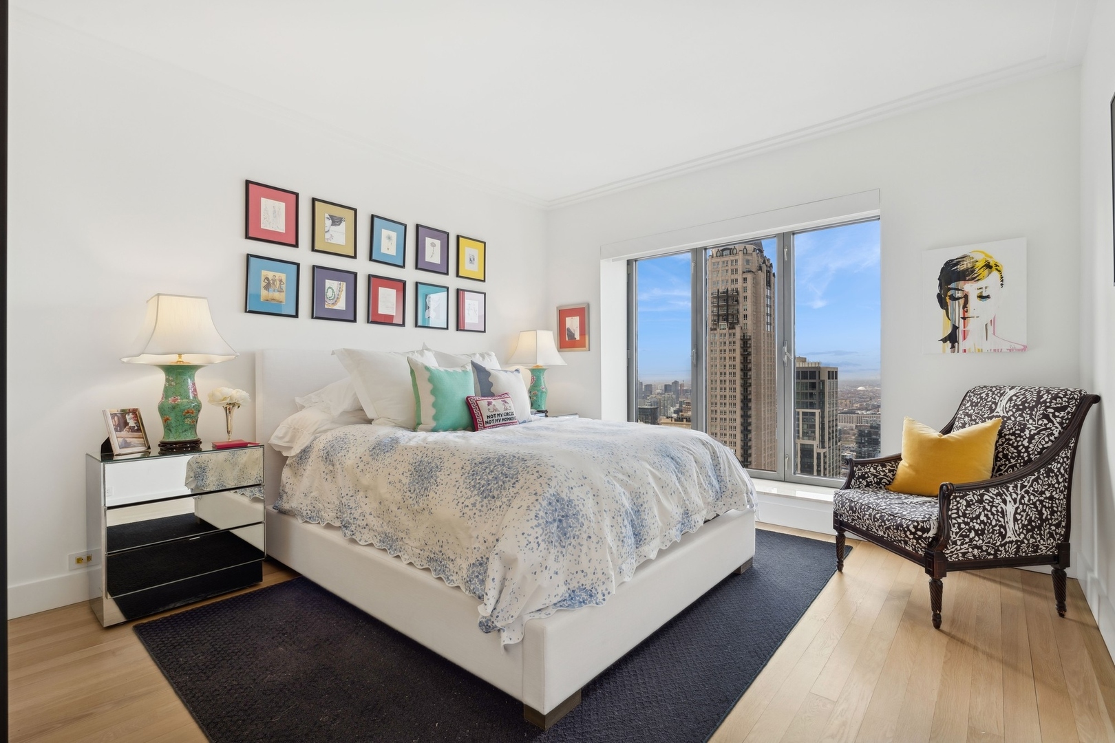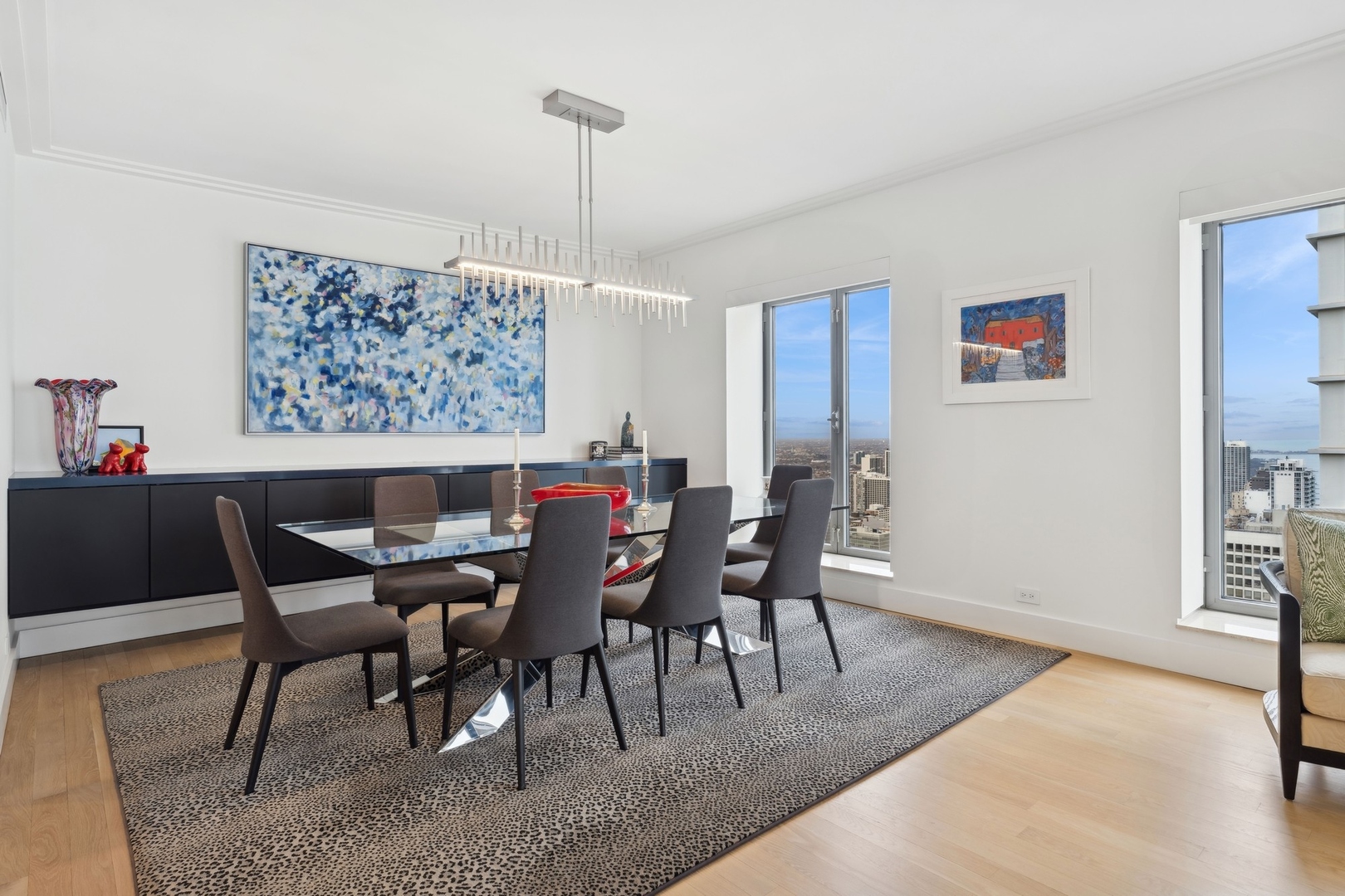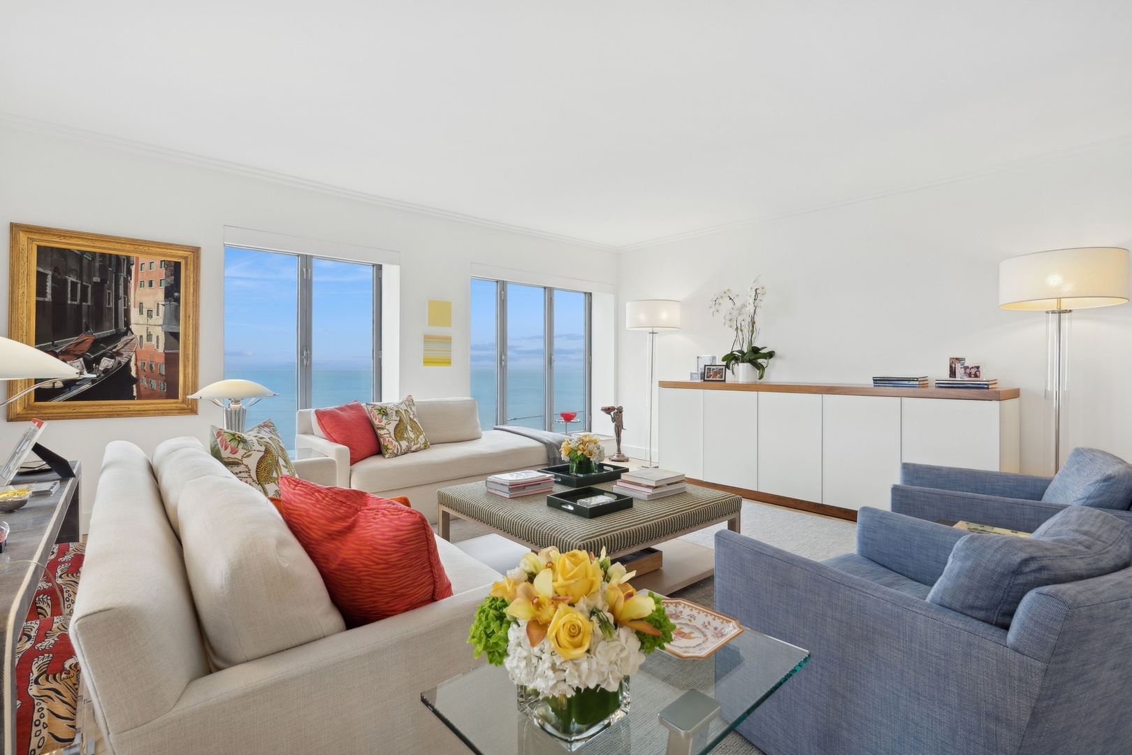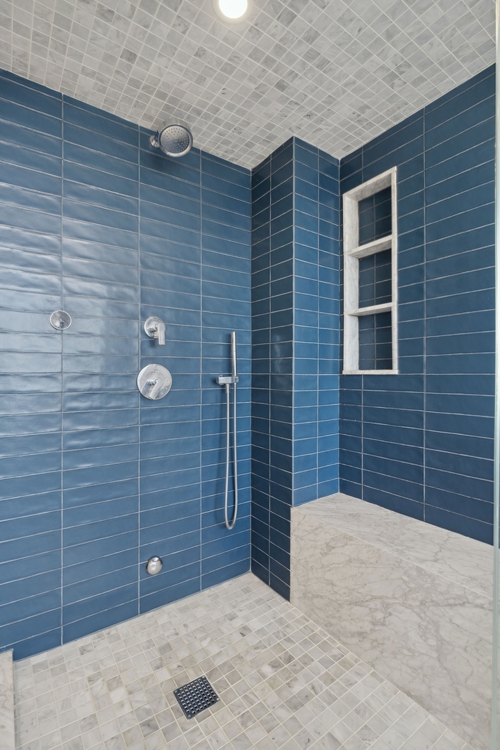 Effortlessly chic and totally turnkey, 950 N. Michigan Ave., unit 4103, is a 2430-square-foot, 3 bed/3.5 bath luxury, lake-facing condo situated inside Chicago’s iconic One Magnificent Mile building. Located at the northernmost tip of the Mag Mile, steps to Oak Street Beach, this striking residential building was designed by acclaimed architect Bruce Graham and offers unparalleled views of the lakefront, Lake Shore Drive, the skyline, and Navy Pier. Unit 4103 has undergone a comprehensive renovation and redesign, including upgraded fixtures and finishes throughout and full rewiring and all new copper pluming. The floor plan begins with a spacious foyer with a built-in console and a decorative, recessed ceiling with ambient LED lighting. A lovely gallery hall links to the open-concept living/dining space, which is flooded with natural light courtesy of oversize windows that frame both lake and city views. The living room features a built-in wet bar with a hammered sink, floating glass shelves, and concealed storage, while the defined dining space stuns with a statement pendant light and a hanging buffet with a brushed glass front, and can easily accommodate seated dinner parties for up to 8-10 guests. The centrally located, all-white chef’s kitchen boasts custom high-gloss lacquer cabinetry, Italian marble countertops, professional-grade Thermador and Miele appliances including both steam and convection ovens and a wine fridge, and a peninsula-style breakfast counter with a custom stainless steel base that was modeled after the building’s famous architecture. On the opposite side of the floor plan, this home presents two distinctly elegant secondary bedrooms – one that’s ensuite, another that does double duty as a handsome home office with a custom two-person desk, a queen-size Murphy bed, and a gray flannel wallcovering – plus a deluxe primary suite. The primary bedroom is large and bright, and features more stunning views, a gorgeous suede wallcovering by Phillip Jeffries, a custom walk-in closet (14′ x 8′), and a spectacular spa bath with a dual vanity with honed Carrara marble countertops, Robern electric mirror/cabinets, a standalone tub that fills from the ceiling, and a steam shower. Additional callout details include new white oak hardwood floors throughout, a polished powder room with a Thibaut wallcovering, heated bathrooms floors by Nuheat in all full baths, zoned heating with Mysa internet-connect thermostats, electric light-passing in all rooms and additional blackout shades in all of the bedrooms, and an in-unit laundry room with bonus storage. First-class building amenities include a 24-hour door staff, a rooftop deck, an indoor pool with lap lanes, a spa, and a fitness center. Steps to world-class shopping, dining and culture, including the 900 North Michigan Shops and Equinox fitness club, 950 N. Michigan Ave., unit 4103, is high-style living in the Gold Coast. (950 N. Michigan Ave. is a pet-friendly building with indoor garage parking available.)