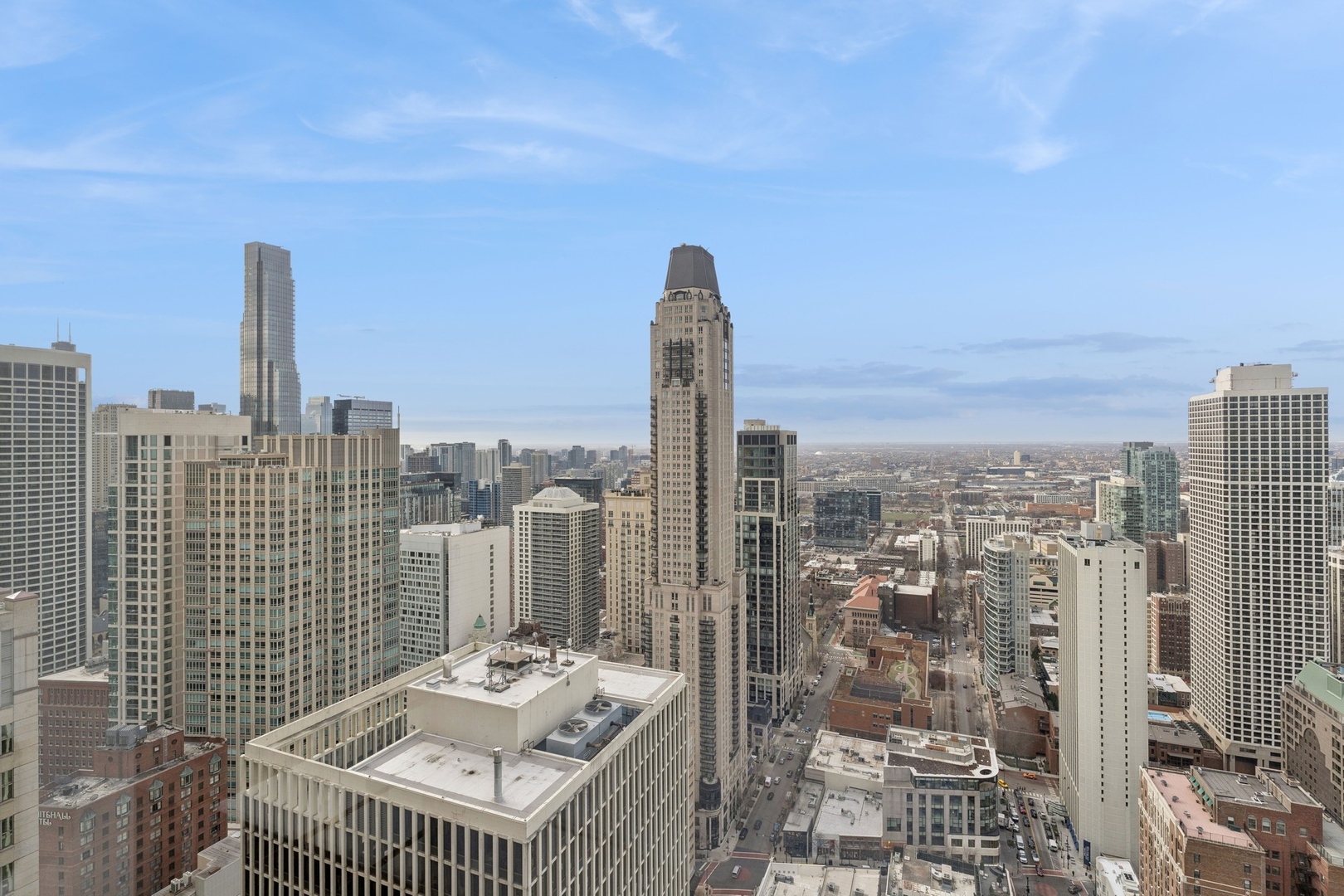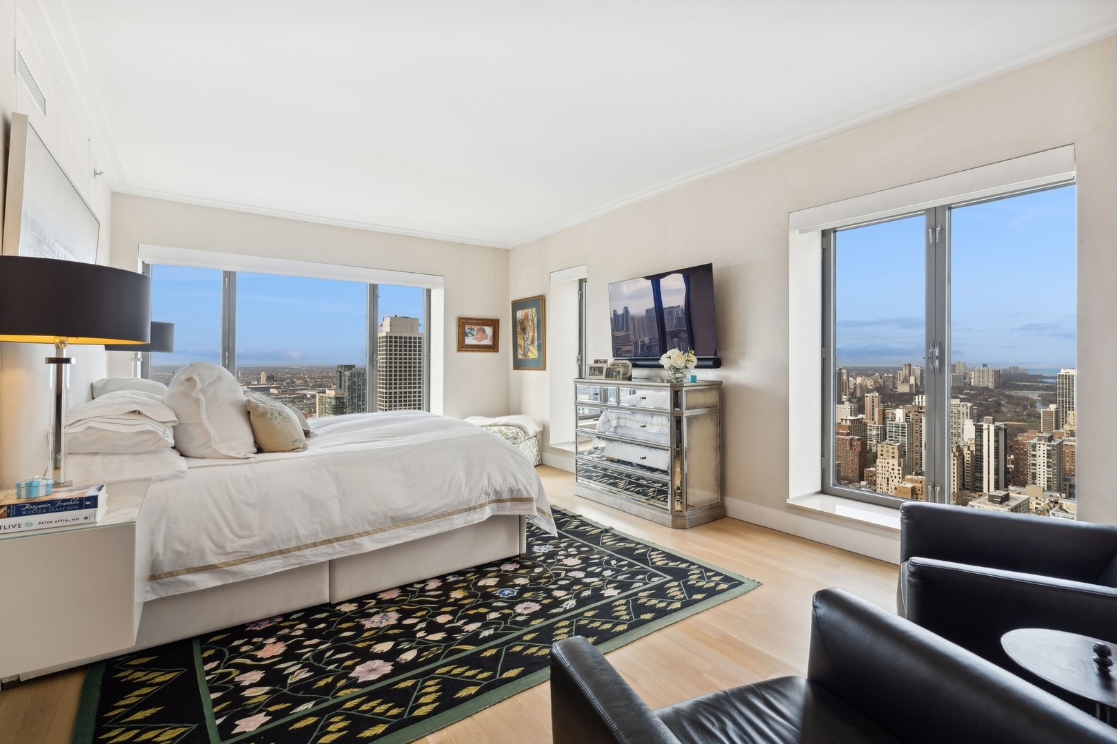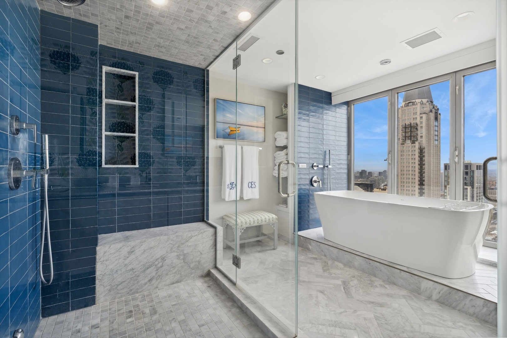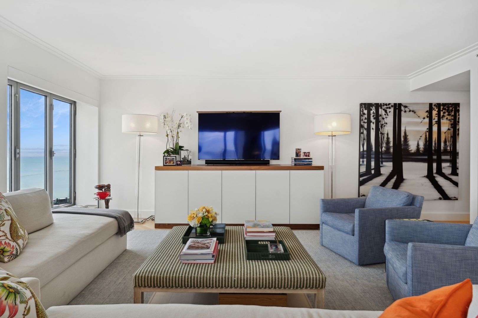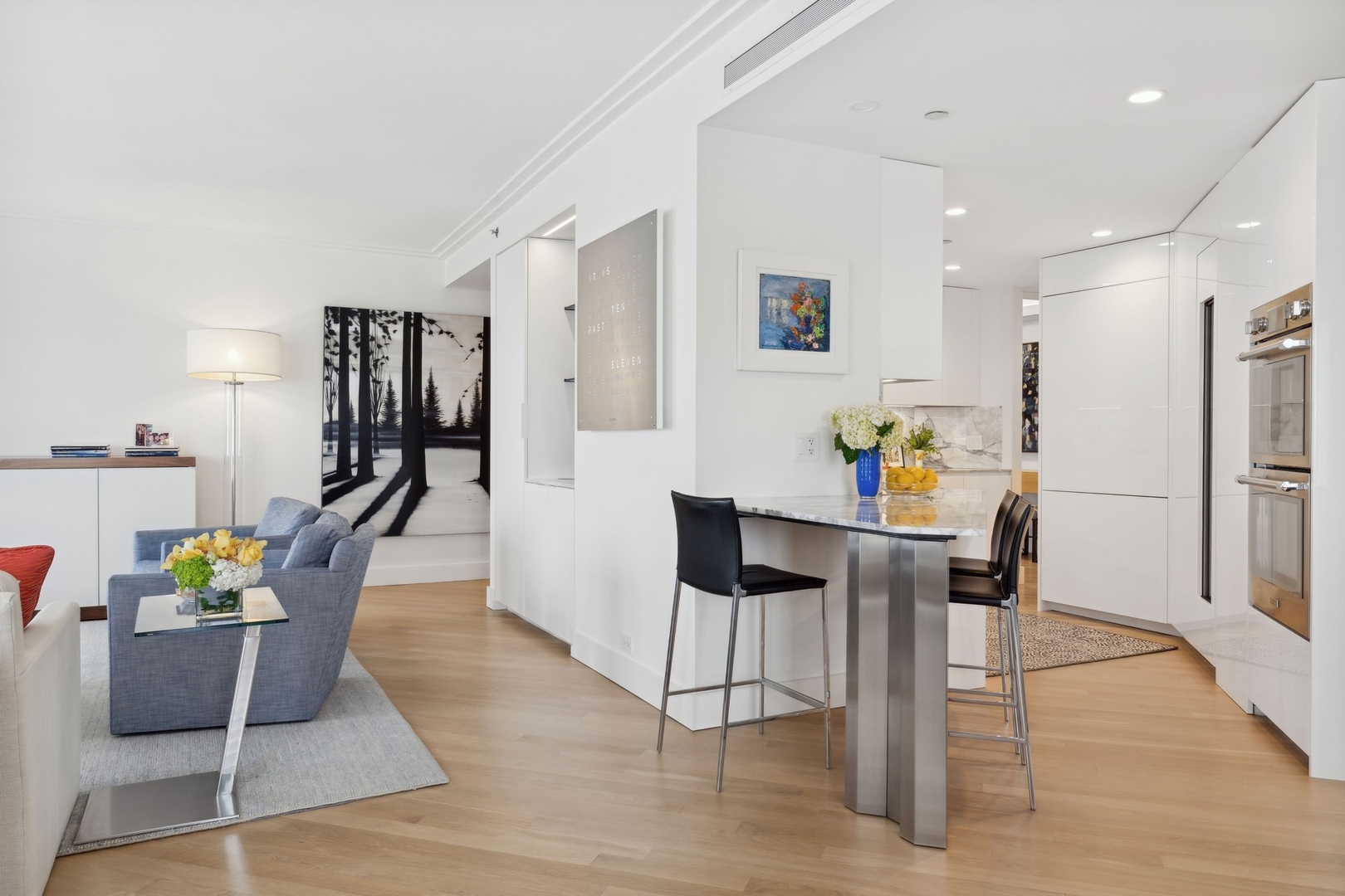 Effortlessly chic and totally turnkey, 950 N. Michigan Ave., unit 4103, is a 2430-square-foot, 3 bed/3.5 bath luxury, lake-facing condo situated inside Chicago’s iconic One Magnificent Mile building. Located at the northernmost tip of the Mag Mile, steps to Oak Street Beach, this striking residential building was designed by acclaimed architect Bruce Graham and offers unparalleled views of the lakefront, Lake Shore Drive, the skyline, and Navy Pier. Unit 4103 has undergone a comprehensive renovation and redesign, including upgraded fixtures and finishes throughout and full rewiring and all new copper pluming. The floor plan begins with a spacious foyer with a built-in console and a decorative, recessed ceiling with ambient LED lighting. A lovely gallery hall links to the open-concept living/dining space, which is flooded with natural light courtesy of oversize windows that frame both lake and city views. The living room features a built-in wet bar with a hammered sink, floating glass shelves, and concealed storage, while the defined dining space stuns with a statement pendant light and a hanging buffet with a brushed glass front, and can easily accommodate seated dinner parties for up to 8-10 guests. The centrally located, all-white chef’s kitchen boasts custom high-gloss lacquer cabinetry, Italian marble countertops, professional-grade Thermador and Miele appliances including both steam and convection ovens and a wine fridge, and a peninsula-style breakfast counter with a custom stainless steel base that was modeled after the building’s famous architecture. On the opposite side of the floor plan, this home presents two distinctly elegant secondary bedrooms – one that’s ensuite, another that does double duty as a handsome home office with a custom two-person desk, a queen-size Murphy bed, and a gray flannel wallcovering – plus a deluxe primary suite. The primary bedroom is large and bright, and features more stunning views, a gorgeous suede wallcovering by Phillip Jeffries, a custom walk-in closet (14′ x 8′), and a spectacular spa bath with a dual vanity with honed Carrara marble countertops, Robern electric mirror/cabinets, a standalone tub that fills from the ceiling, and a steam shower. Additional callout details include new white oak hardwood floors throughout, a polished powder room with a Thibaut wallcovering, heated bathrooms floors by Nuheat in all full baths, zoned heating with Mysa internet-connect thermostats, electric light-passing in all rooms and additional blackout shades in all of the bedrooms, and an in-unit laundry room with bonus storage. First-class building amenities include a 24-hour door staff, a rooftop deck, an indoor pool with lap lanes, a spa, and a fitness center. Steps to world-class shopping, dining and culture, including the 900 North Michigan Shops and Equinox fitness club, 950 N. Michigan Ave., unit 4103, is high-style living in the Gold Coast. (950 N. Michigan Ave. is a pet-friendly building with indoor garage parking available.)