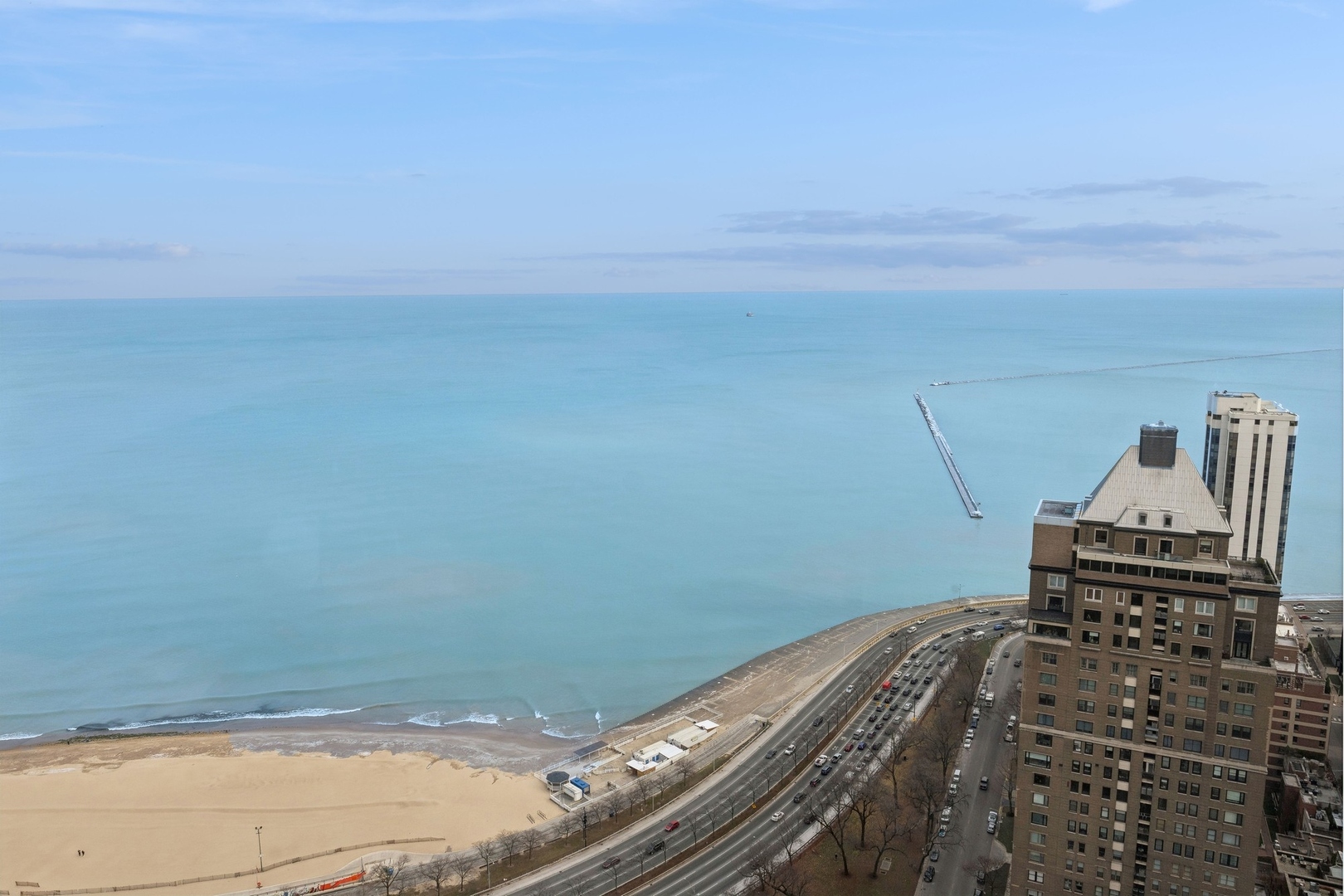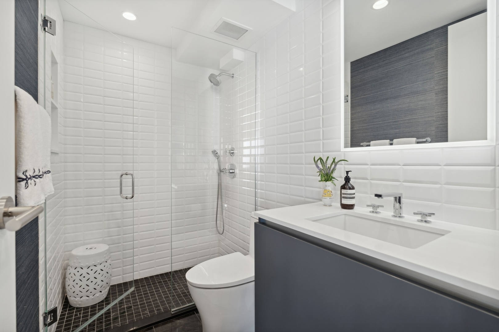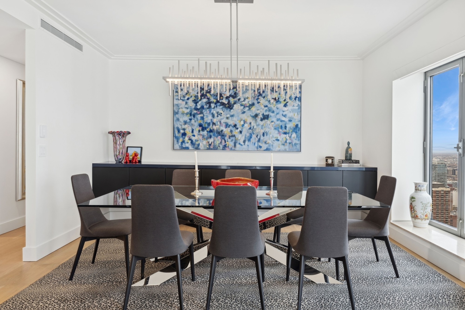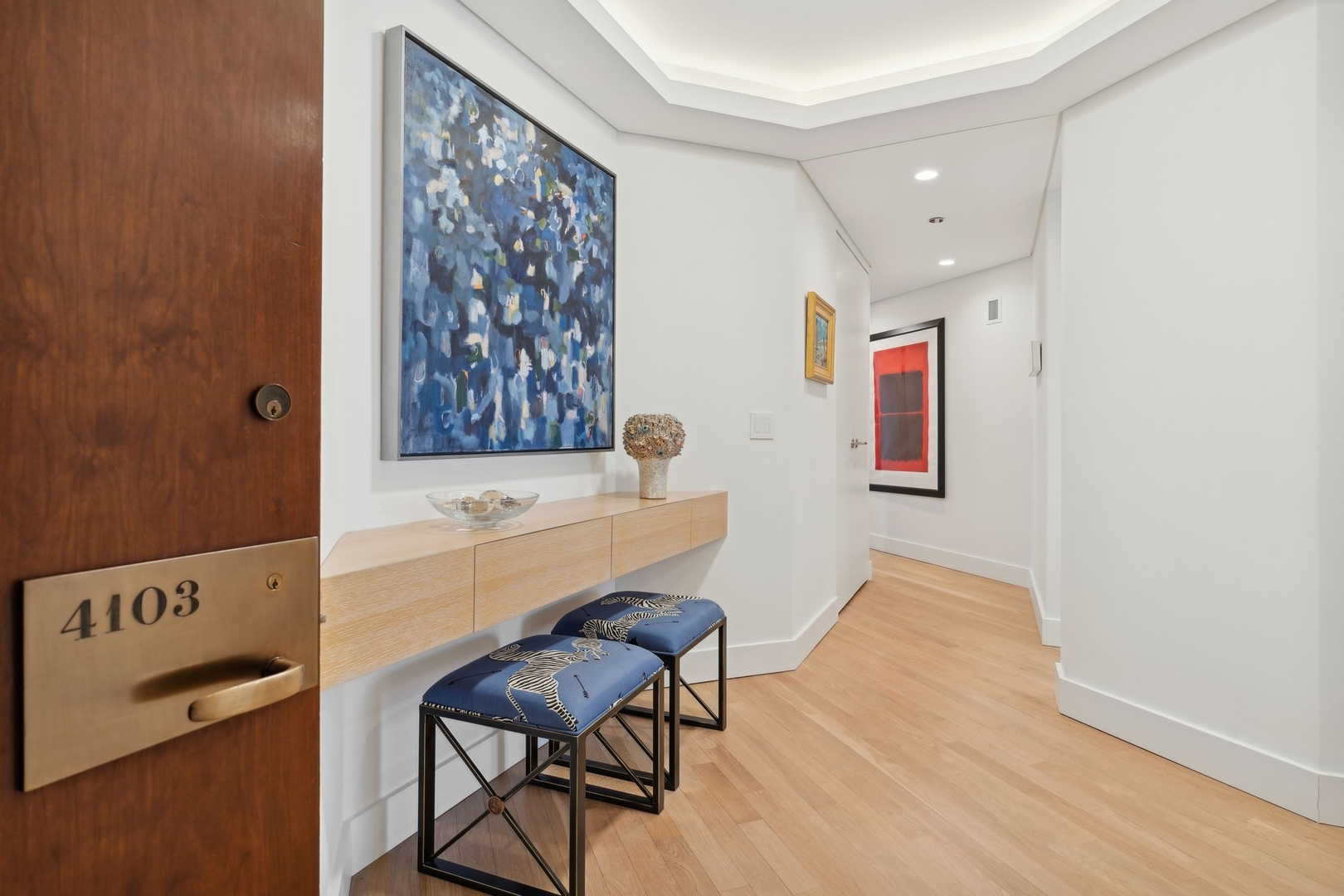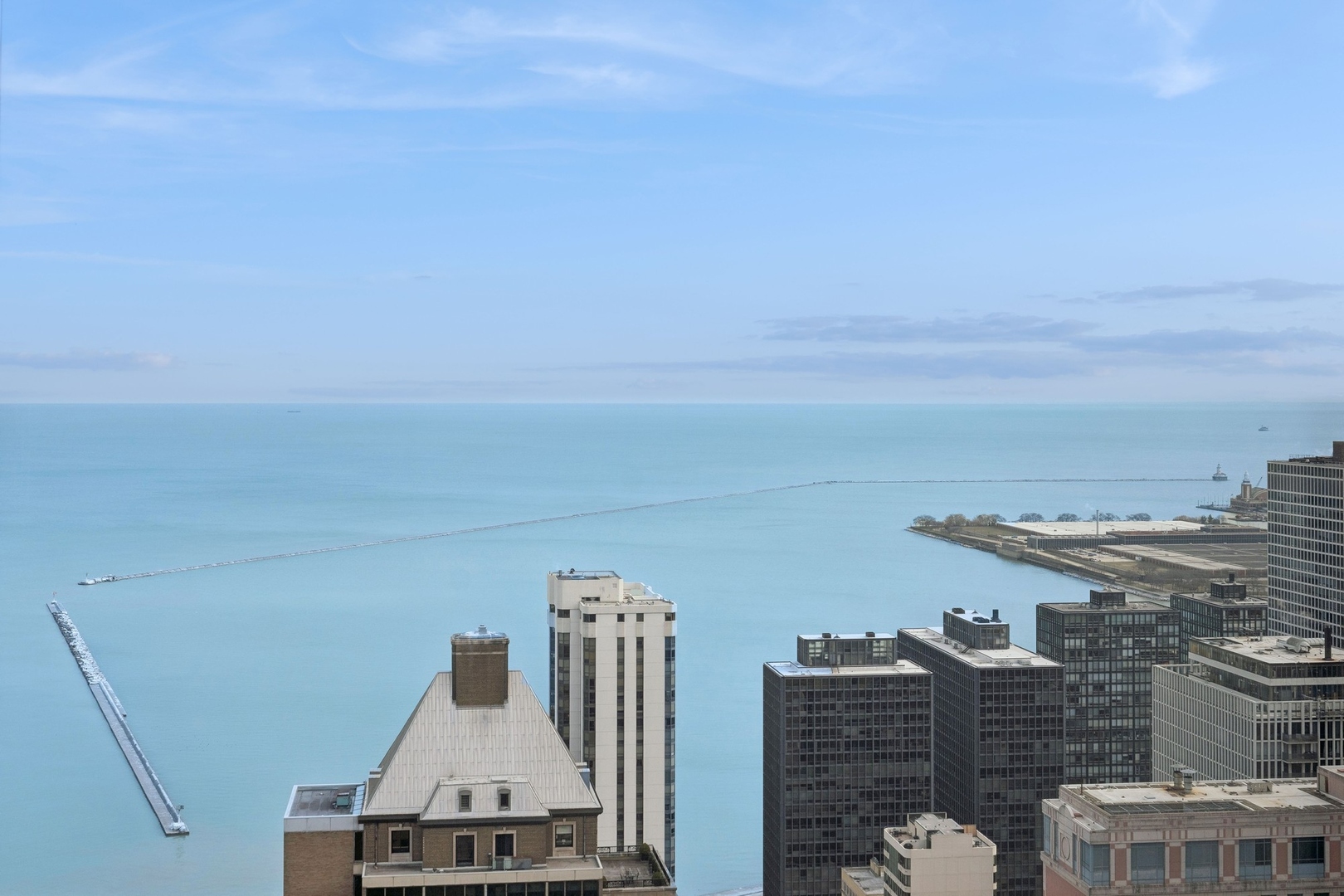 Effortlessly chic and totally turnkey, 950 N. Michigan Ave., unit 4103, is a 2430-square-foot, 3 bed/3.5 bath luxury, lake-facing condo situated inside Chicago’s iconic One Magnificent Mile building. Located at the northernmost tip of the Mag Mile, steps to Oak Street Beach, this striking residential building was designed by acclaimed architect Bruce Graham and offers unparalleled views of the lakefront, Lake Shore Drive, the skyline, and Navy Pier. Unit 4103 has undergone a comprehensive renovation and redesign, including upgraded fixtures and finishes throughout and full rewiring and all new copper pluming. The floor plan begins with a spacious foyer with a built-in console and a decorative, recessed ceiling with ambient LED lighting. A lovely gallery hall links to the open-concept living/dining space, which is flooded with natural light courtesy of oversize windows that frame both lake and city views. The living room features a built-in wet bar with a hammered sink, floating glass shelves, and concealed storage, while the defined dining space stuns with a statement pendant light and a hanging buffet with a brushed glass front, and can easily accommodate seated dinner parties for up to 8-10 guests. The centrally located, all-white chef’s kitchen boasts custom high-gloss lacquer cabinetry, Italian marble countertops, professional-grade Thermador and Miele appliances including both steam and convection ovens and a wine fridge, and a peninsula-style breakfast counter with a custom stainless steel base that was modeled after the building’s famous architecture. On the opposite side of the floor plan, this home presents two distinctly elegant secondary bedrooms – one that’s ensuite, another that does double duty as a handsome home office with a custom two-person desk, a queen-size Murphy bed, and a gray flannel wallcovering – plus a deluxe primary suite. The primary bedroom is large and bright, and features more stunning views, a gorgeous suede wallcovering by Phillip Jeffries, a custom walk-in closet (14′ x 8′), and a spectacular spa bath with a dual vanity with honed Carrara marble countertops, Robern electric mirror/cabinets, a standalone tub that fills from the ceiling, and a steam shower. Additional callout details include new white oak hardwood floors throughout, a polished powder room with a Thibaut wallcovering, heated bathrooms floors by Nuheat in all full baths, zoned heating with Mysa internet-connect thermostats, electric light-passing in all rooms and additional blackout shades in all of the bedrooms, and an in-unit laundry room with bonus storage. First-class building amenities include a 24-hour door staff, a rooftop deck, an indoor pool with lap lanes, a spa, and a fitness center. Steps to world-class shopping, dining and culture, including the 900 North Michigan Shops and Equinox fitness club, 950 N. Michigan Ave., unit 4103, is high-style living in the Gold Coast. (950 N. Michigan Ave. is a pet-friendly building with indoor garage parking available.)