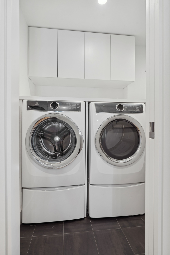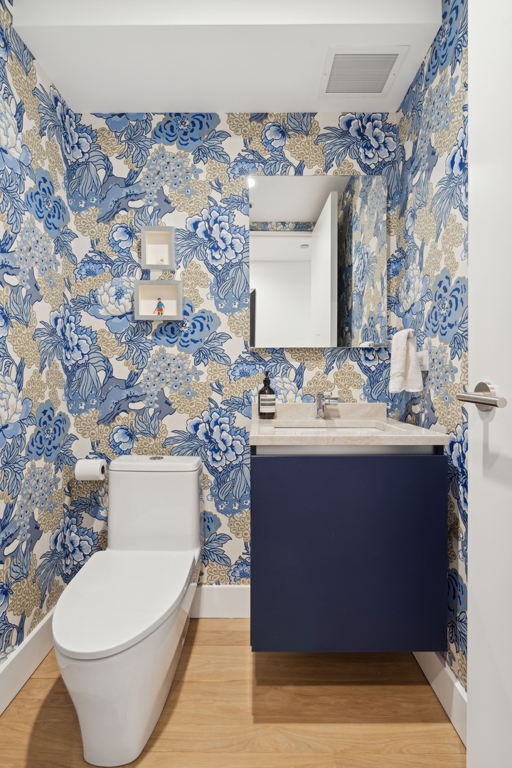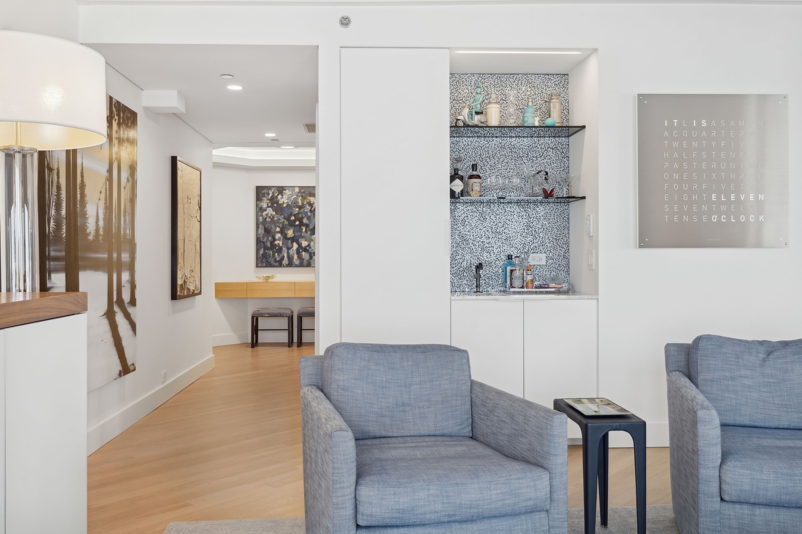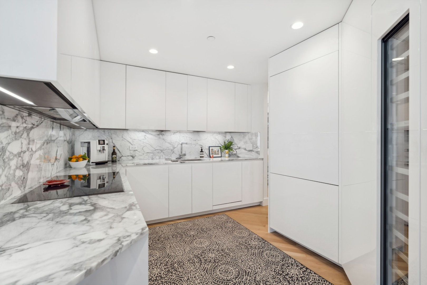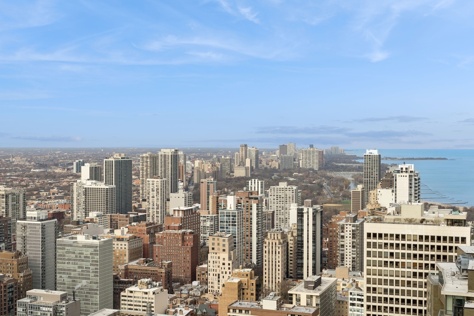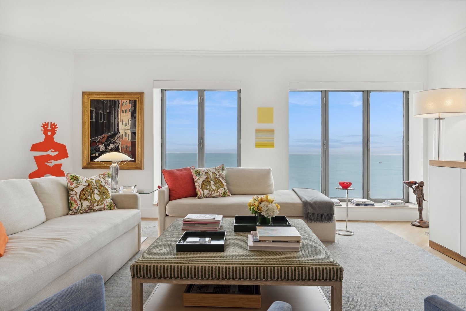Effortlessly chic and totally turnkey, 950 N. Michigan Ave., unit 4103, is a 2430-square-foot, 3 bed/3.5 bath luxury, lake-facing condo situated inside Chicago’s iconic One Magnificent Mile building. Located at the northernmost tip of the Mag Mile, steps to Oak Street Beach, this striking residential building was designed by acclaimed architect Bruce Graham and offers unparalleled views of the lakefront, Lake Shore Drive, the skyline, and Navy Pier. Unit 4103 has undergone a comprehensive renovation and redesign, including upgraded fixtures and finishes throughout and full rewiring and all new copper pluming. The floor plan begins with a spacious foyer with a built-in console and a decorative, recessed ceiling with ambient LED lighting. A lovely gallery hall links to the open-concept living/dining space, which is flooded with natural light courtesy of oversize windows that frame both lake and city views. The living room features a built-in wet bar with a hammered sink, floating glass shelves, and concealed storage, while the defined dining space stuns with a statement pendant light and a hanging buffet with a brushed glass front, and can easily accommodate seated dinner parties for up to 8-10 guests. The centrally located, all-white chef’s kitchen boasts custom high-gloss lacquer cabinetry, Italian marble countertops, professional-grade Thermador and Miele appliances including both steam and convection ovens and a wine fridge, and a peninsula-style breakfast counter with a custom stainless steel base that was modeled after the building’s famous architecture. On the opposite side of the floor plan, this home presents two distinctly elegant secondary bedrooms – one that’s ensuite, another that does double duty as a handsome home office with a custom two-person desk, a queen-size Murphy bed, and a gray flannel wallcovering – plus a deluxe primary suite. The primary bedroom is large and bright, and features more stunning views, a gorgeous suede wallcovering by Phillip Jeffries, a custom walk-in closet (14′ x 8′), and a spectacular spa bath with a dual vanity with honed Carrara marble countertops, Robern electric mirror/cabinets, a standalone tub that fills from the ceiling, and a steam shower. Additional callout details include new white oak hardwood floors throughout, a polished powder room with a Thibaut wallcovering, heated bathrooms floors by Nuheat in all full baths, zoned heating with Mysa internet-connect thermostats, electric light-passing in all rooms and additional blackout shades in all of the bedrooms, and an in-unit laundry room with bonus storage. First-class building amenities include a 24-hour door staff, a rooftop deck, an indoor pool with lap lanes, a spa, and a fitness center. Steps to world-class shopping, dining and culture, including the 900 North Michigan Shops and Equinox fitness club, 950 N. Michigan Ave., unit 4103, is high-style living in the Gold Coast. (950 N. Michigan Ave. is a pet-friendly building with indoor garage parking available.)