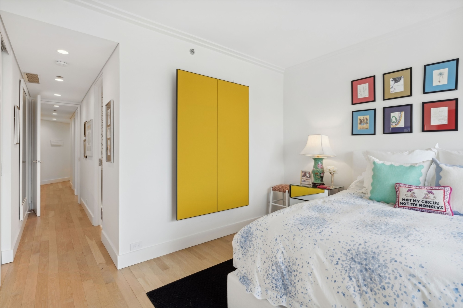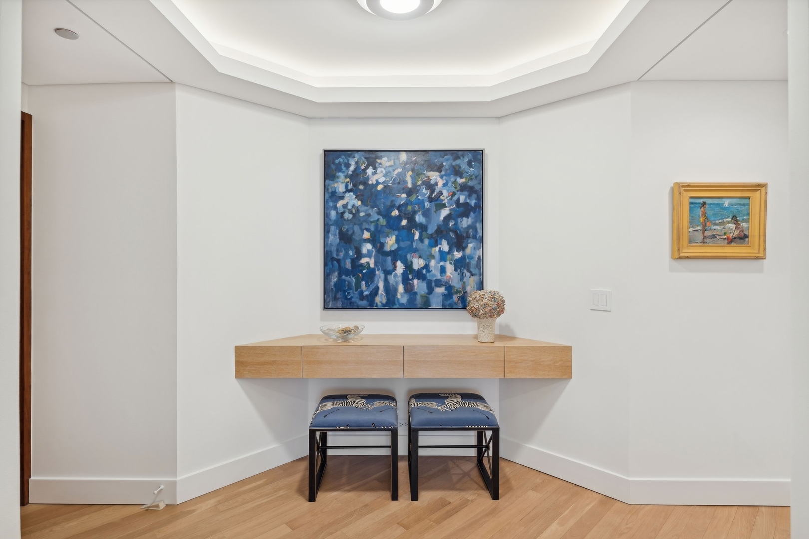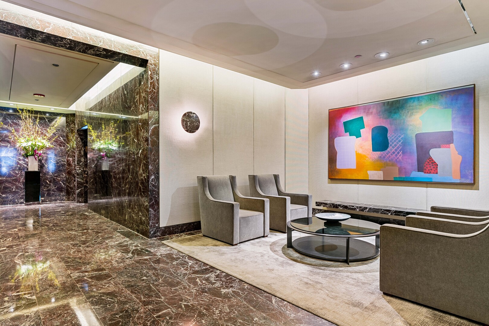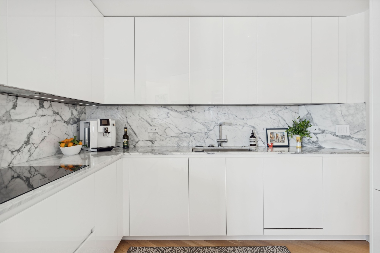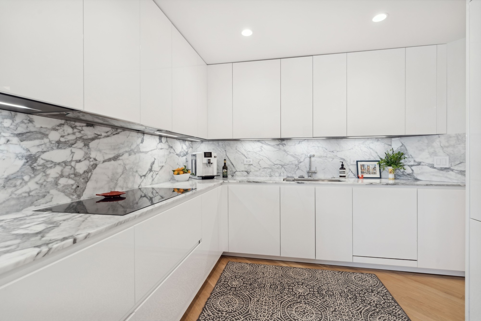 Effortlessly chic and totally turnkey, 950 N. Michigan Ave., unit 4103, is a 2430-square-foot, 3 bed/3.5 bath luxury, lake-facing condo situated inside Chicago’s iconic One Magnificent Mile building. Located at the northernmost tip of the Mag Mile, steps to Oak Street Beach, this striking residential building was designed by acclaimed architect Bruce Graham and offers unparalleled views of the lakefront, Lake Shore Drive, the skyline, and Navy Pier. Unit 4103 has undergone a comprehensive renovation and redesign, including upgraded fixtures and finishes throughout and full rewiring and all new copper pluming. The floor plan begins with a spacious foyer with a built-in console and a decorative, recessed ceiling with ambient LED lighting. A lovely gallery hall links to the open-concept living/dining space, which is flooded with natural light courtesy of oversize windows that frame both lake and city views. The living room features a built-in wet bar with a hammered sink, floating glass shelves, and concealed storage, while the defined dining space stuns with a statement pendant light and a hanging buffet with a brushed glass front, and can easily accommodate seated dinner parties for up to 8-10 guests. The centrally located, all-white chef’s kitchen boasts custom high-gloss lacquer cabinetry, Italian marble countertops, professional-grade Thermador and Miele appliances including both steam and convection ovens and a wine fridge, and a peninsula-style breakfast counter with a custom stainless steel base that was modeled after the building’s famous architecture. On the opposite side of the floor plan, this home presents two distinctly elegant secondary bedrooms – one that’s ensuite, another that does double duty as a handsome home office with a custom two-person desk, a queen-size Murphy bed, and a gray flannel wallcovering – plus a deluxe primary suite. The primary bedroom is large and bright, and features more stunning views, a gorgeous suede wallcovering by Phillip Jeffries, a custom walk-in closet (14′ x 8′), and a spectacular spa bath with a dual vanity with honed Carrara marble countertops, Robern electric mirror/cabinets, a standalone tub that fills from the ceiling, and a steam shower. Additional callout details include new white oak hardwood floors throughout, a polished powder room with a Thibaut wallcovering, heated bathrooms floors by Nuheat in all full baths, zoned heating with Mysa internet-connect thermostats, electric light-passing in all rooms and additional blackout shades in all of the bedrooms, and an in-unit laundry room with bonus storage. First-class building amenities include a 24-hour door staff, a rooftop deck, an indoor pool with lap lanes, a spa, and a fitness center. Steps to world-class shopping, dining and culture, including the 900 North Michigan Shops and Equinox fitness club, 950 N. Michigan Ave., unit 4103, is high-style living in the Gold Coast. (950 N. Michigan Ave. is a pet-friendly building with indoor garage parking available.)
