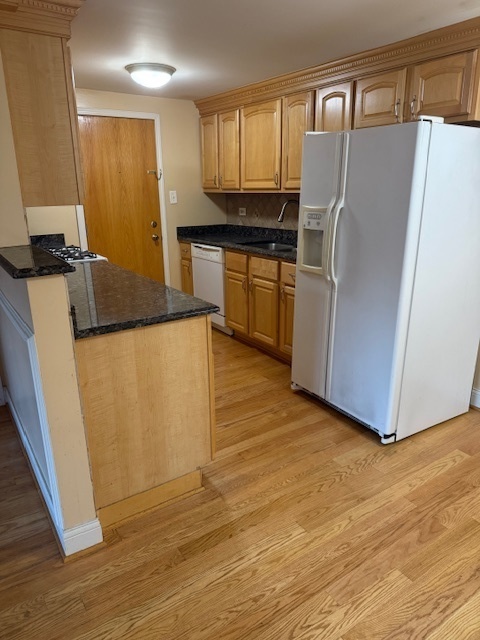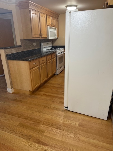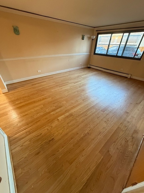 Updated 1 bed, 1 bath first-floor unit featuring a bright, open layout and hardwood floors throughout the main living areas. The kitchen offers table space and flows seamlessly into the living area, while the updated bathroom adds a modern touch. The spacious bedroom includes a large closet for ample storage. New window AC unit in 2023. One exterior parking space and a storage locker are included in the price. Residents enjoy a common laundry room in the building. Conveniently located near Golf Mill, I-294, Beck Lake Dog Park, Busse Woods, shopping, dining, and transportation.