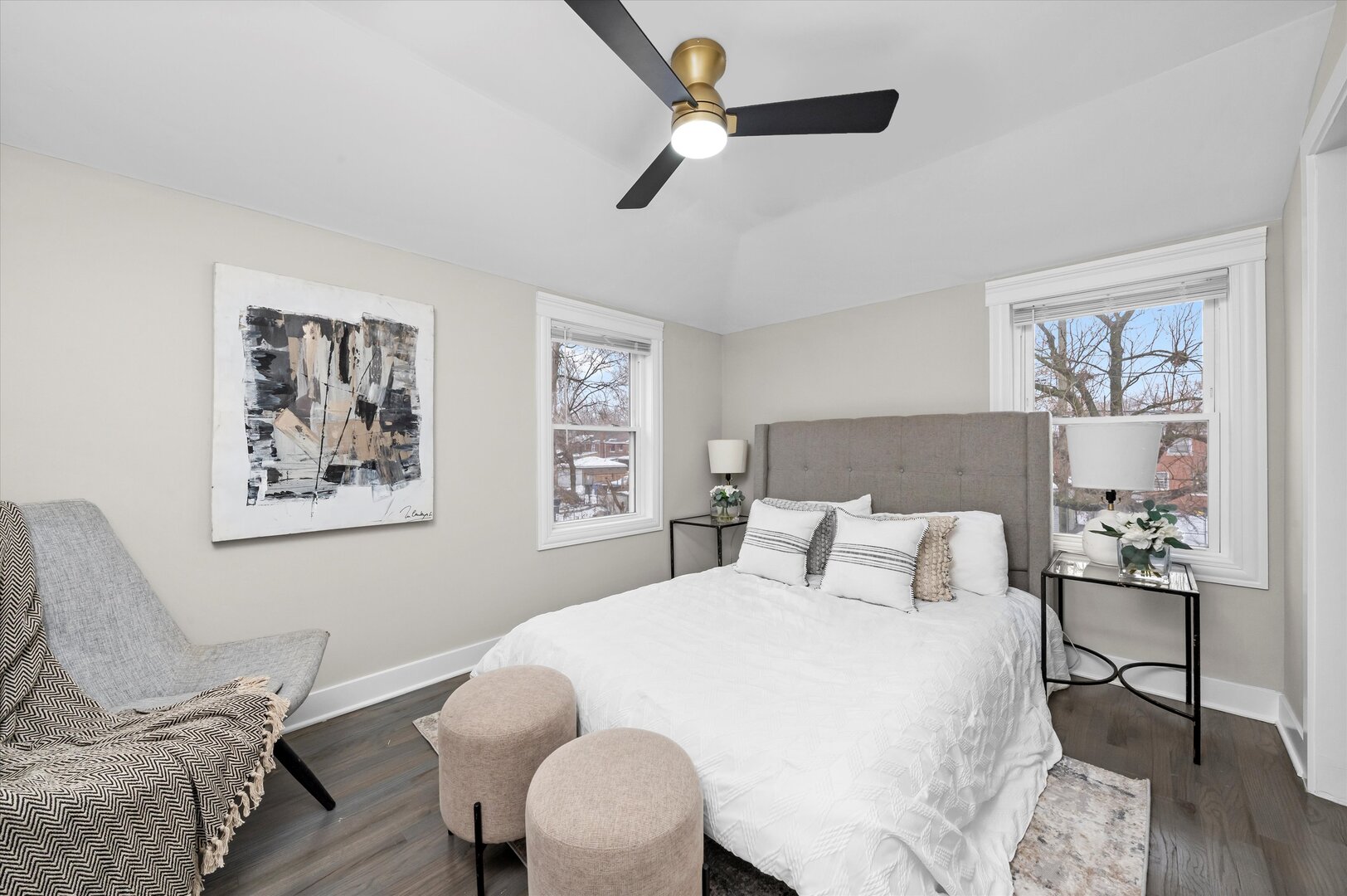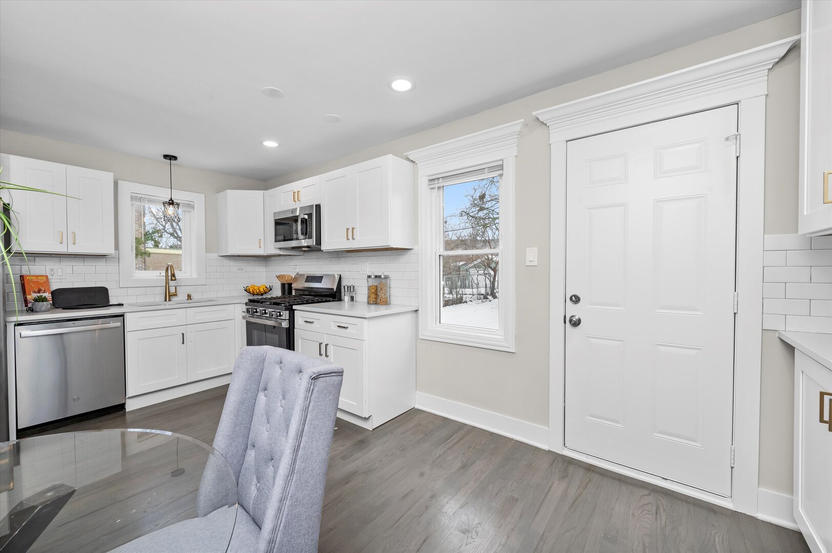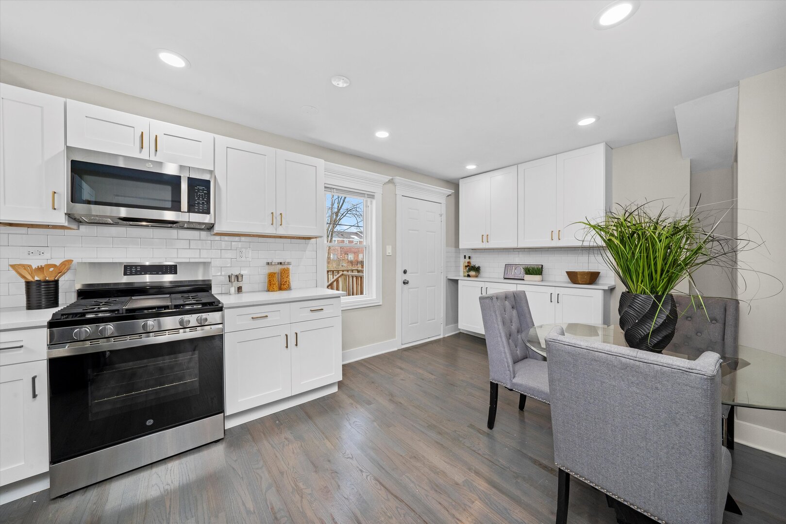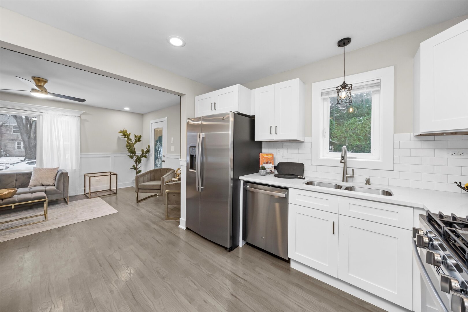 WELCOME TO 9656 CHAPPEL!. Beautiful 2 story rowhouse plus finished basement! WOW! As soon as you enter this beautifully decorated home you will be amazed by the NEW gleaming hardwood floors, big picture window bringing in a ton of natural light, the open space layout combining the living room with the kitchen with modern shaker white cabinetry, quartz countertops and NEW GE stainless steel applianaces. Upstairs you have 2 good size bedrooms and a full bath. The big bedroom with 2 closets. NEW hardwood floors. The bathroom is so nice! with modern tile work and fixtures. The basement will give you a cozy family room and yet another full bath and a finished area for your washer and dryer. New hot water heater. Newly painted in warm neutral colors. Custom window moldings. New lighting fixtures.Recent (aprox 2020) roof and windows/ NEW (2025) concrete driveway and patio in the back. Partially Fenced in yard. Enclosed entryway. Broker owned.