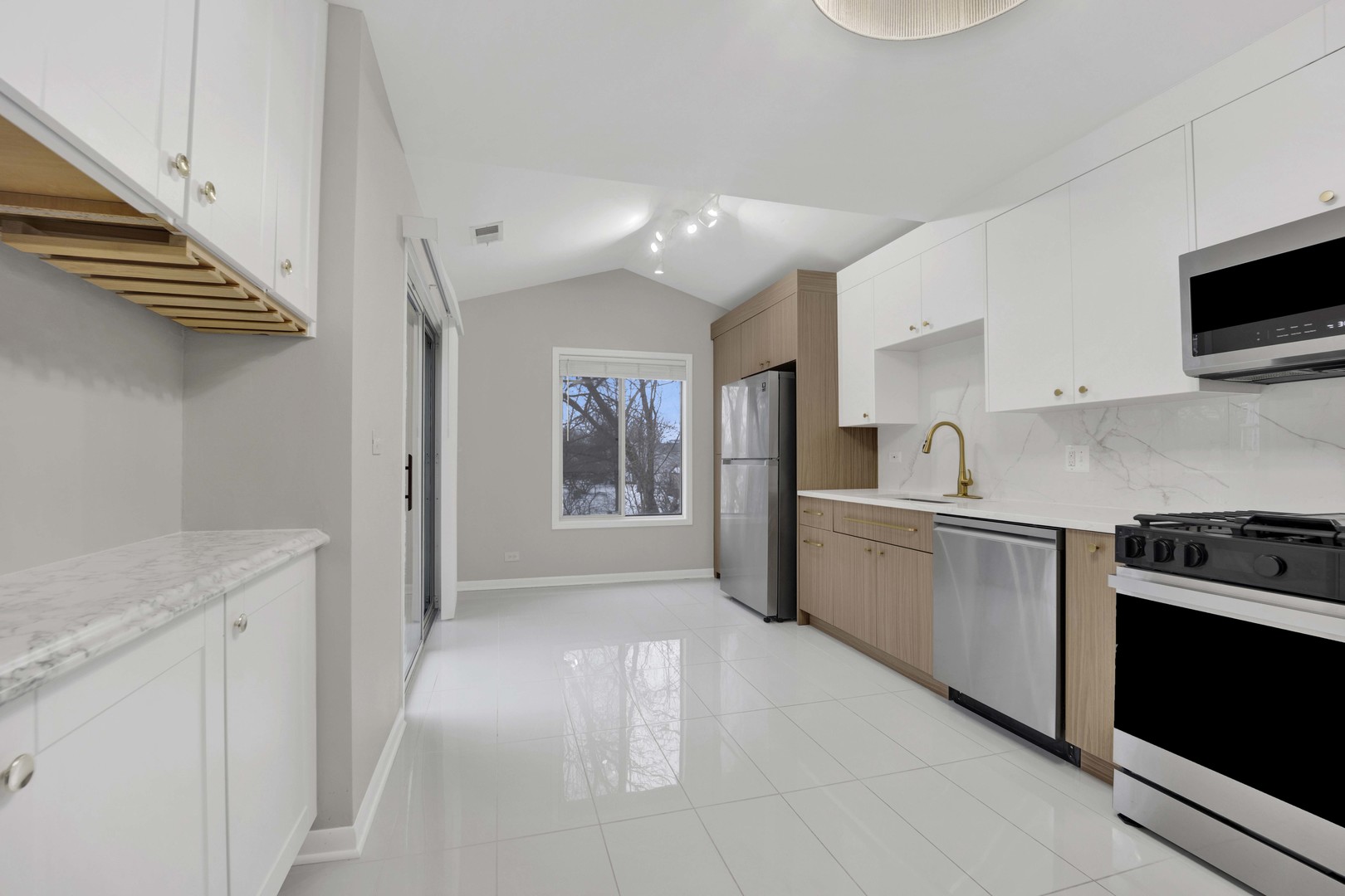 Welcome home to this top-level 2 bedroom, 2 bathroom condo in desirable Winchester Place condominiums, offering a rare sense of privacy thanks to its quiet cul-de-sac location and serene views of a wooded green space and creek. This move-in ready home shines with updates throughout, including a stunning, fully renovated kitchen (2025) featuring Samsung SmartThings stainless steel appliances with smart capabilities, modern cabinetry with gold hardware, quartz countertops, porcelain backsplash, pantry closet, and a dedicated coffee bar. Two sliding glass doors from the kitchen and living room lead to a private balcony overlooking the creek and trees. The inviting interior includes a sleek dining area accented by a botanic feature wall and modern lighting, fresh paint throughout (2026), and luxury laminate flooring in the main living areas (2021). The spacious primary bedroom offers a walk-in closet and an en suite bath with a dual vanity, wainscoting, and new high-end vinyl plank flooring (2026). The second bedroom also features a walk-in closet and convenient access to the hall bathroom. Additional highlights include a laundry room with side-by-side washer/dryer, a functional entry wall tree with storage, and an oversized one-car garage with freezer and attic space ideal for extra storage. Major mechanicals are already updated with the HVAC and water heater just 2 years new. Enjoy an unbeatable location just 10 minutes from downtown Naperville, offering easy access to restaurants, the Riverwalk, Metra train, and shopping, plus steps from the West Branch DuPage River Trail. The well-managed Winchester Place HOA also features a community clubhouse available for private events-Don’t miss the opportunity to call this turnkey condo your home!