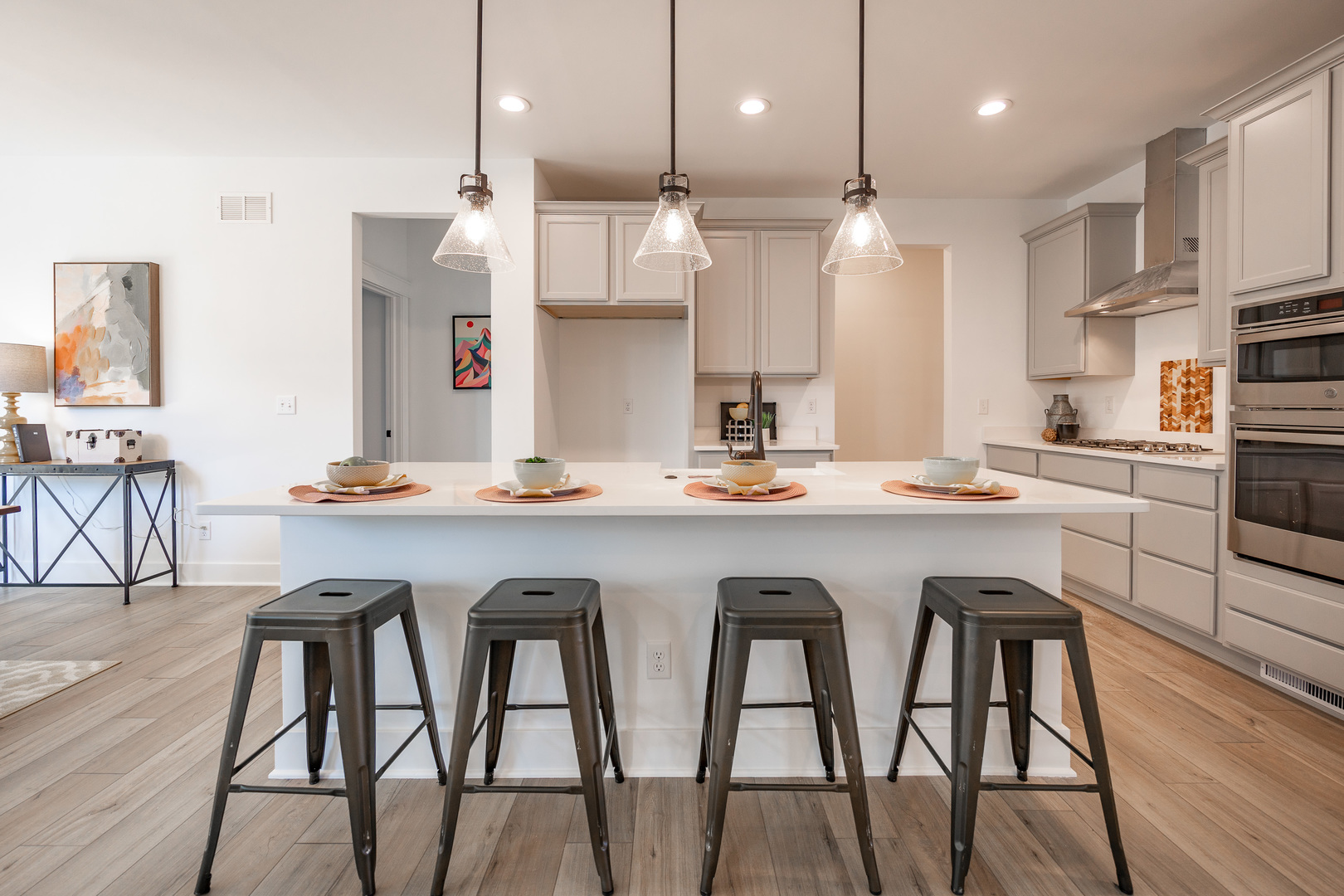 Proposed new construction. The Bettendorf is the open floor plan with a split bedroom layout for the homeowner who wants something uniquely chic. The foyer opens up to a tremendous great room and dining room, accentuated by impressive 13′ tray ceilings. The kitchen overlooks the entire area over an angled island with a breakfast bar reminiscent of a chic metropolitan penthouse. This luxurious kitchen also includes granite countertops and 42″dovetail cabinetry with soft-close drawers and crown molding. For optimum privacy, the two guest bedrooms are separated from the master suite and bathroom, which offer all the indulgences you could want. Homes built with smart home technology from Honeywell, Schlage, and Lutron. Pictures of previously built homes, some with upgrades.